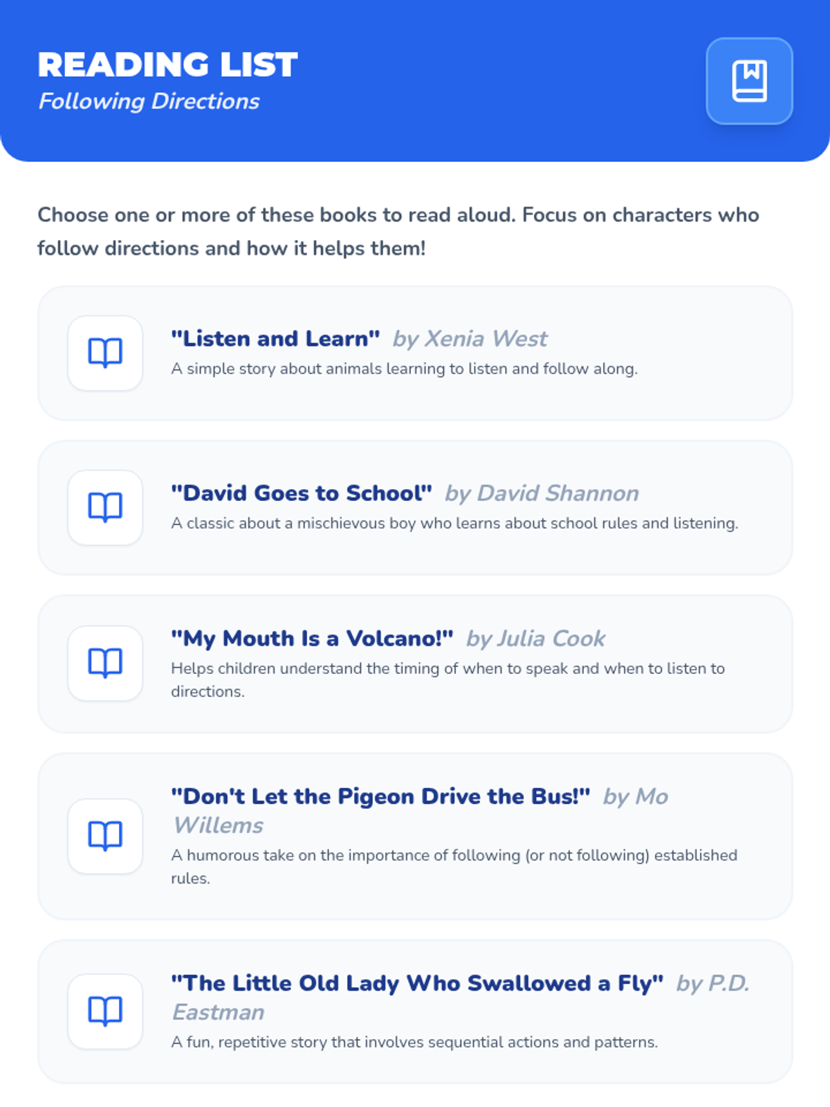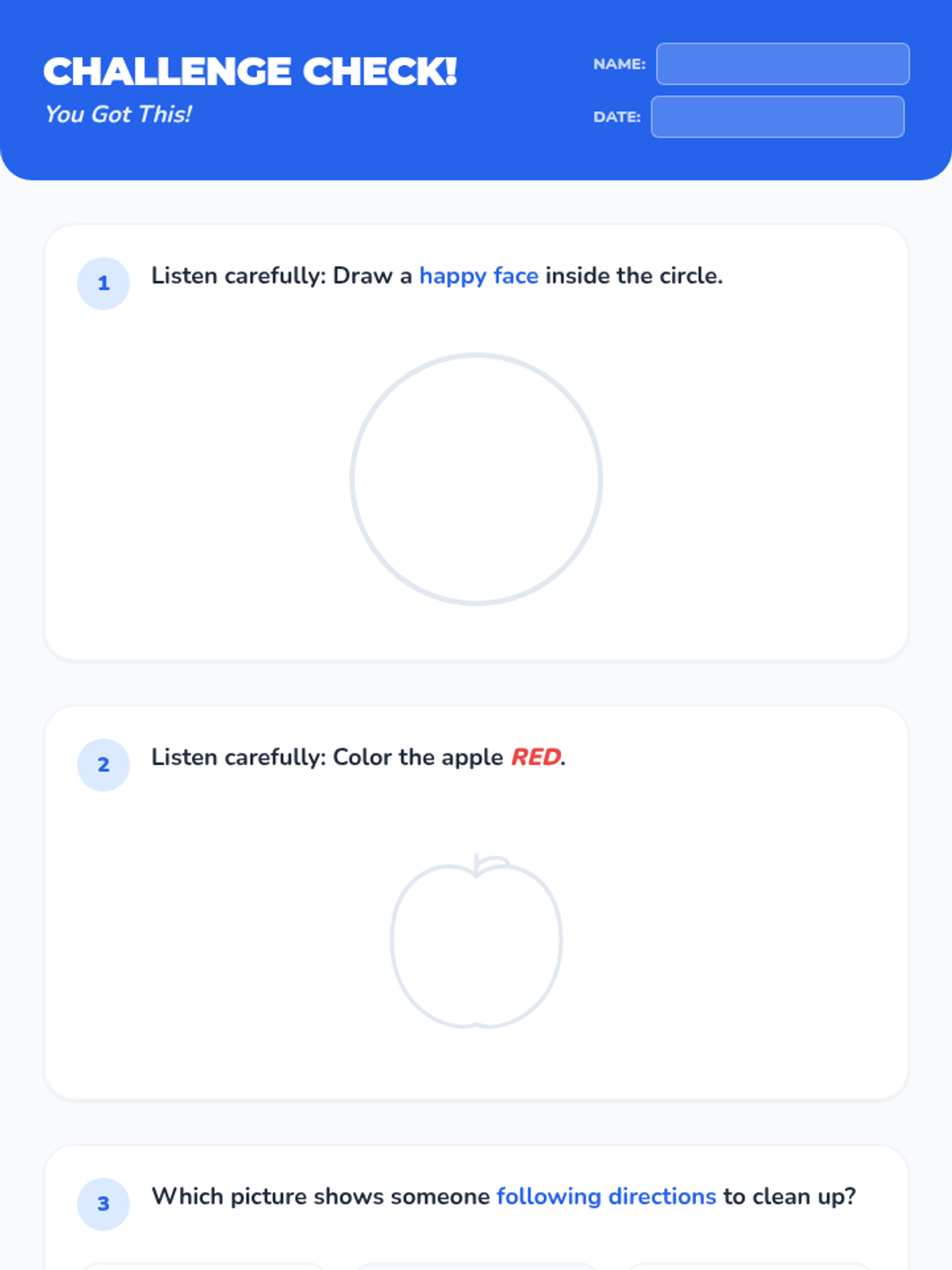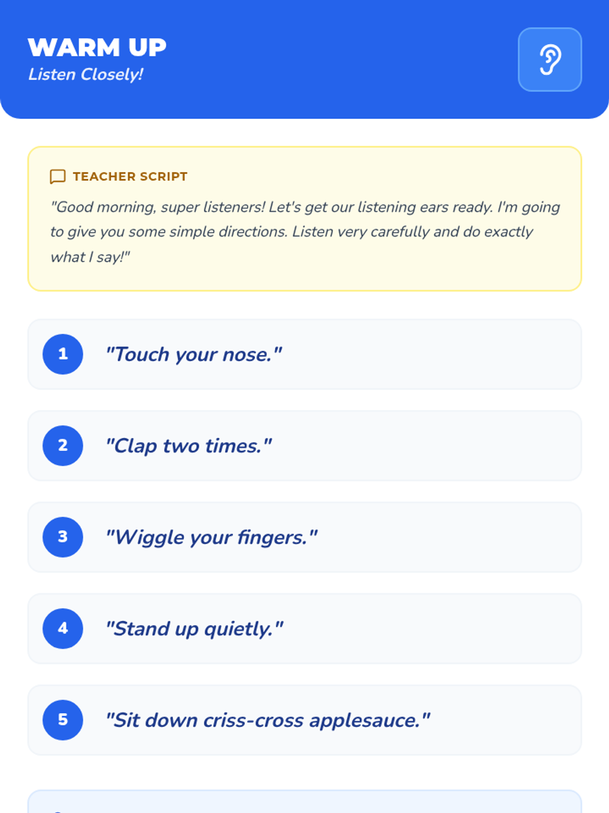 A 30-minute Kindergarten lesson introducing responsibility through the practice of following directions with interactive games, stories, and activities.