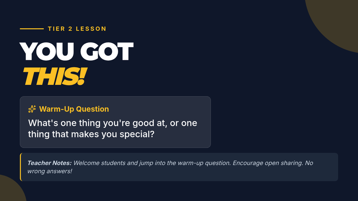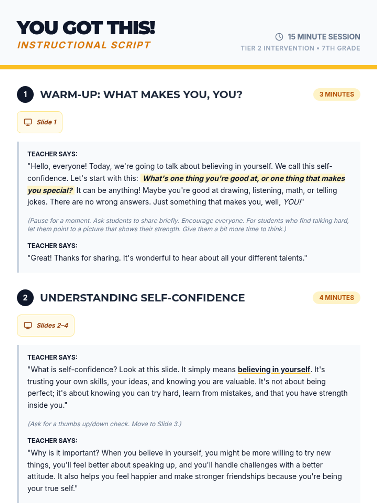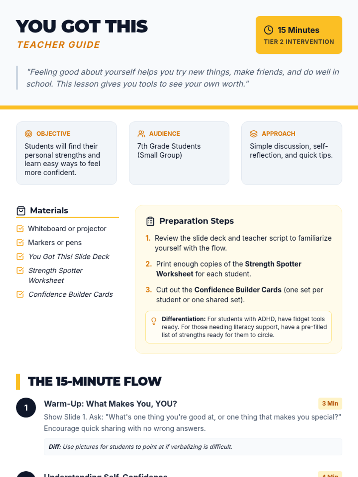 A 15-minute Tier 2 lesson for 7th-grade students focused on identifying personal strengths and developing practical self-confidence strategies through discussion and reflection.