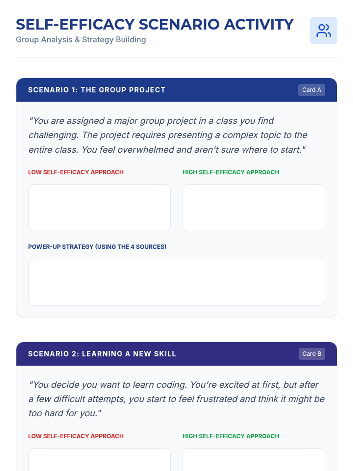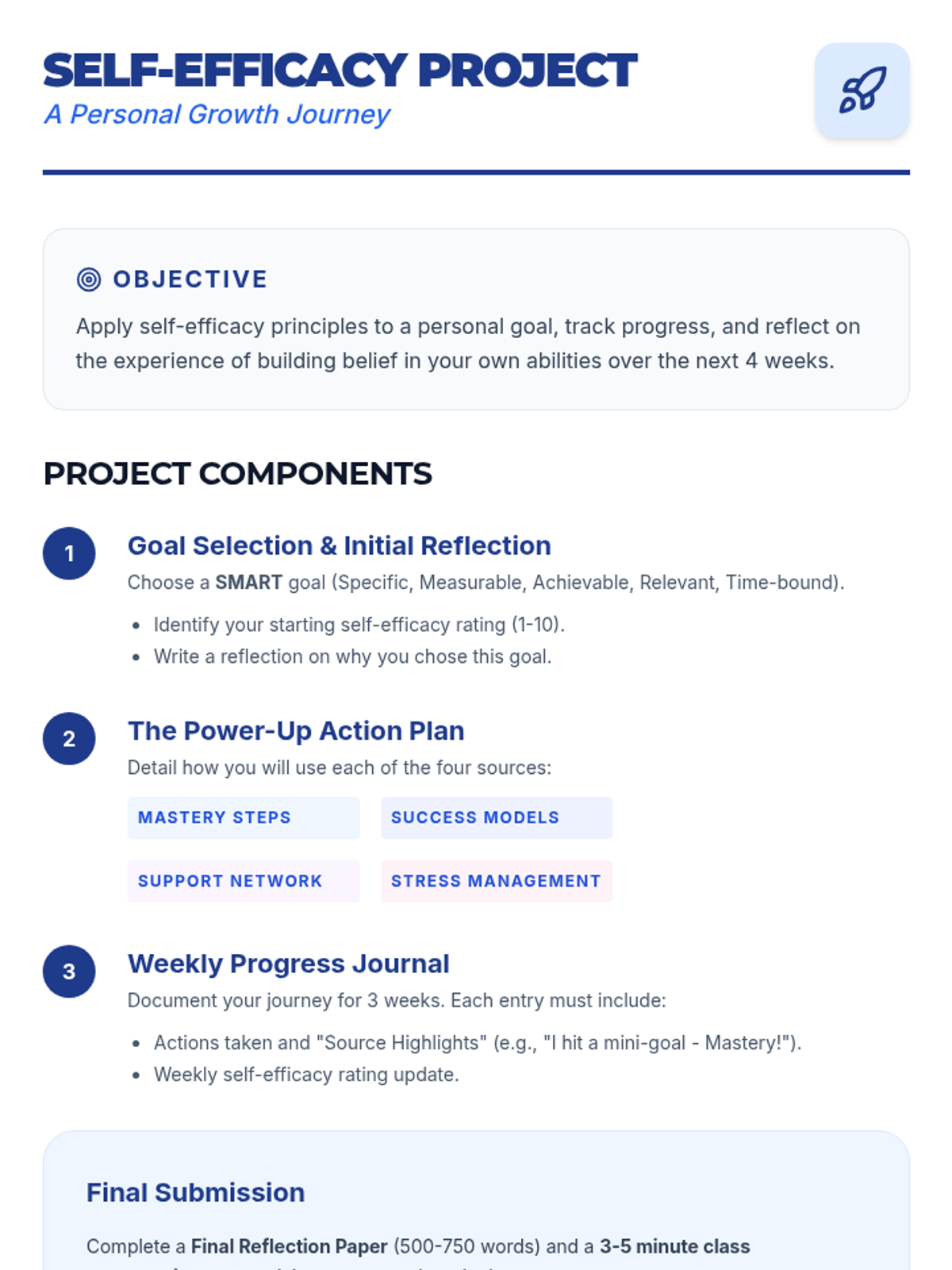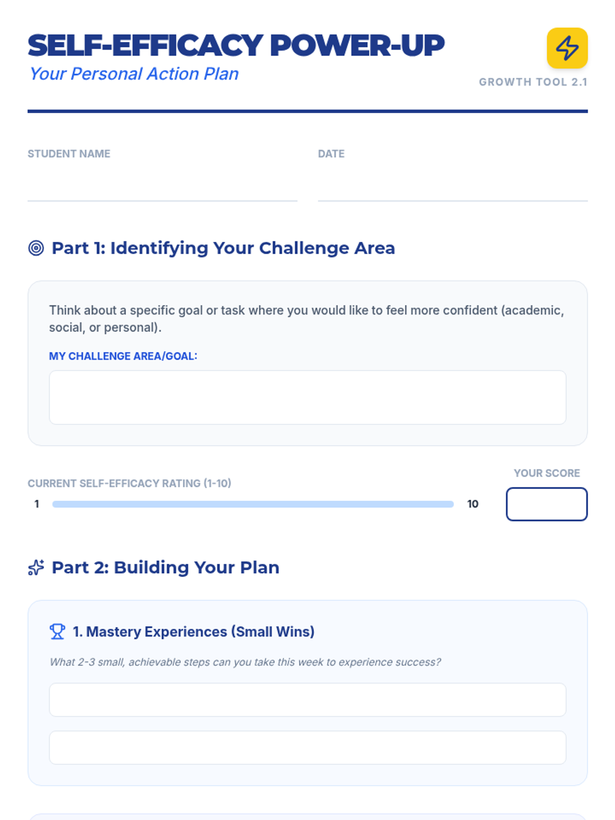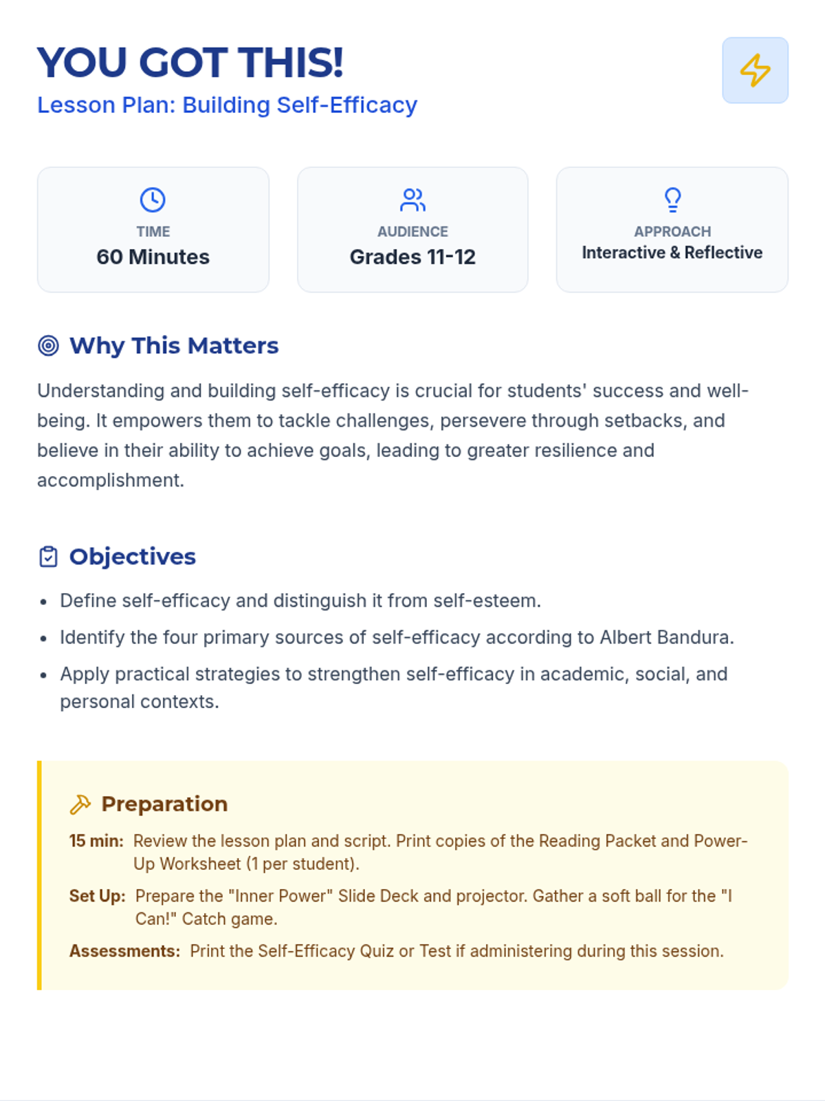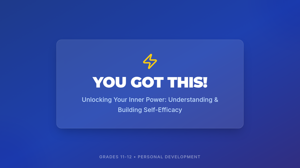 This lesson empowers 11th-12th grade students to understand and develop self-efficacy through interactive discussions, reflective activities, and practical goal-setting. Students will explore the four sources of self-efficacy—Mastery Experiences, Vicarious Experiences, Social Persuasion, and Physiological States—to build resilience and confidence.