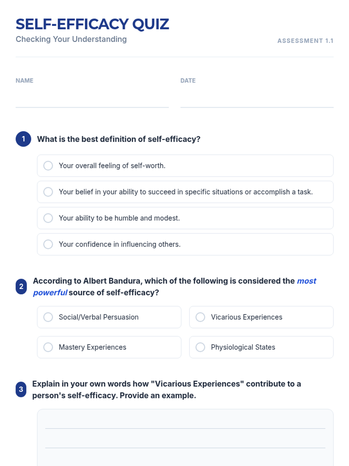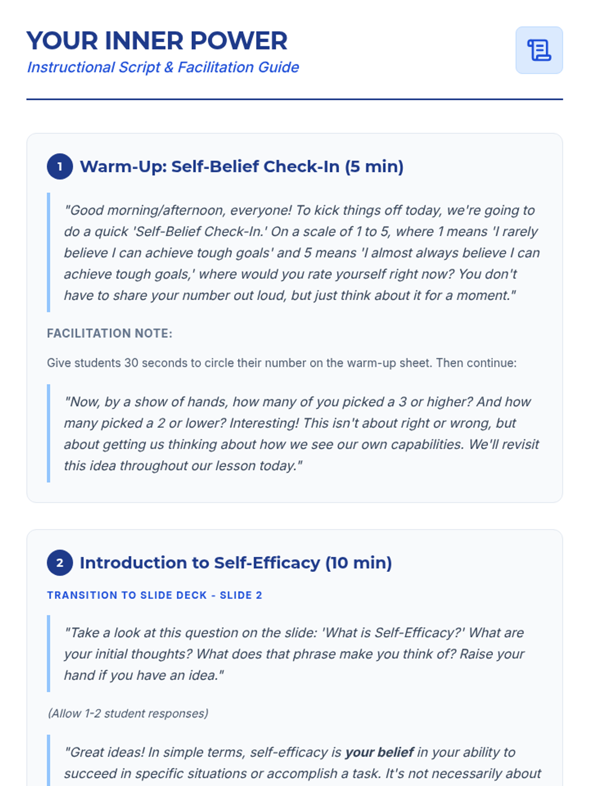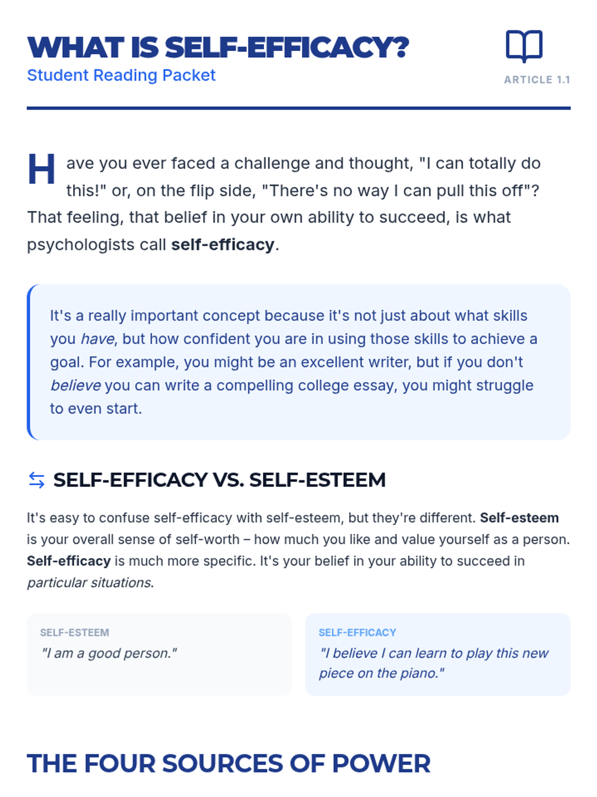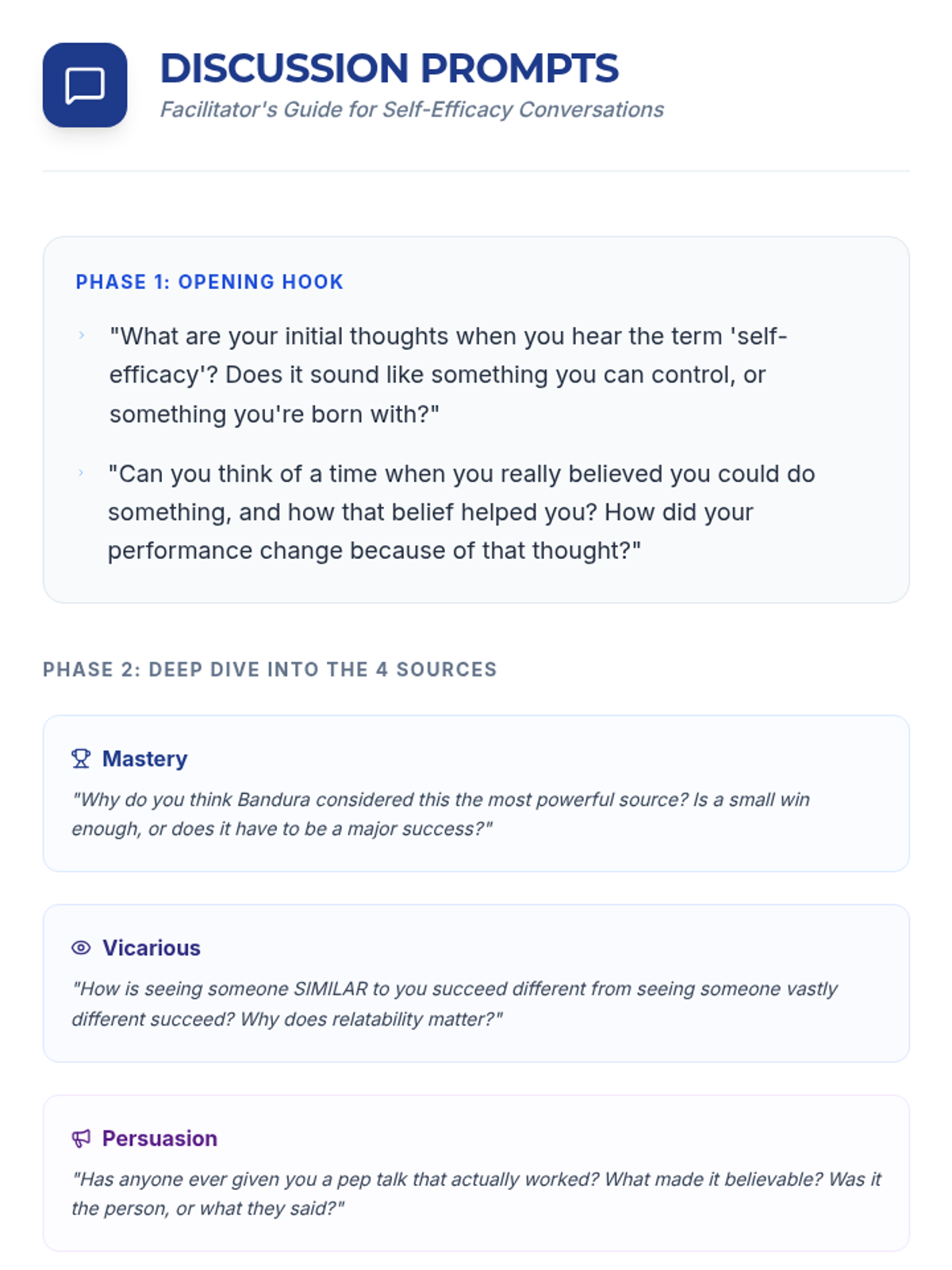 This lesson empowers 11th-12th grade students to understand and develop self-efficacy through interactive discussions, reflective activities, and practical goal-setting. Students will explore the four sources of self-efficacy—Mastery Experiences, Vicarious Experiences, Social Persuasion, and Physiological States—to build resilience and confidence.