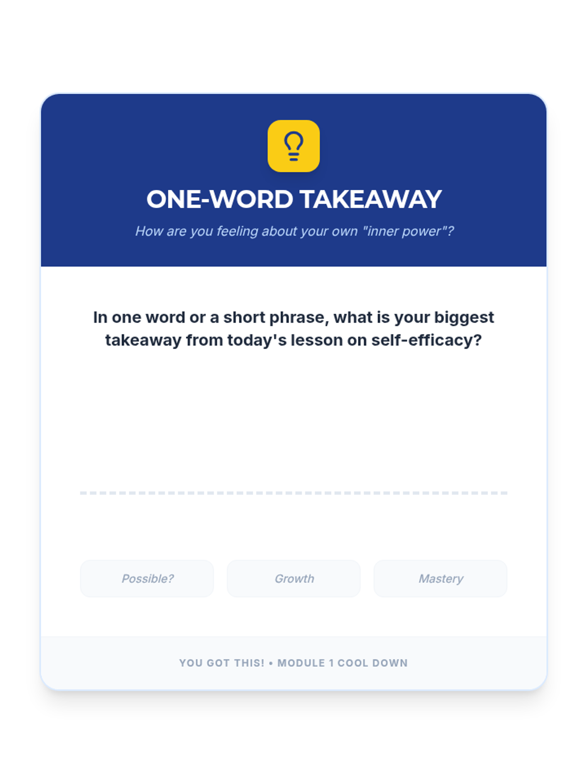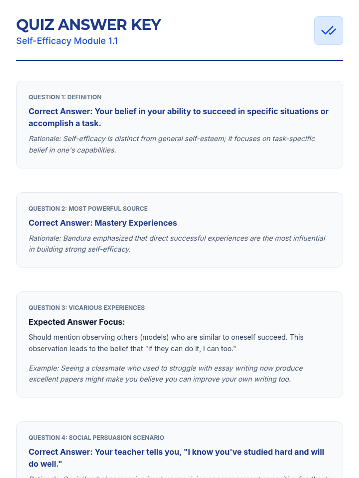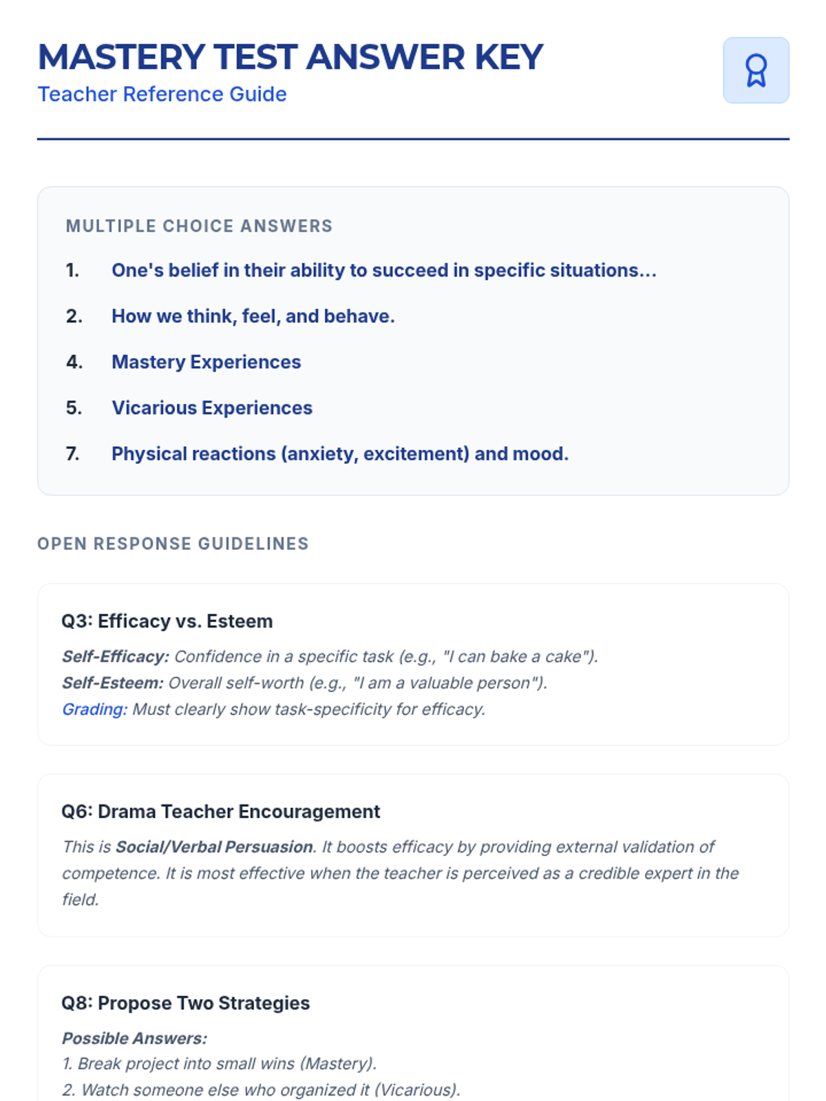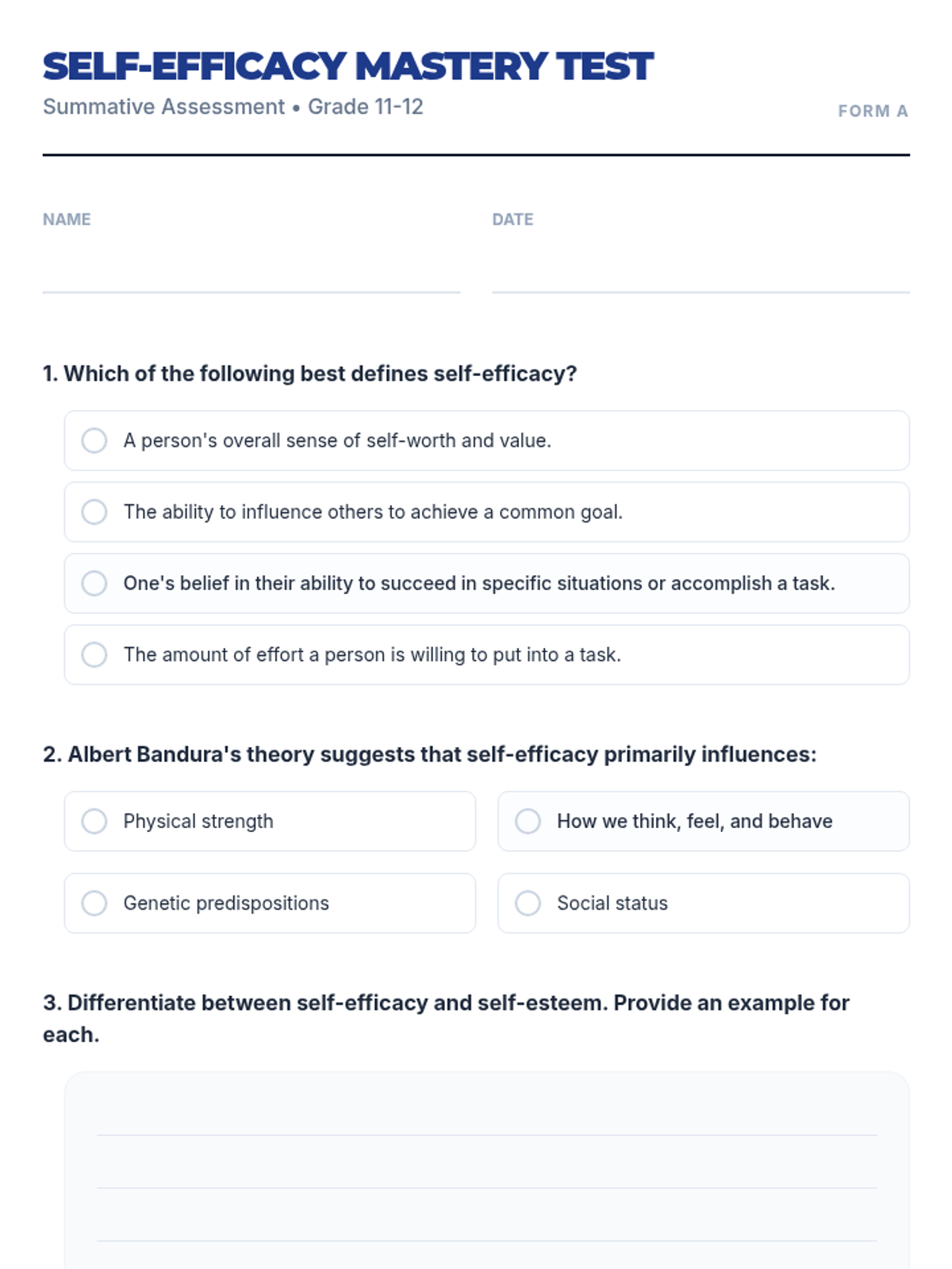 This lesson empowers 11th-12th grade students to understand and develop self-efficacy through interactive discussions, reflective activities, and practical goal-setting. Students will explore the four sources of self-efficacy—Mastery Experiences, Vicarious Experiences, Social Persuasion, and Physiological States—to build resilience and confidence.