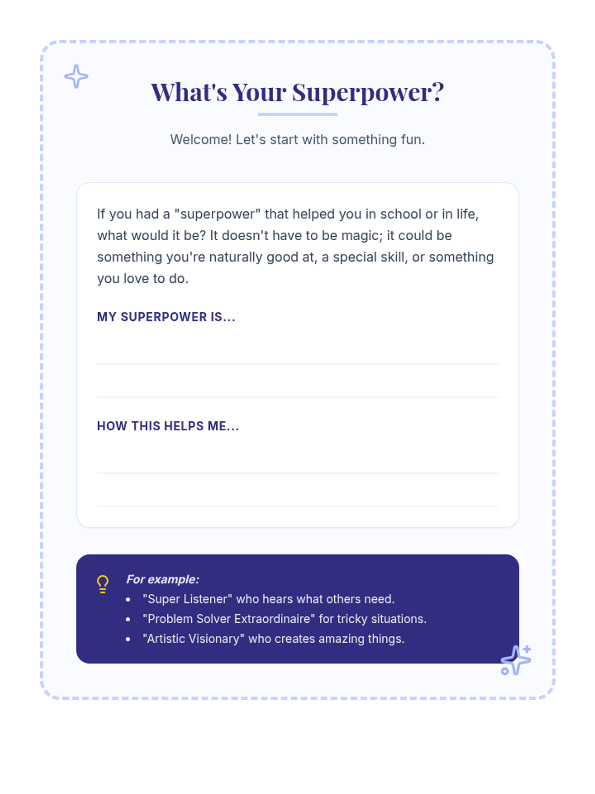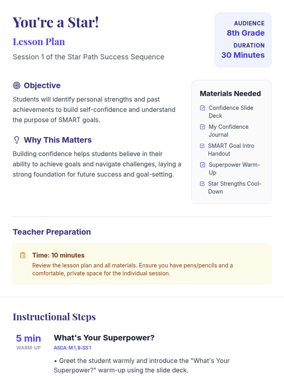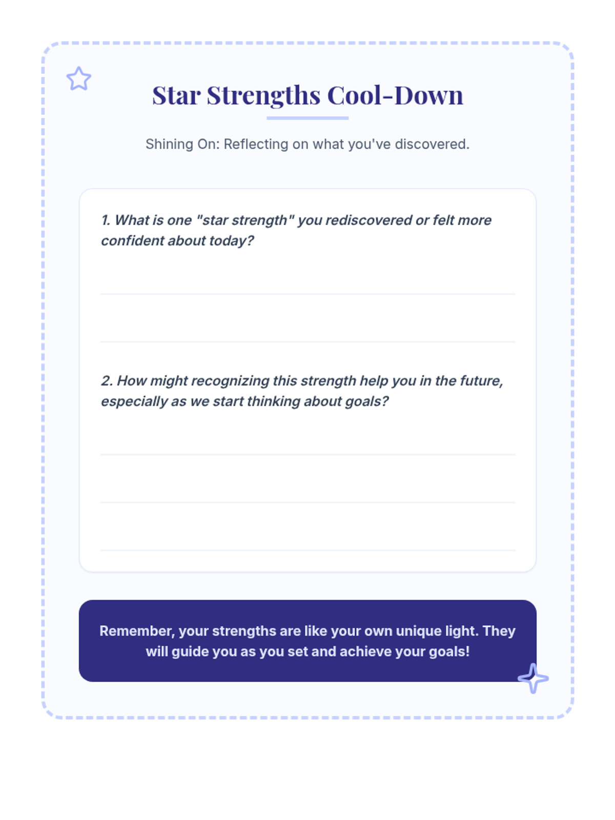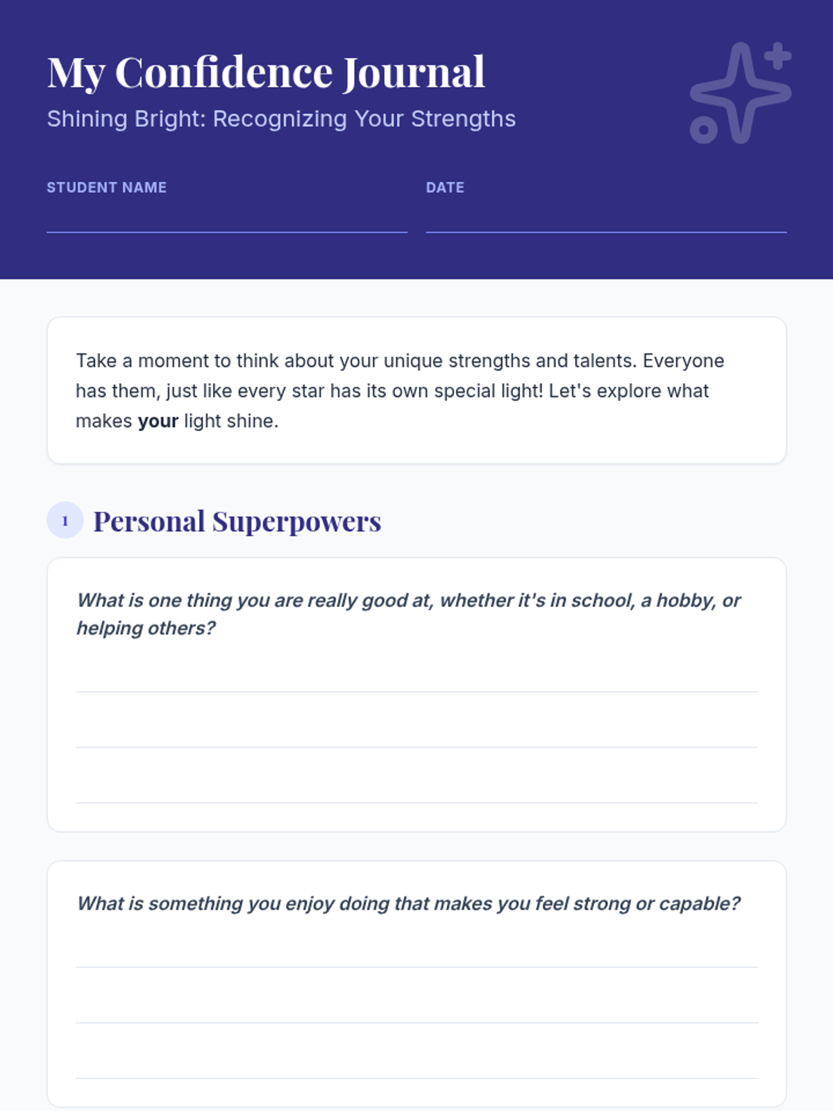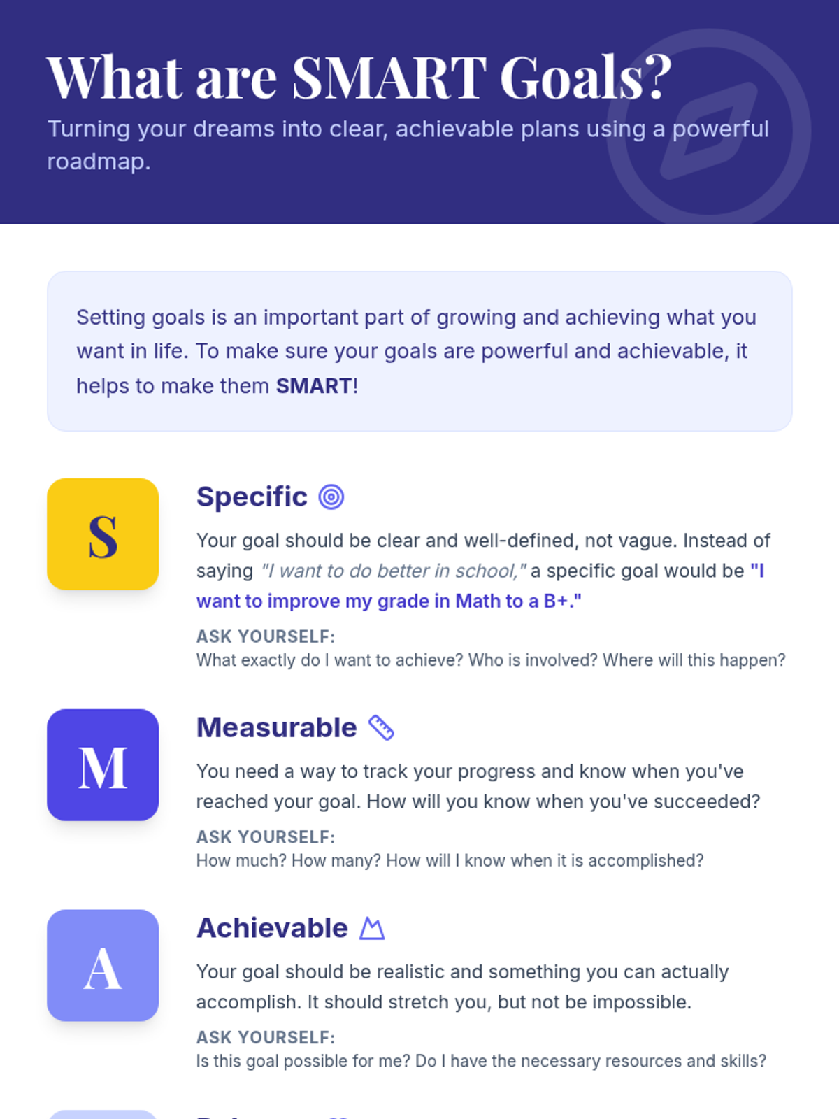 Students identify personal strengths and past achievements to build self-confidence as a foundation for future goal-setting. They are introduced to the concept of SMART goals.