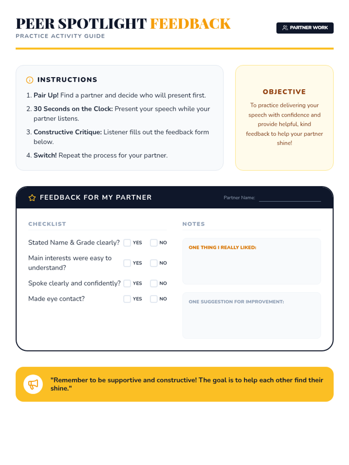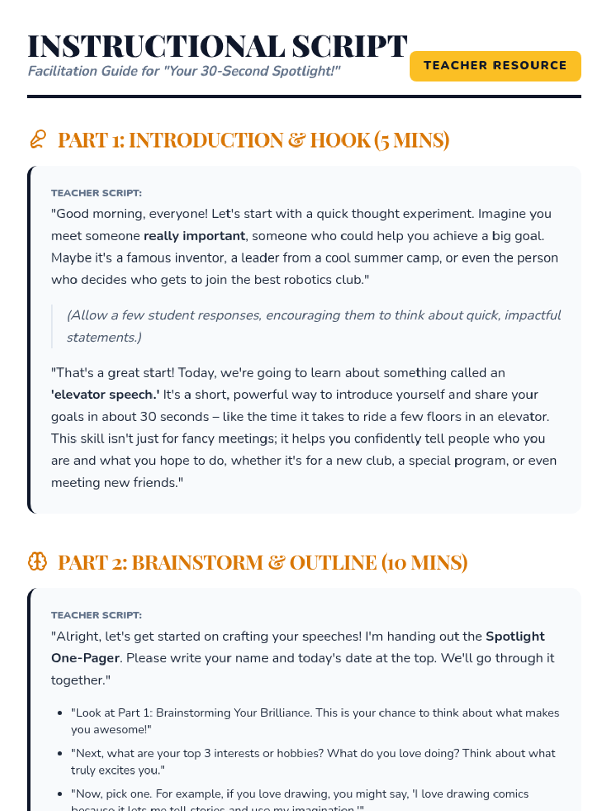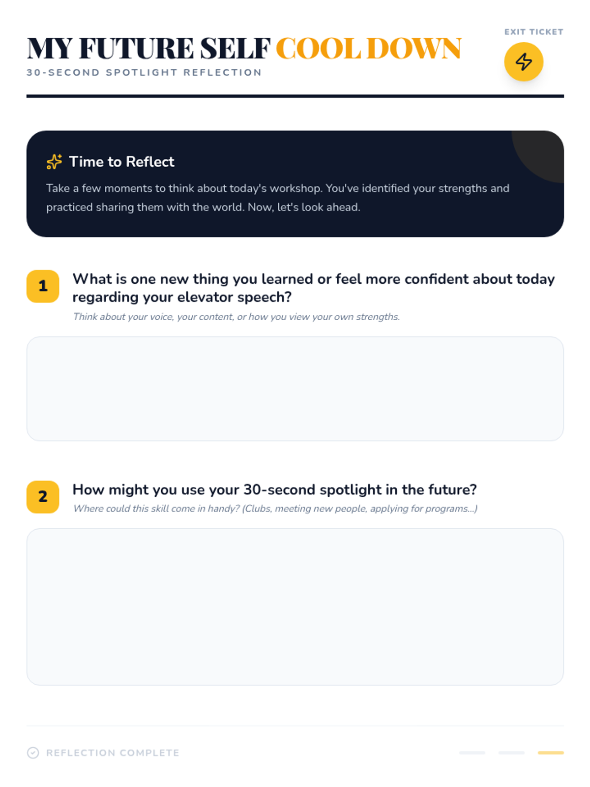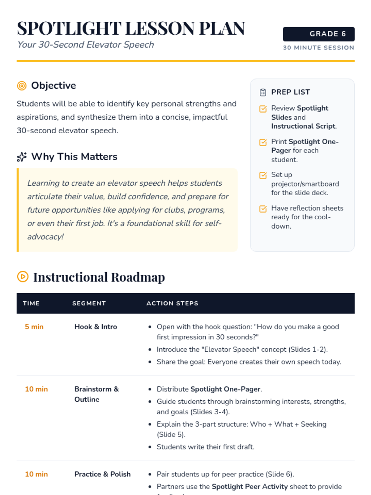 A high-energy 30-minute lesson for 6th graders to develop a 30-second 'elevator speech.' Students learn to identify their strengths and goals, then practice articulating them with confidence for future opportunities.