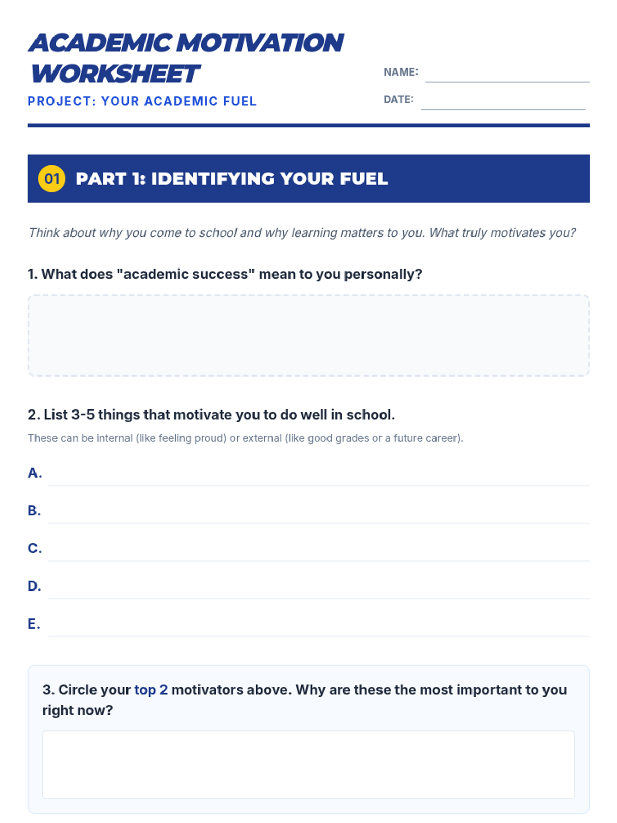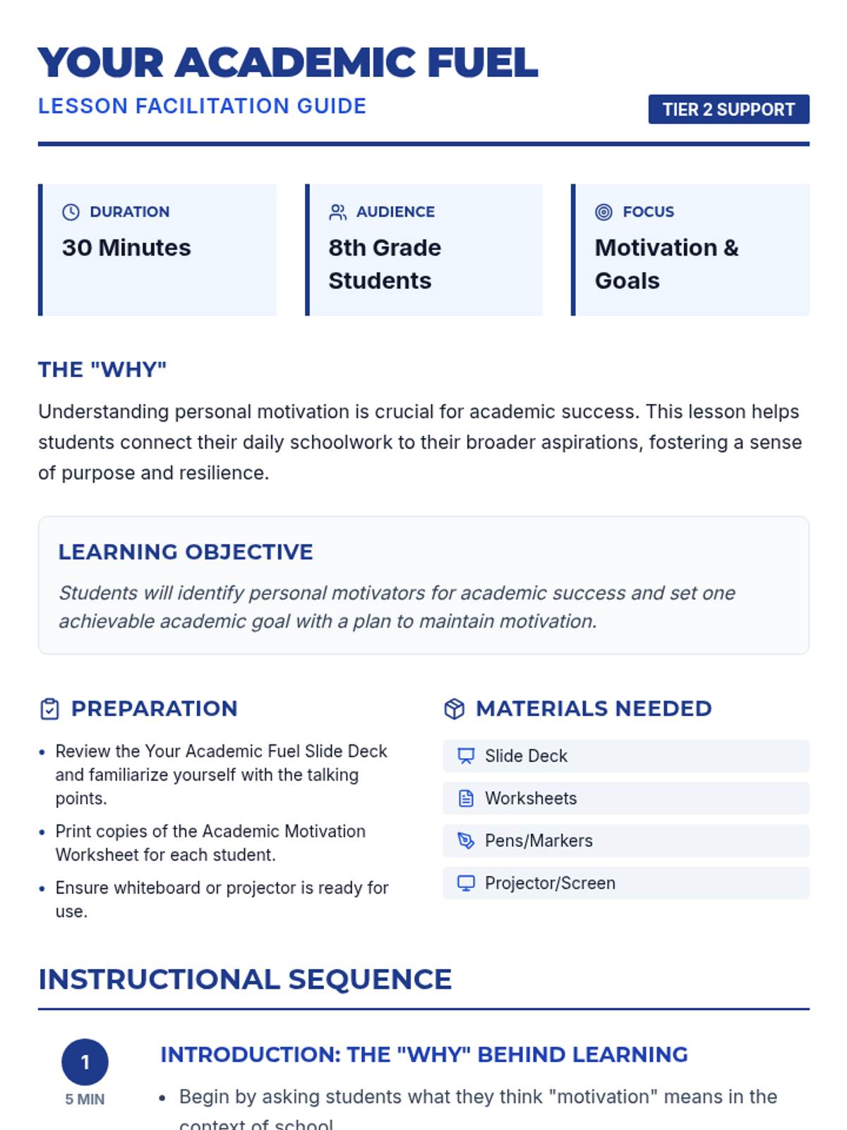 A 30-minute Tier 2 academic success lesson for 8th-grade students focusing on identifying personal motivators and setting SMART goals to fuel academic performance.