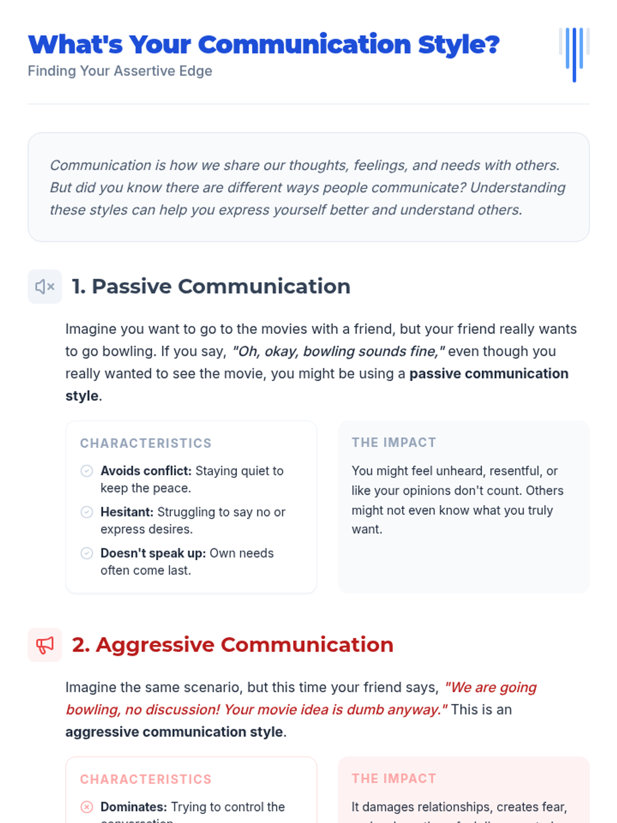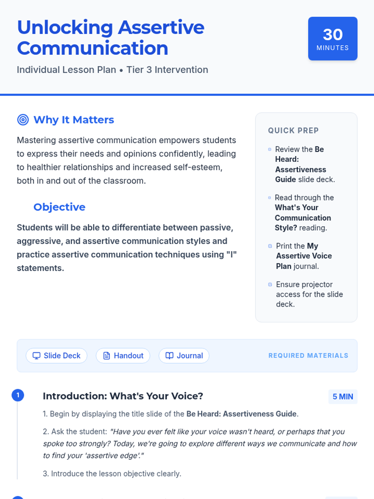 This individual Tier 3 lesson helps 9th-grade students master assertive communication, empowering them to express their needs confidently and respectfully through interactive discussion and reflective practice.