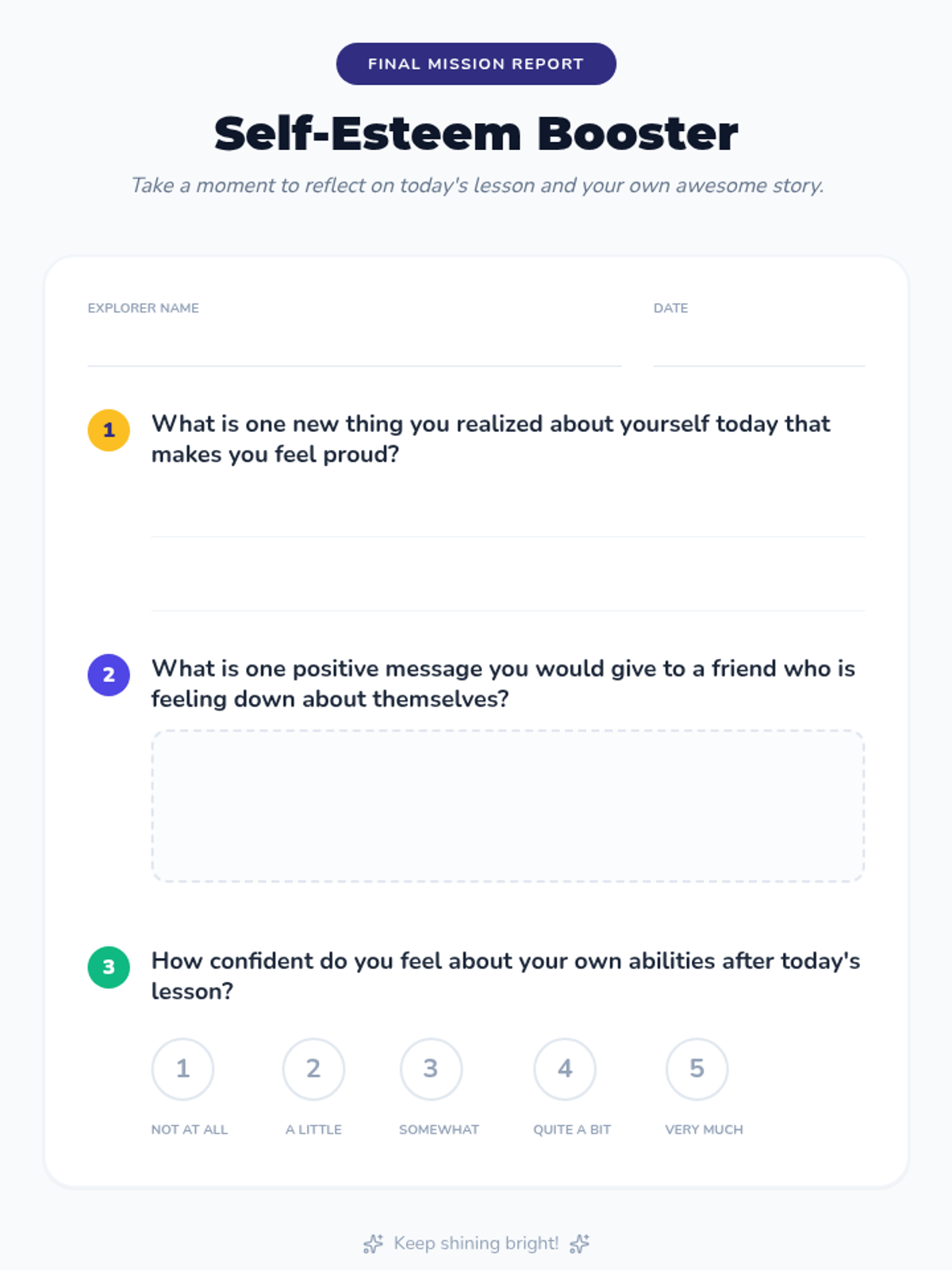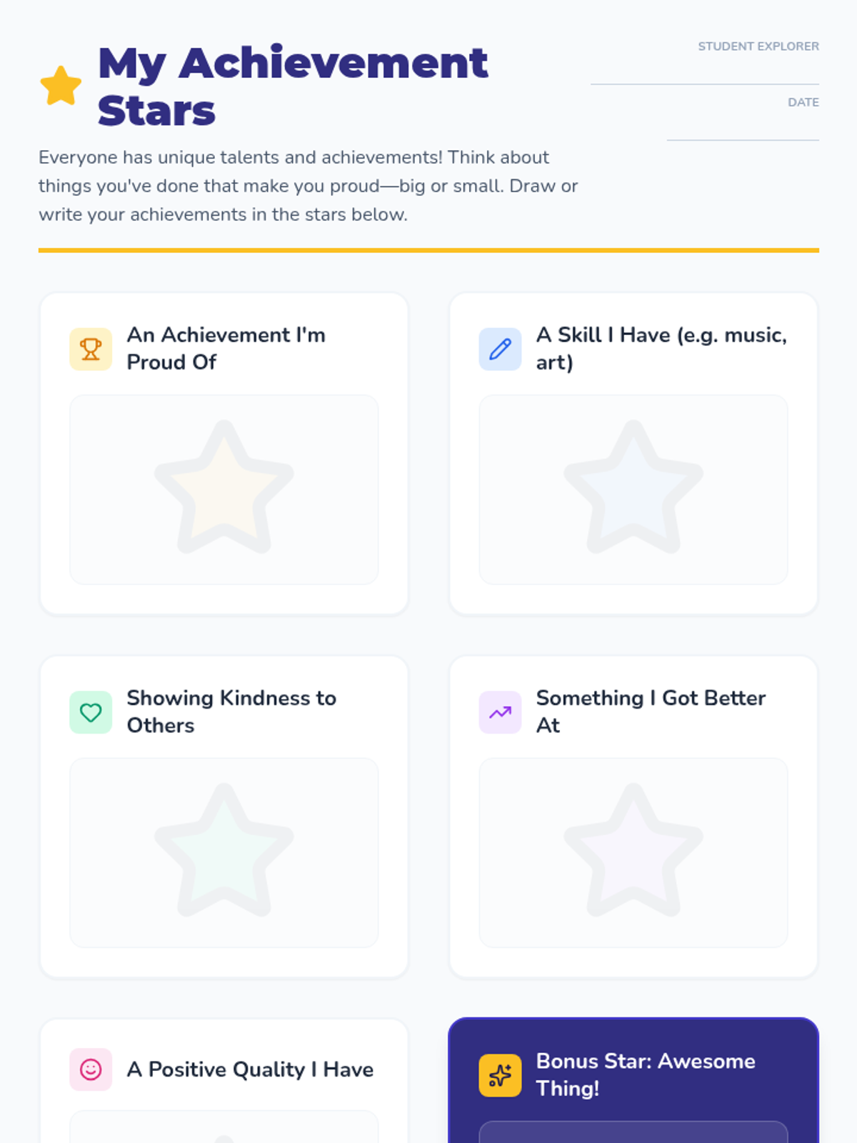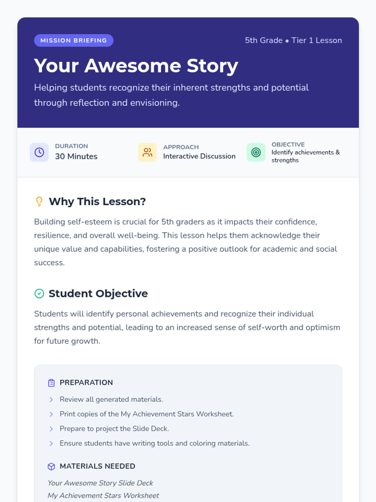 A 30-minute Tier 1 lesson for 5th graders designed to boost self-esteem by reflecting on past achievements and envisioning future goals through star-themed activities.
