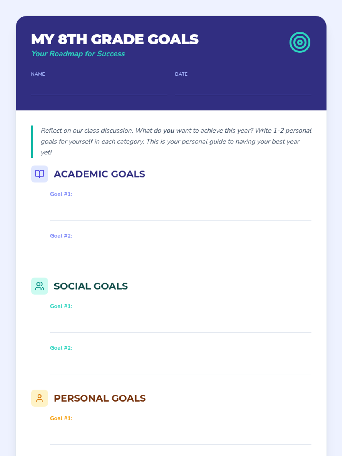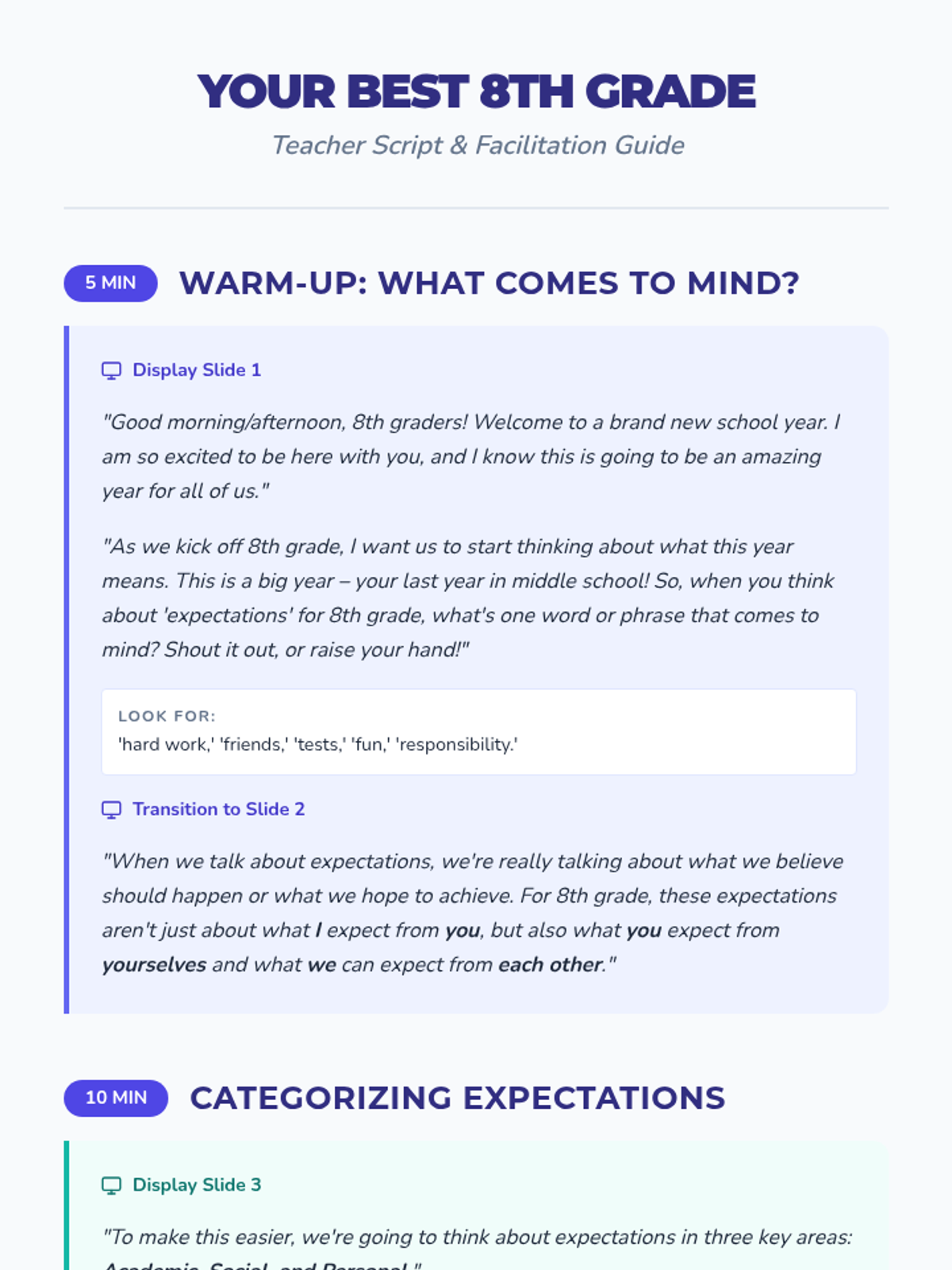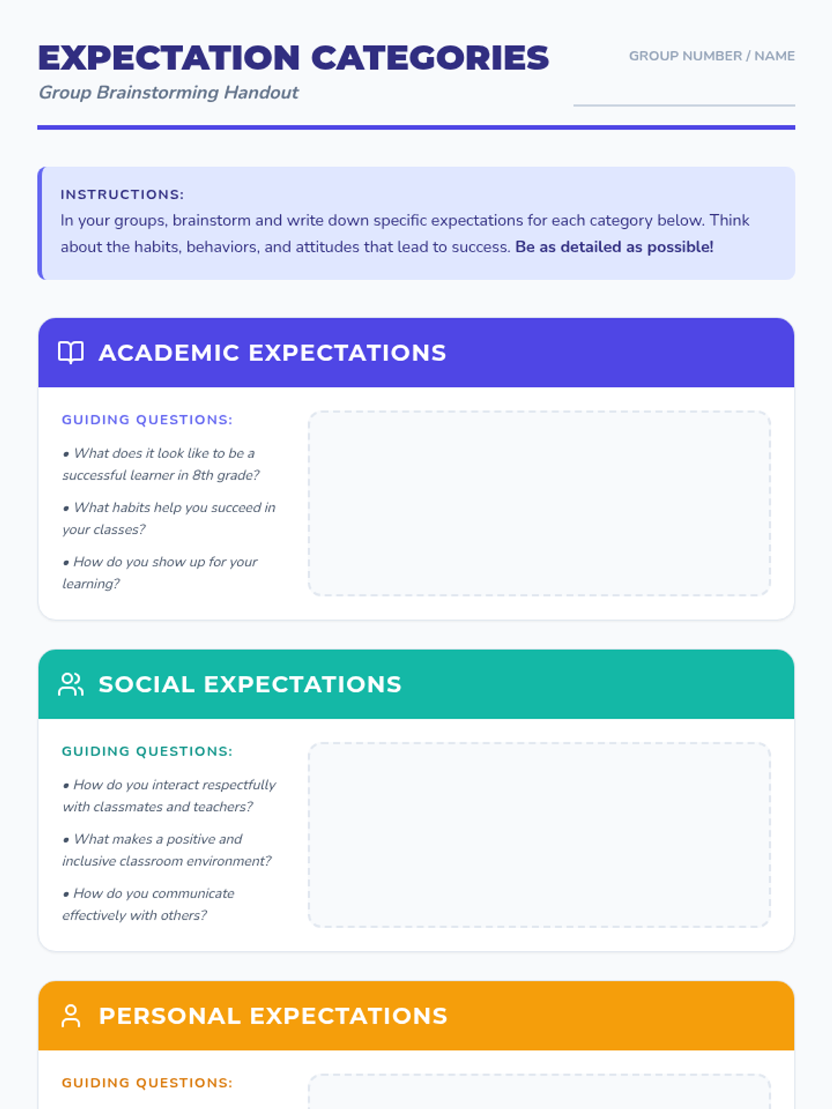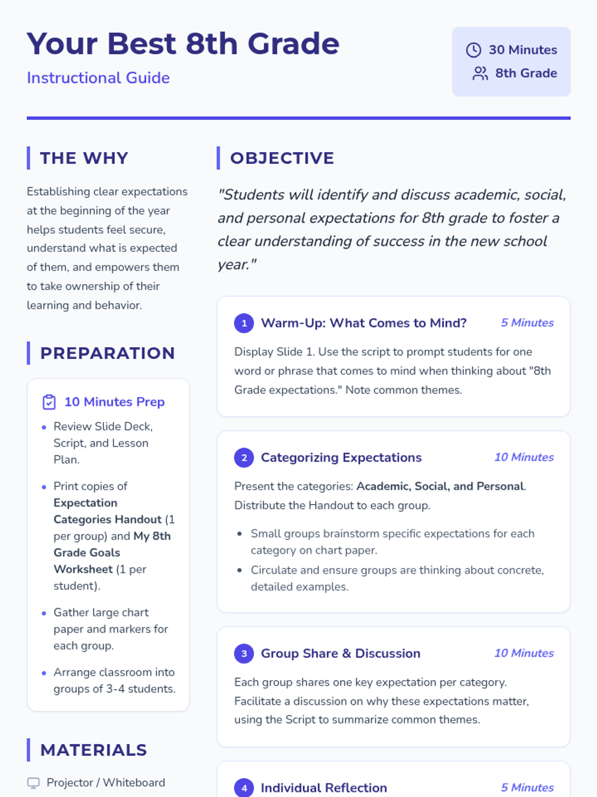 This 30-minute activity helps 8th-grade students understand and articulate academic, social, and personal expectations for the upcoming school year. Students will identify key behaviors for success through group discussion and individual goal-setting.