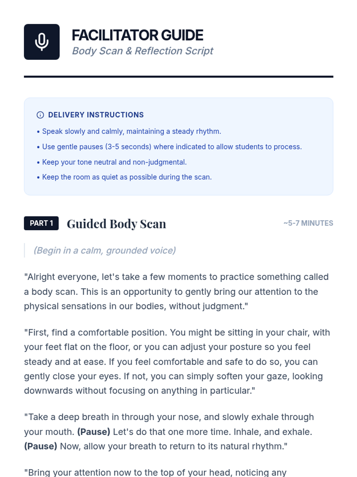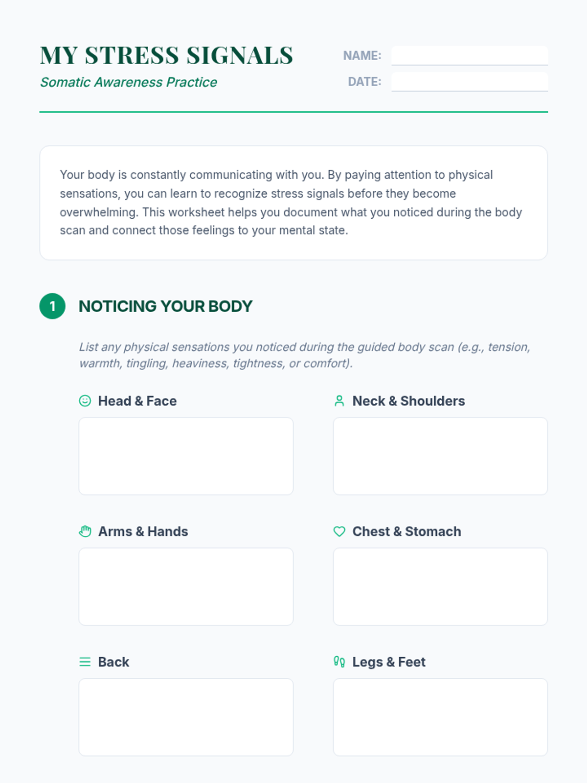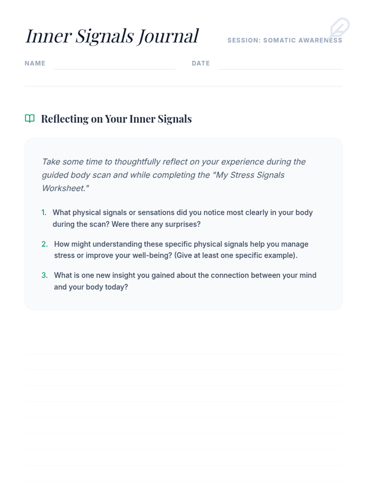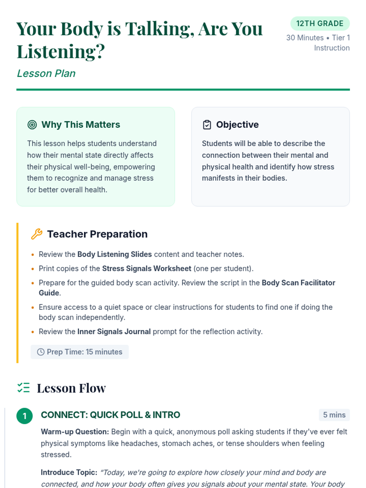 A 30-minute lesson for 12th graders exploring the mind-body connection. Students learn to recognize physical stress signals through a guided body scan and reflection, empowering them to manage their well-being more effectively.