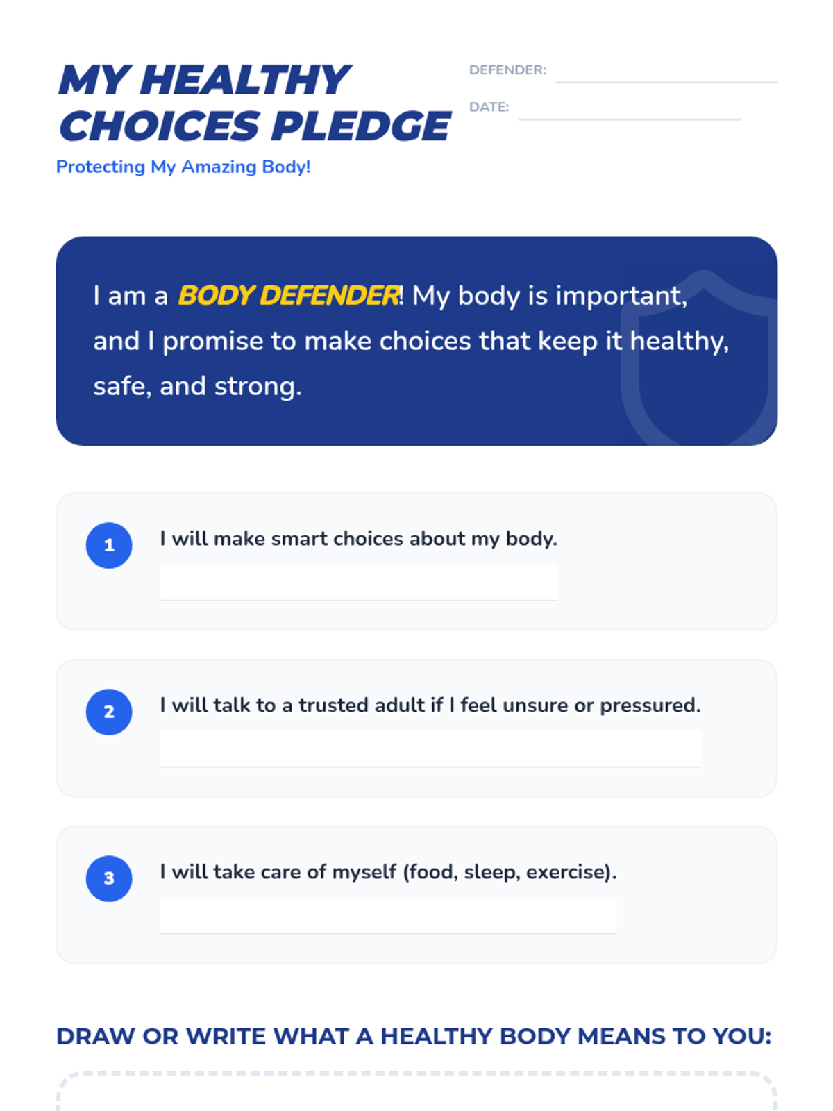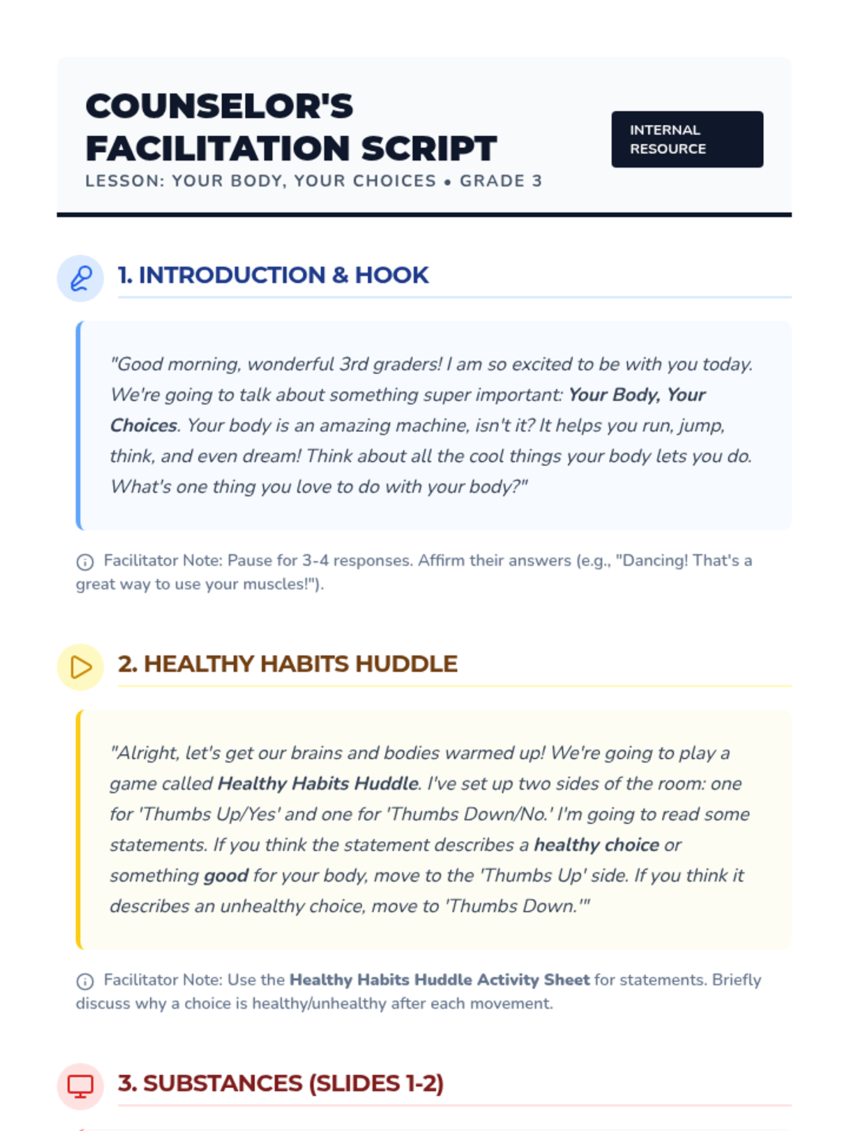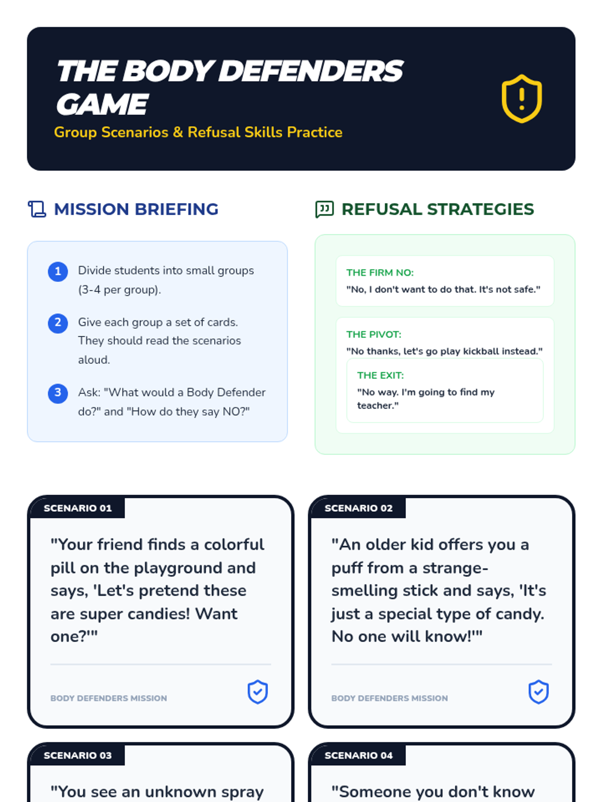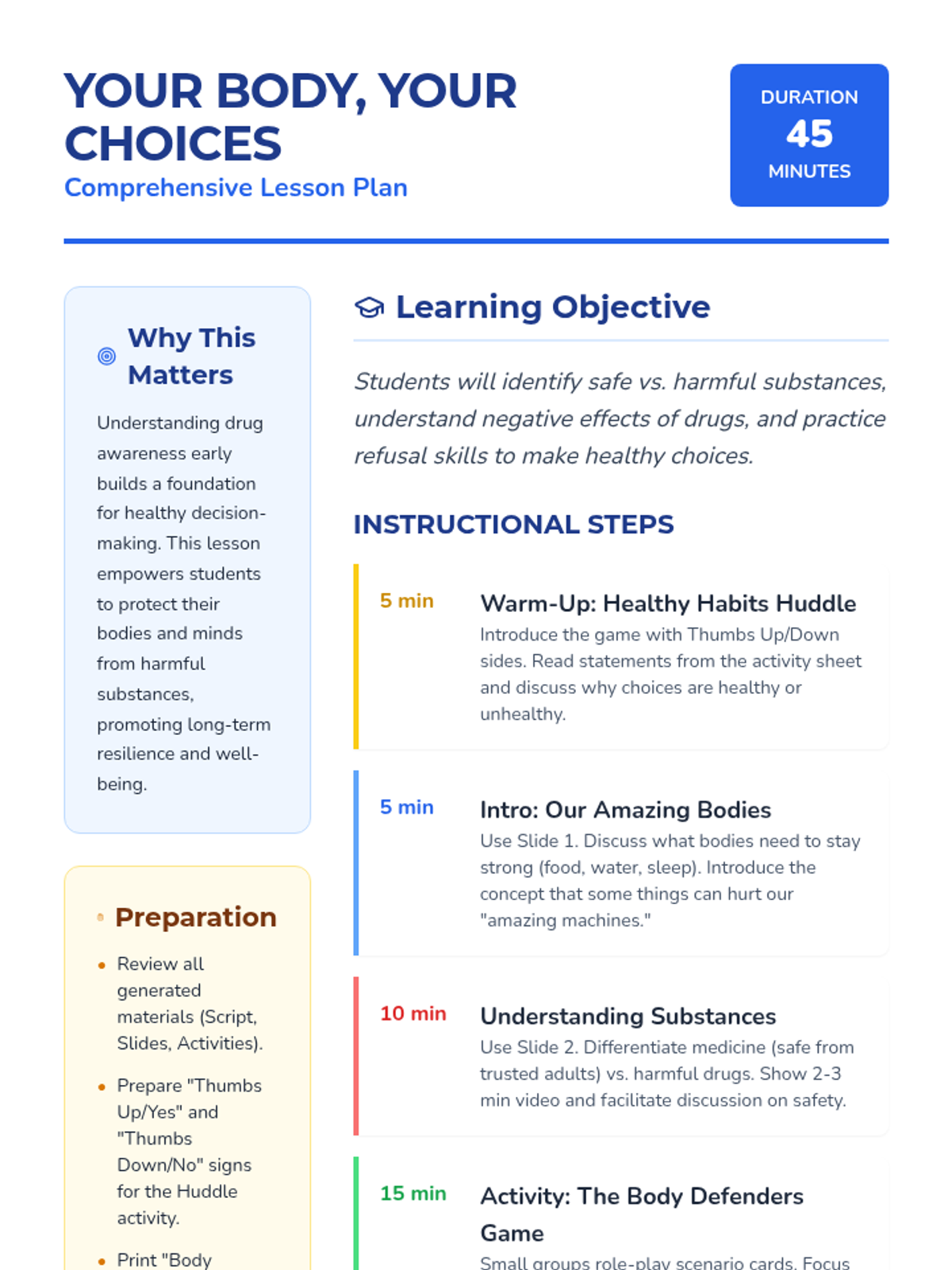 A 45-minute lesson for 3rd graders focused on identifying safe vs. harmful substances, understanding body protection, and practicing refusal skills through the 'Body Defender' concept.