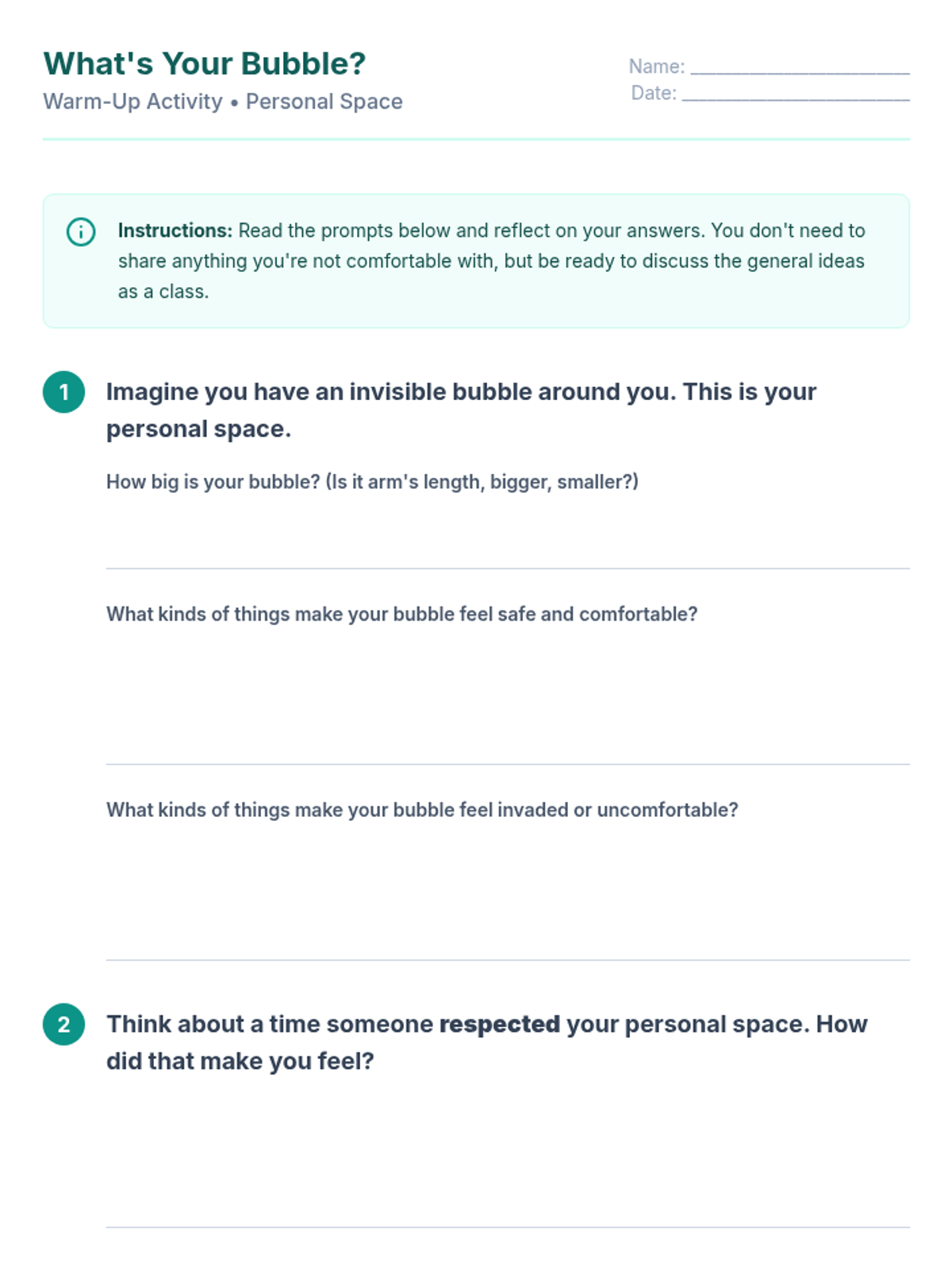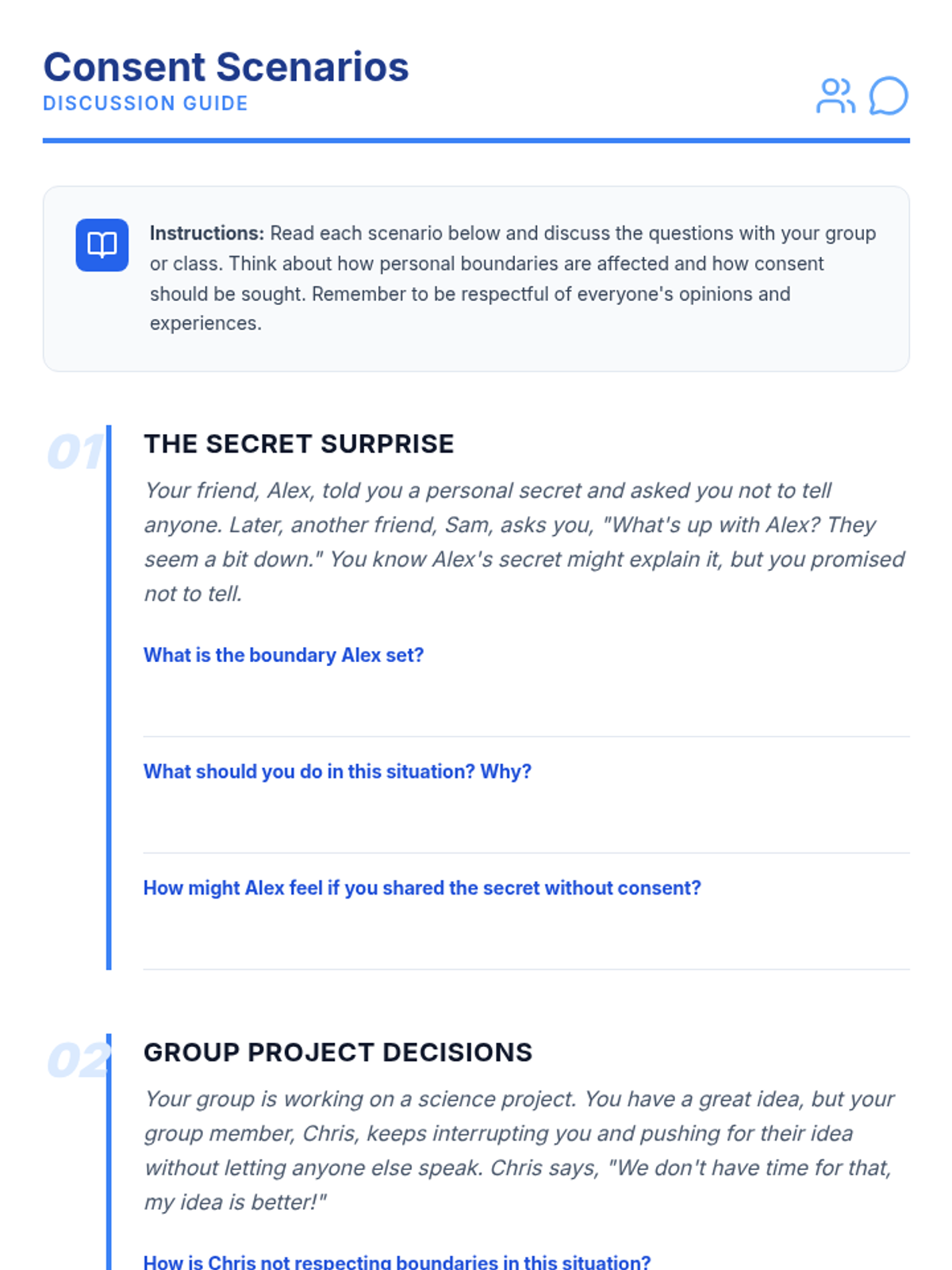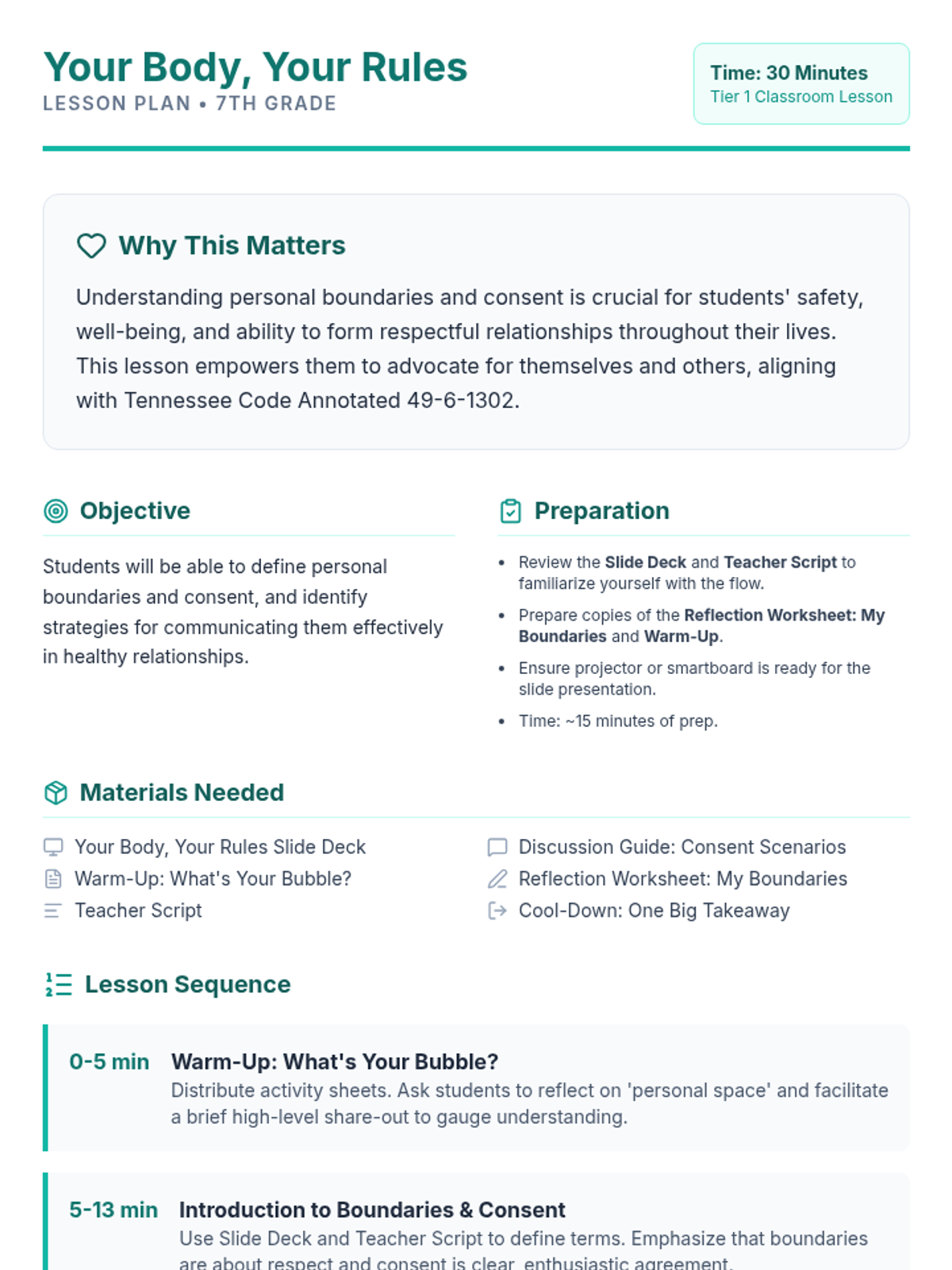 This 30-minute, single-session lesson for 7th-grade students explores personal boundaries and consent within the context of healthy relationships, aligning with Tennessee Code Annotated 49-6-1302. It helps students understand and advocate for their physical and emotional well-being.
