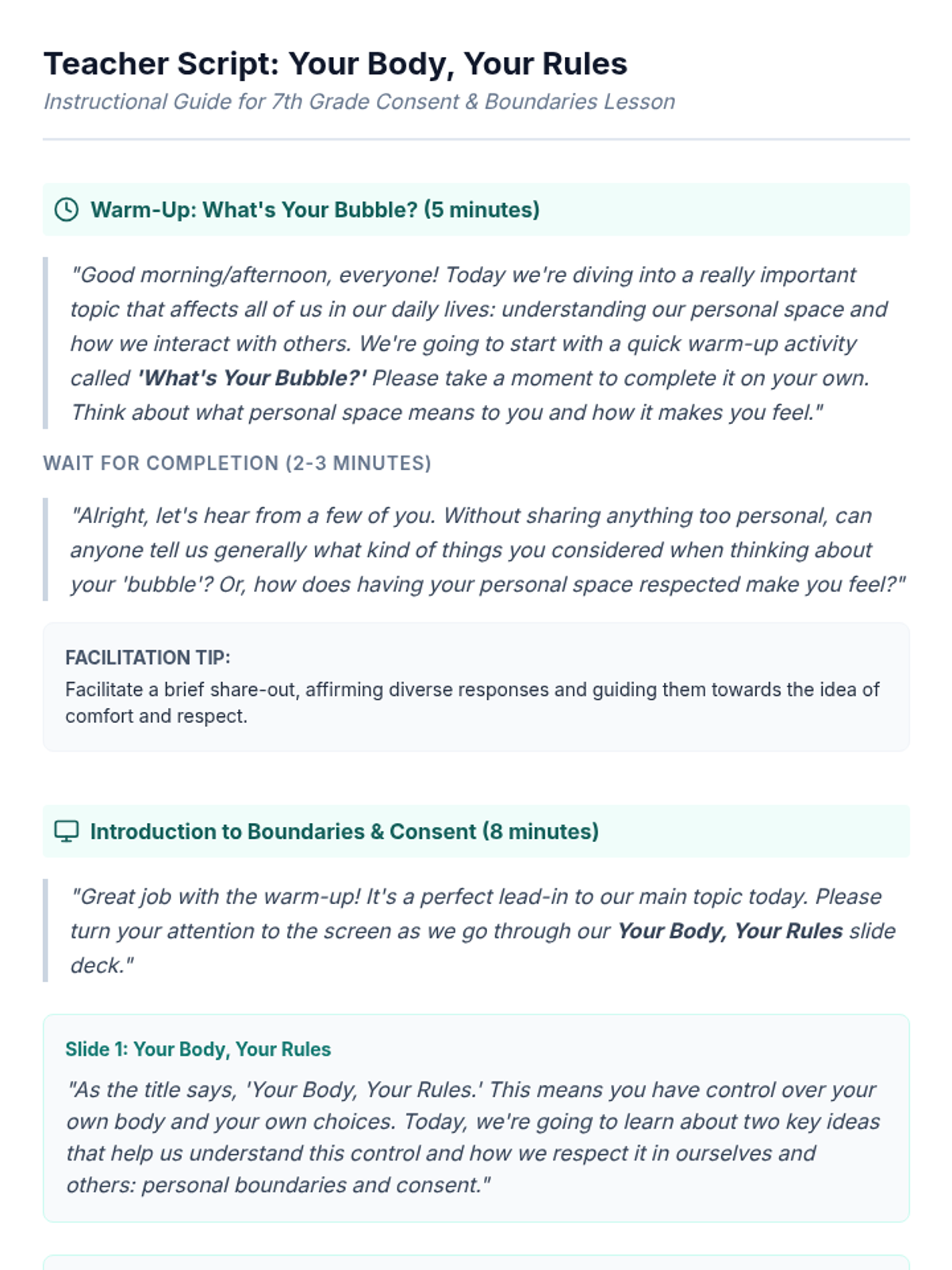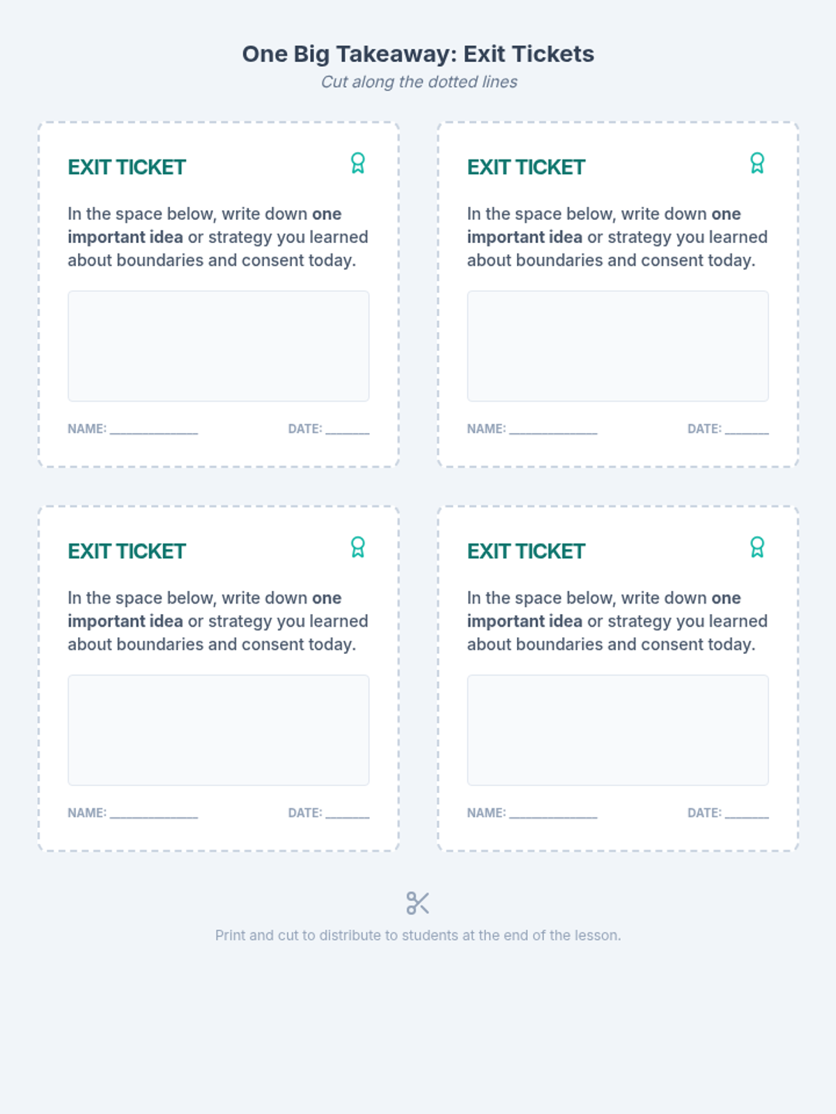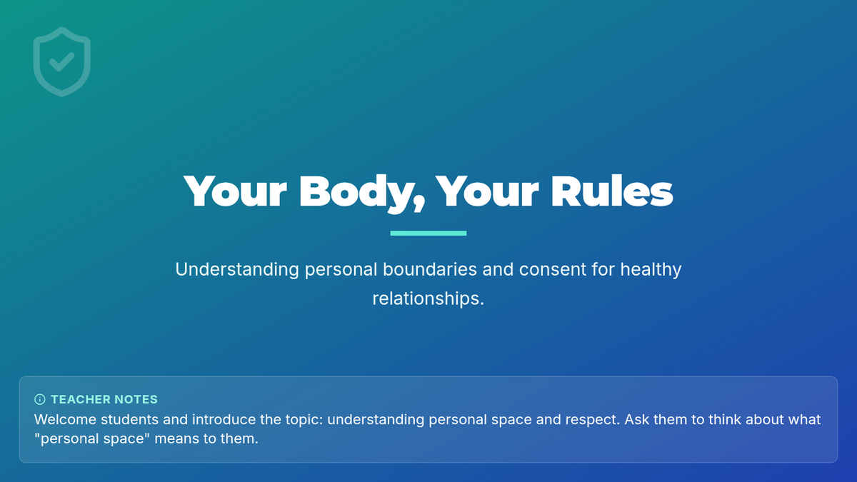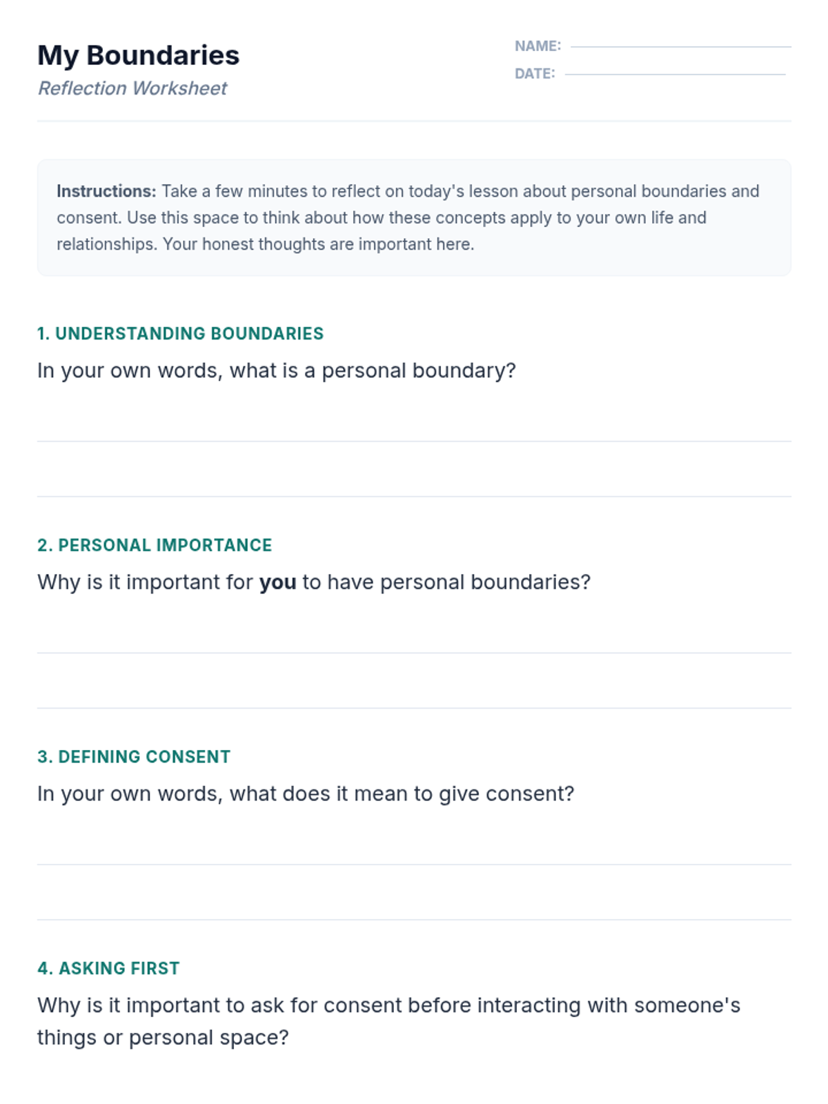 This 30-minute, single-session lesson for 7th-grade students explores personal boundaries and consent within the context of healthy relationships, aligning with Tennessee Code Annotated 49-6-1302. It helps students understand and advocate for their physical and emotional well-being.