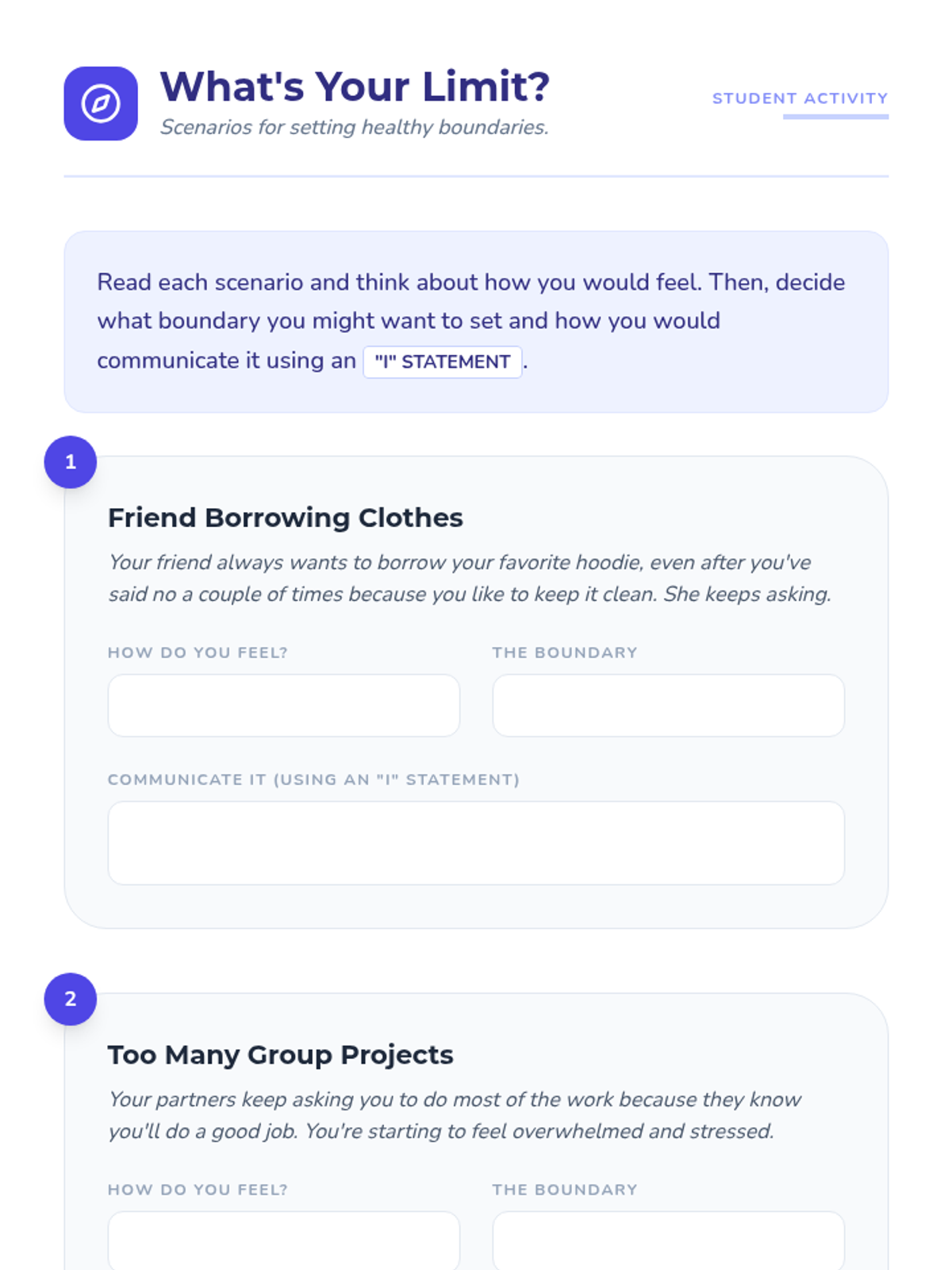Focuses on healthy conflict resolution. Students learn to use 'I' statements and de-escalation techniques to handle disagreements without damaging friendships.