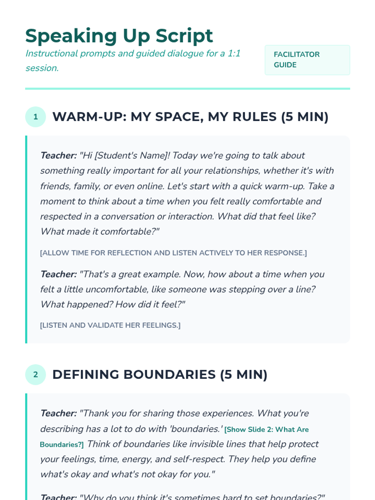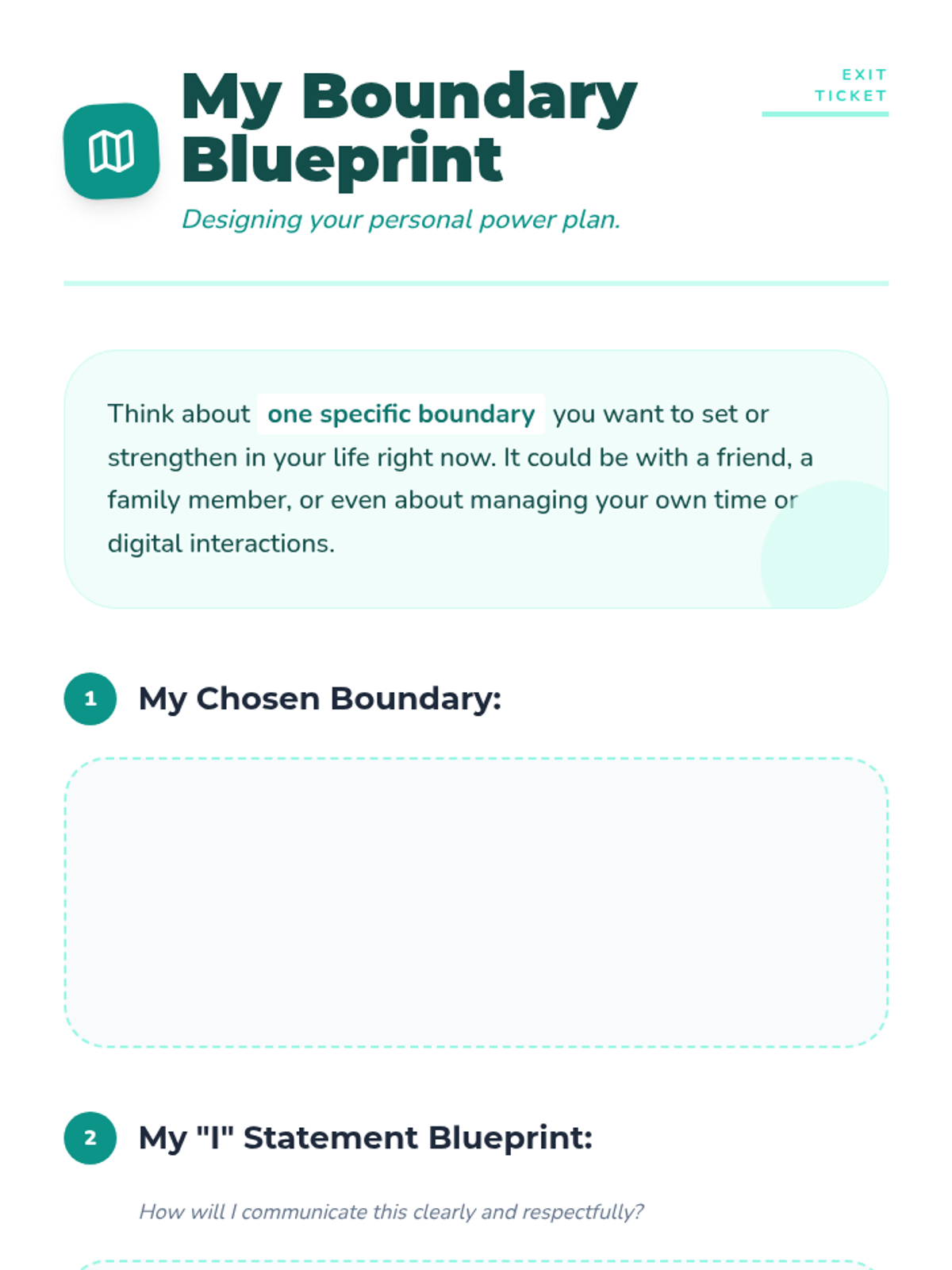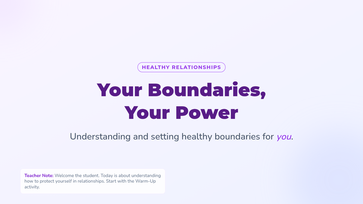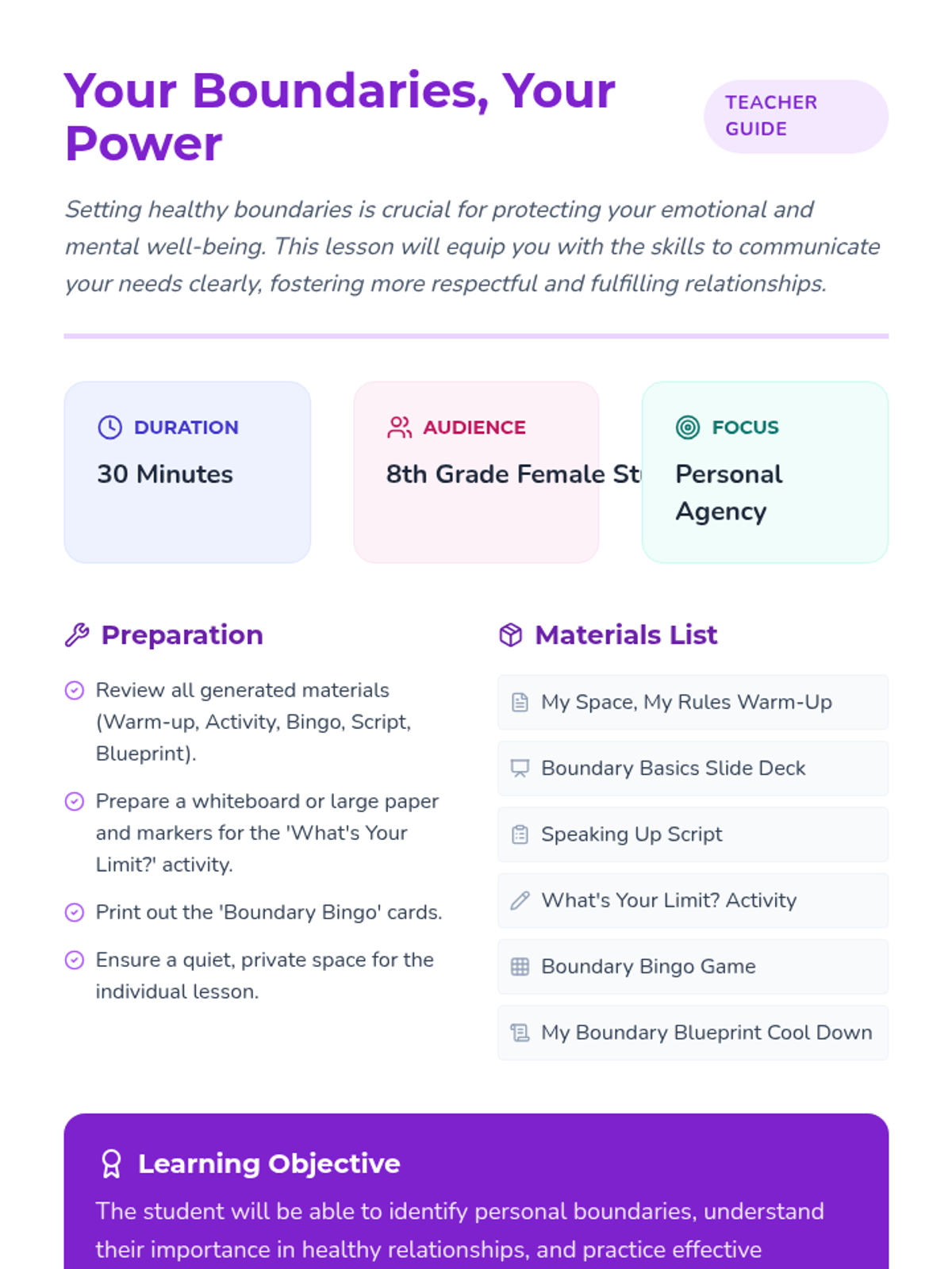 This individual lesson helps an 8th-grade female student understand and practice setting healthy boundaries in her relationships through engaging activities, discussions, and role-play.