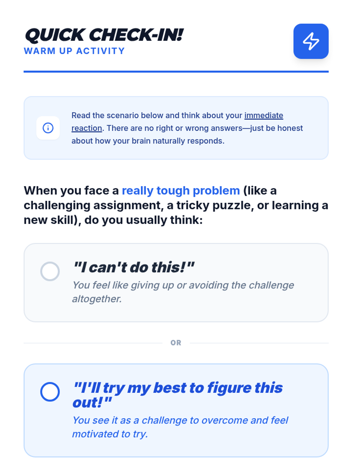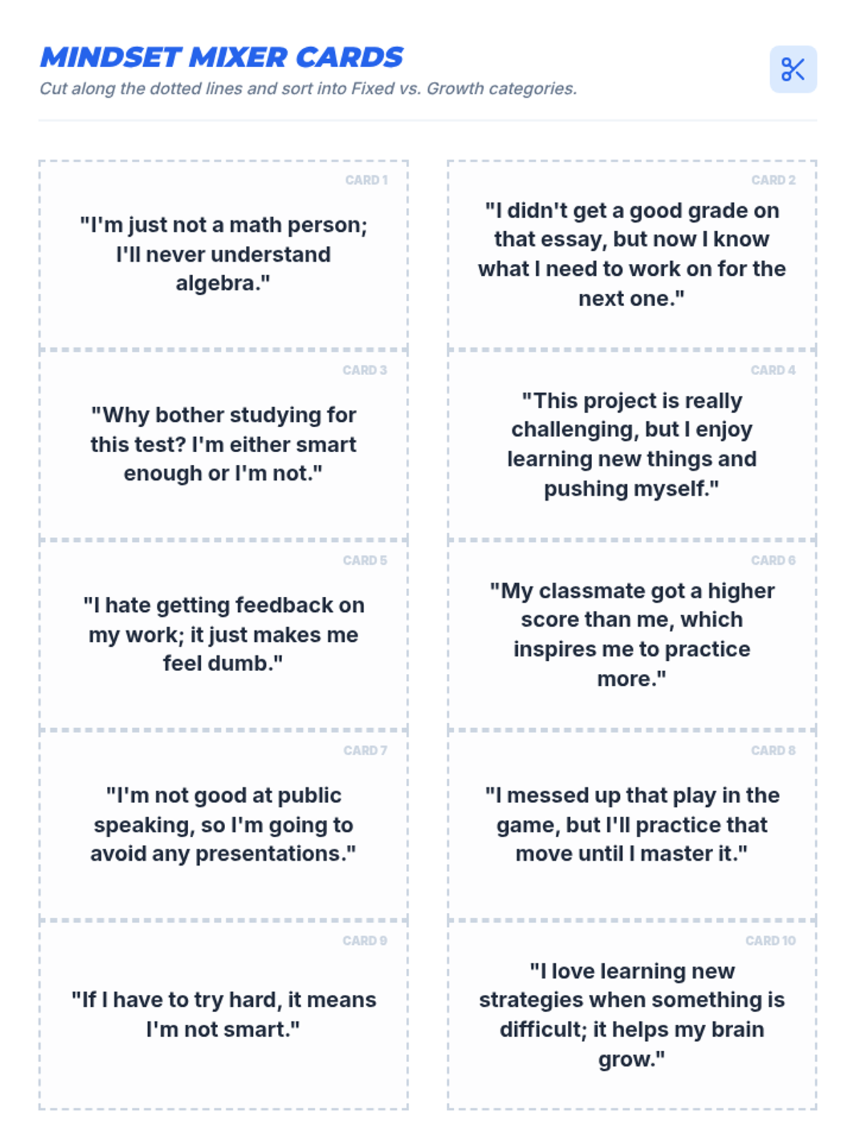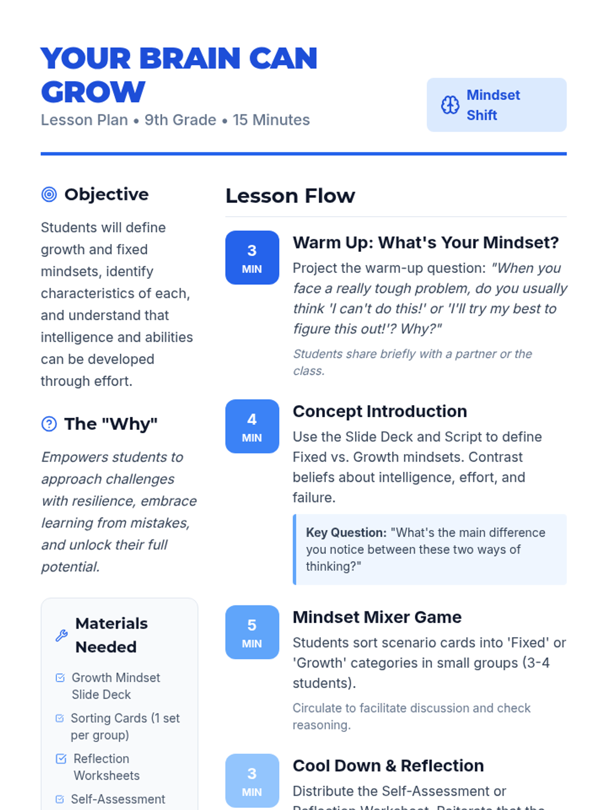 This 15-minute lesson introduces 9th-grade students to growth and fixed mindsets, teaching them that intelligence can be developed through effort and resilience. students engage in discussion, a card-sorting game, and reflective writing.