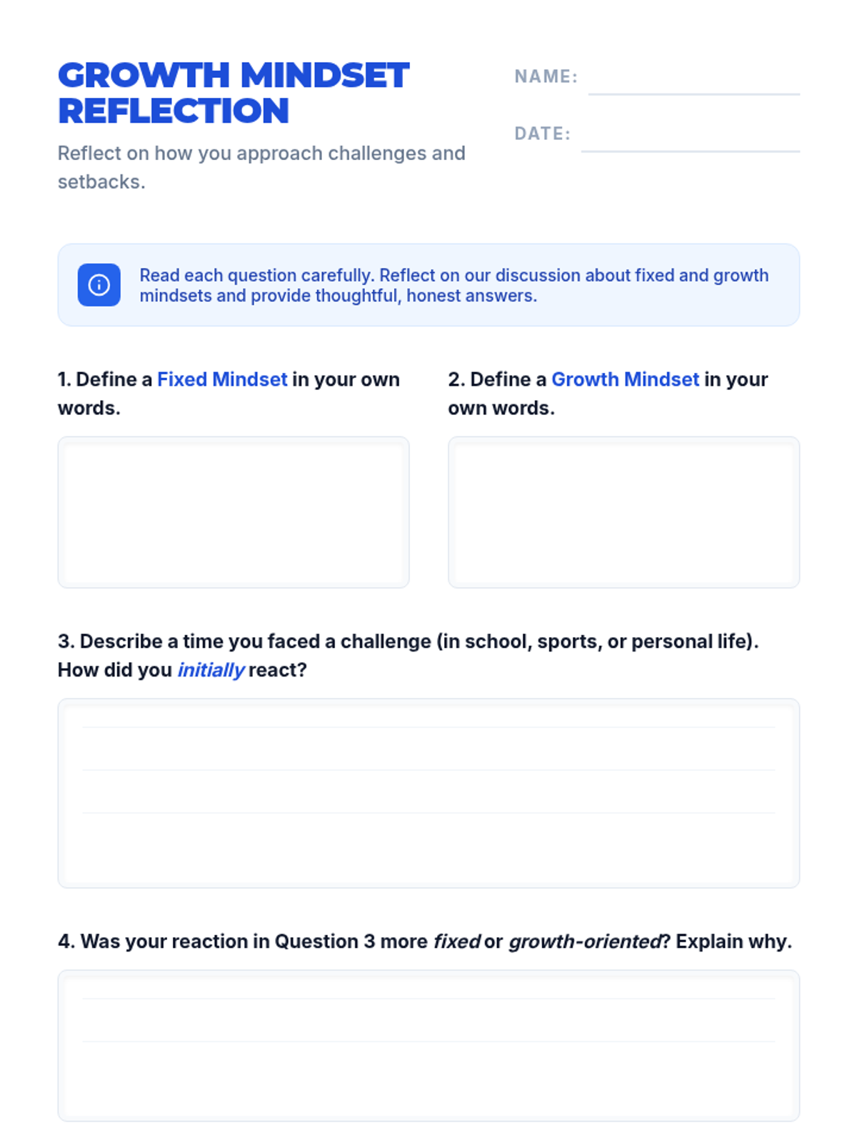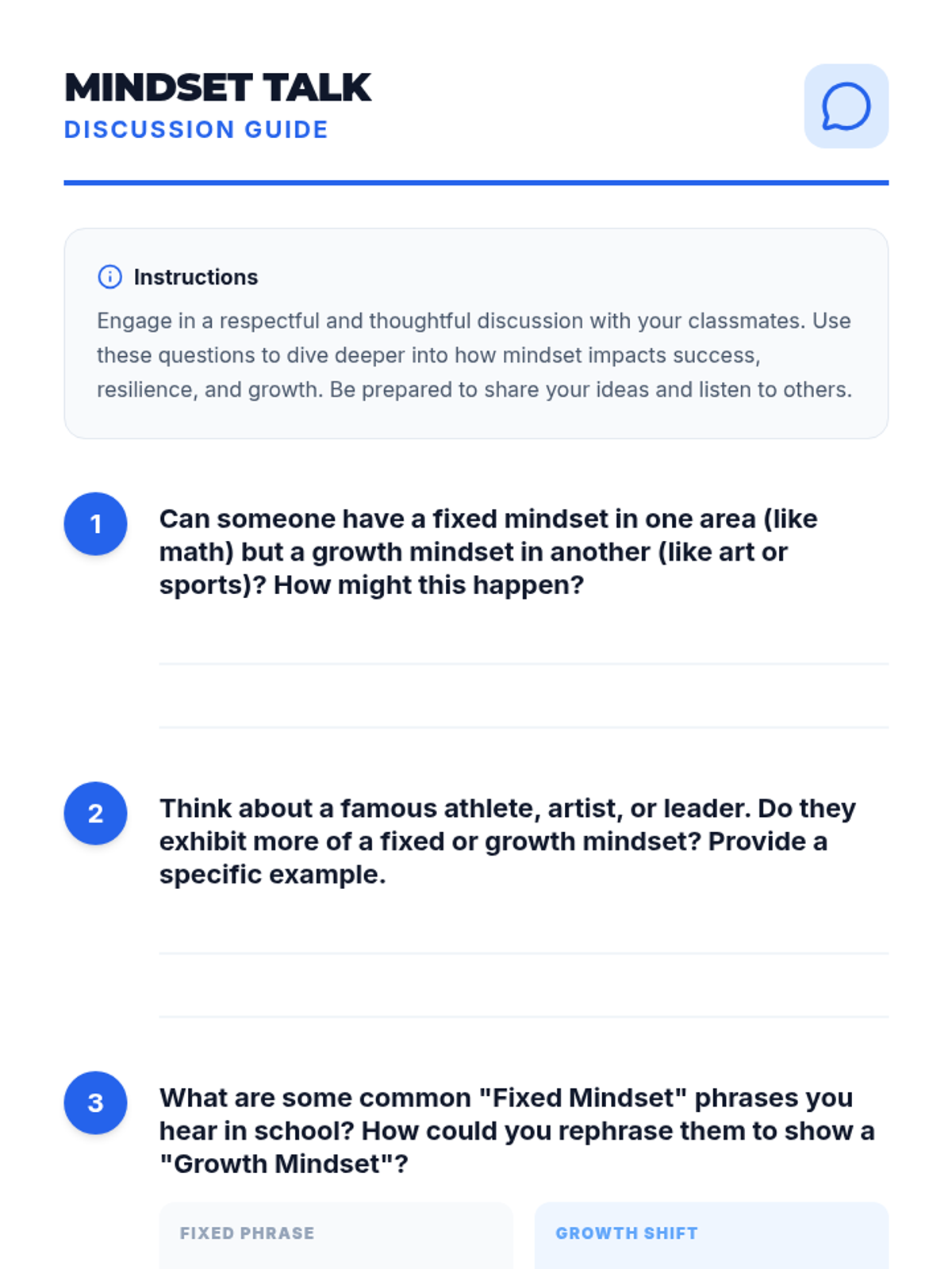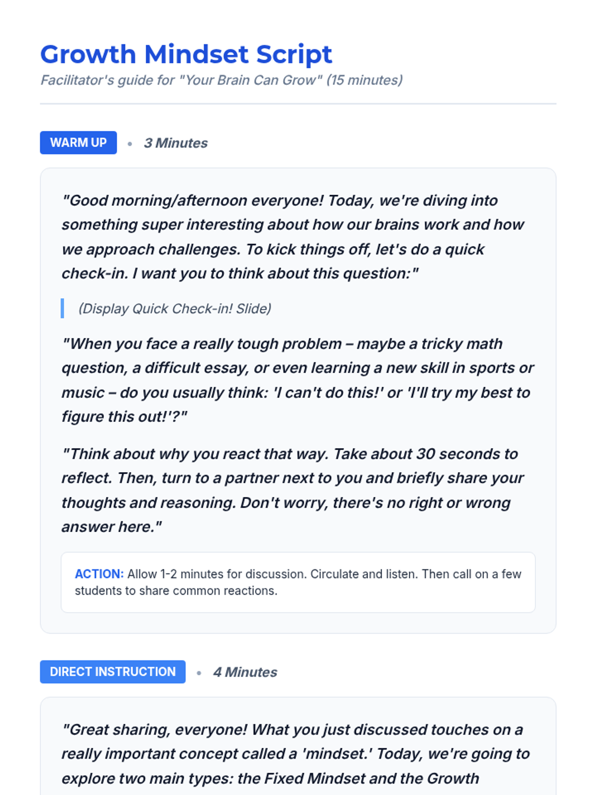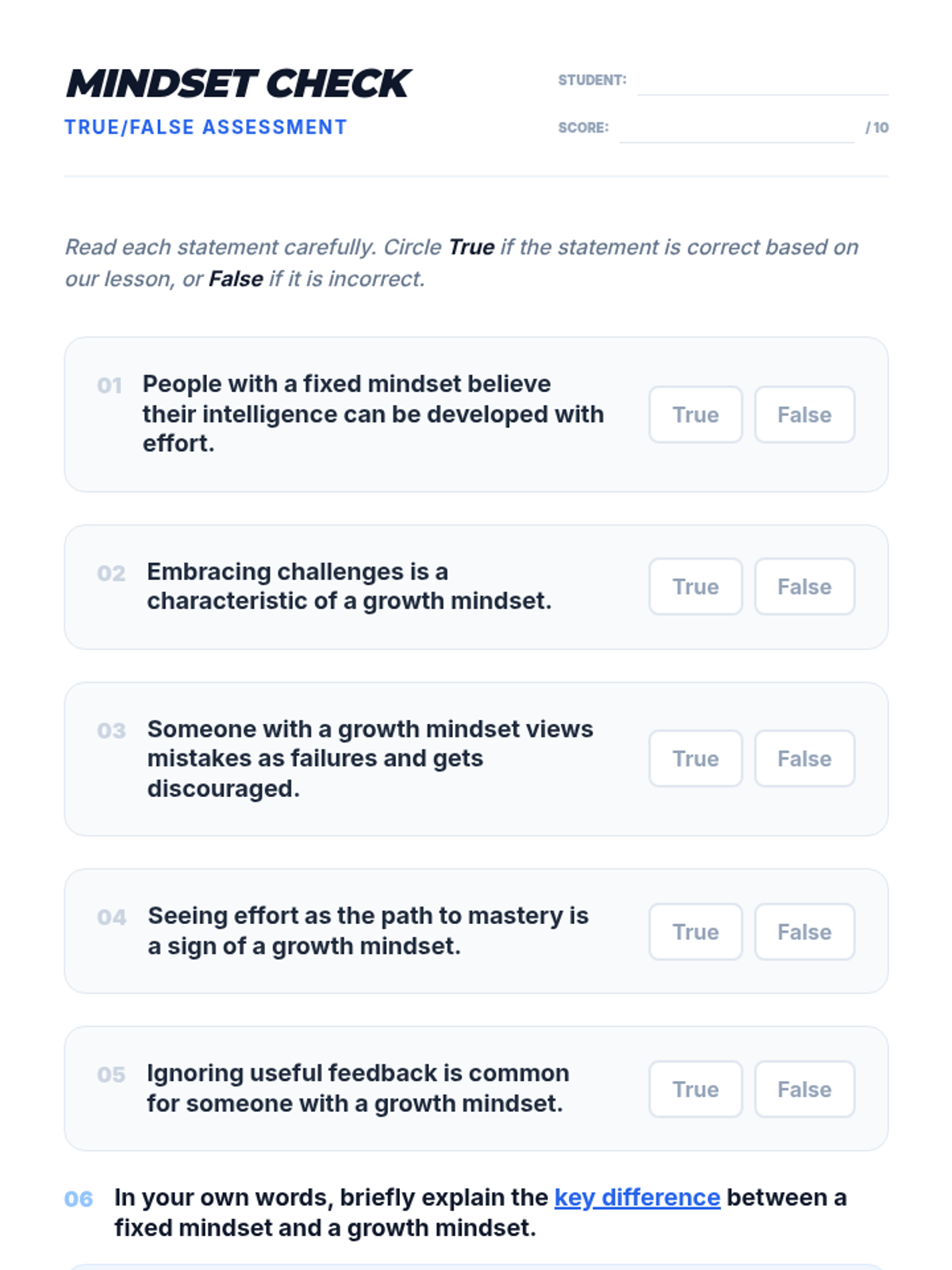 This 15-minute lesson introduces 9th-grade students to growth and fixed mindsets, teaching them that intelligence can be developed through effort and resilience. students engage in discussion, a card-sorting game, and reflective writing.