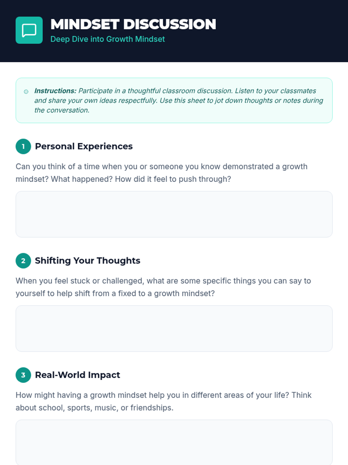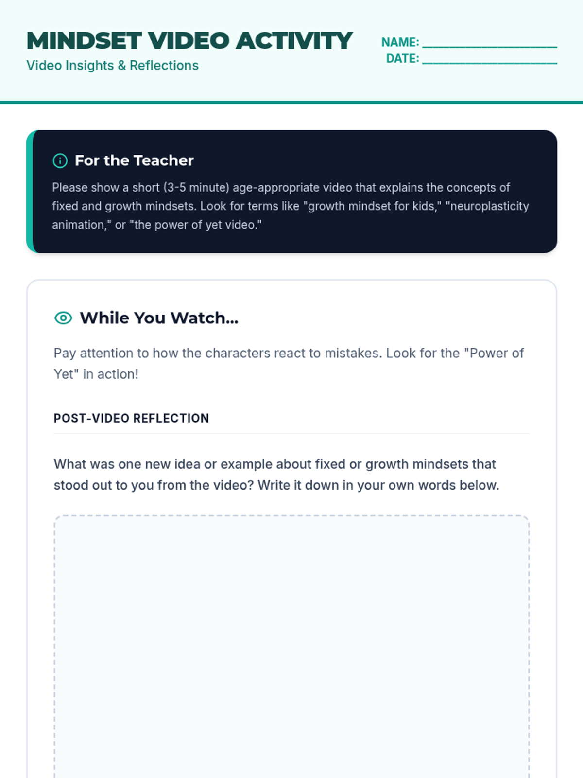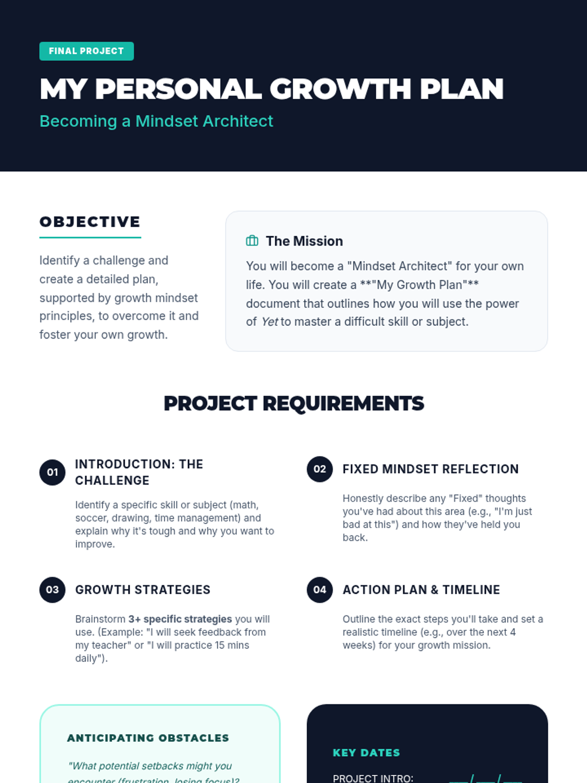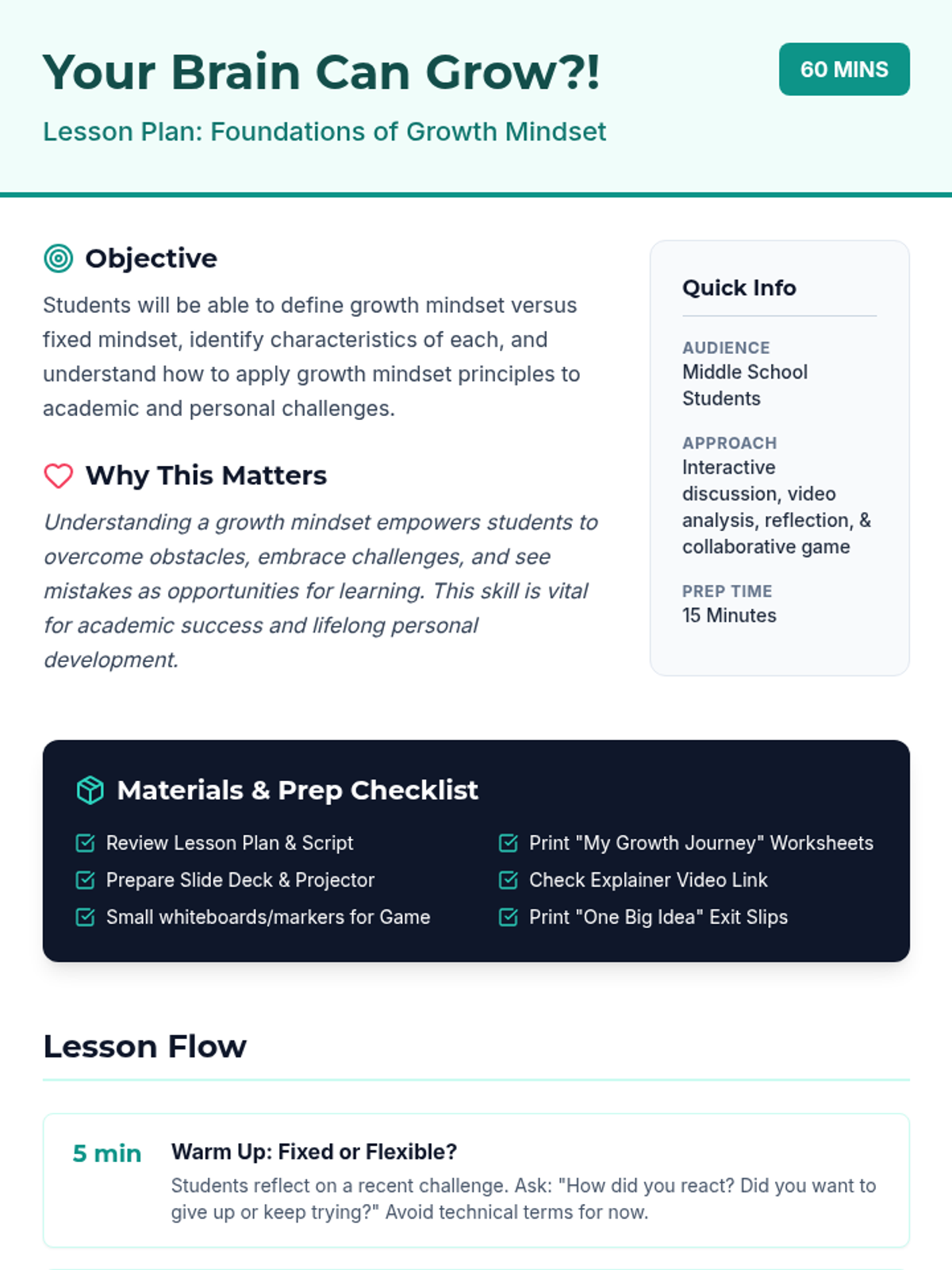 This comprehensive lesson introduces students to the concept of a growth mindset, helping them understand that their intelligence and abilities can develop through dedication and hard work. It's crucial for fostering resilience and a love for learning in all K-12 students. This single session is designed for a 1-hour class.
