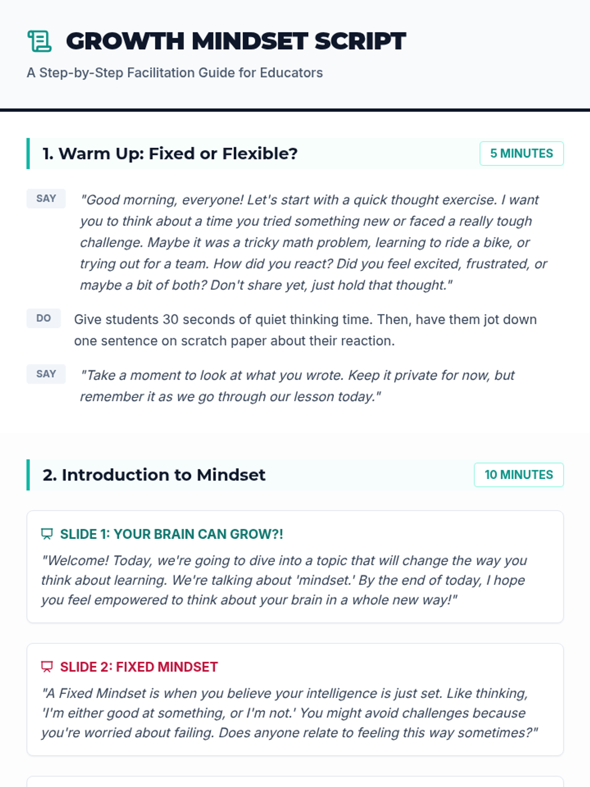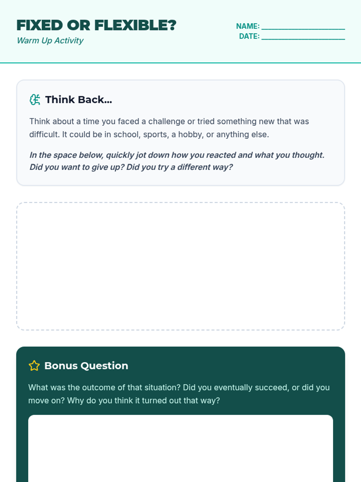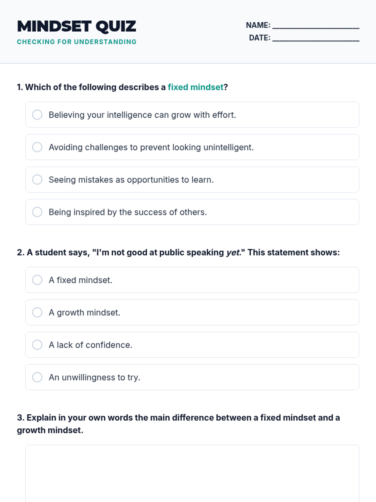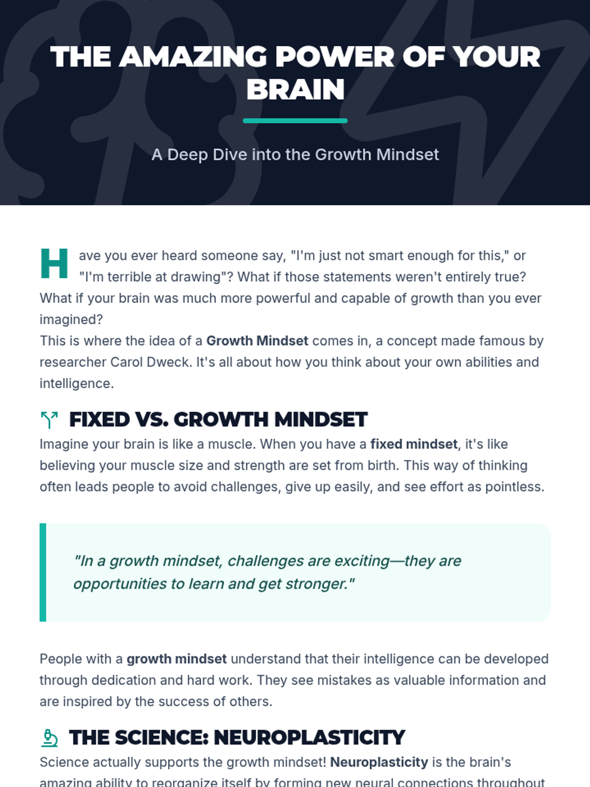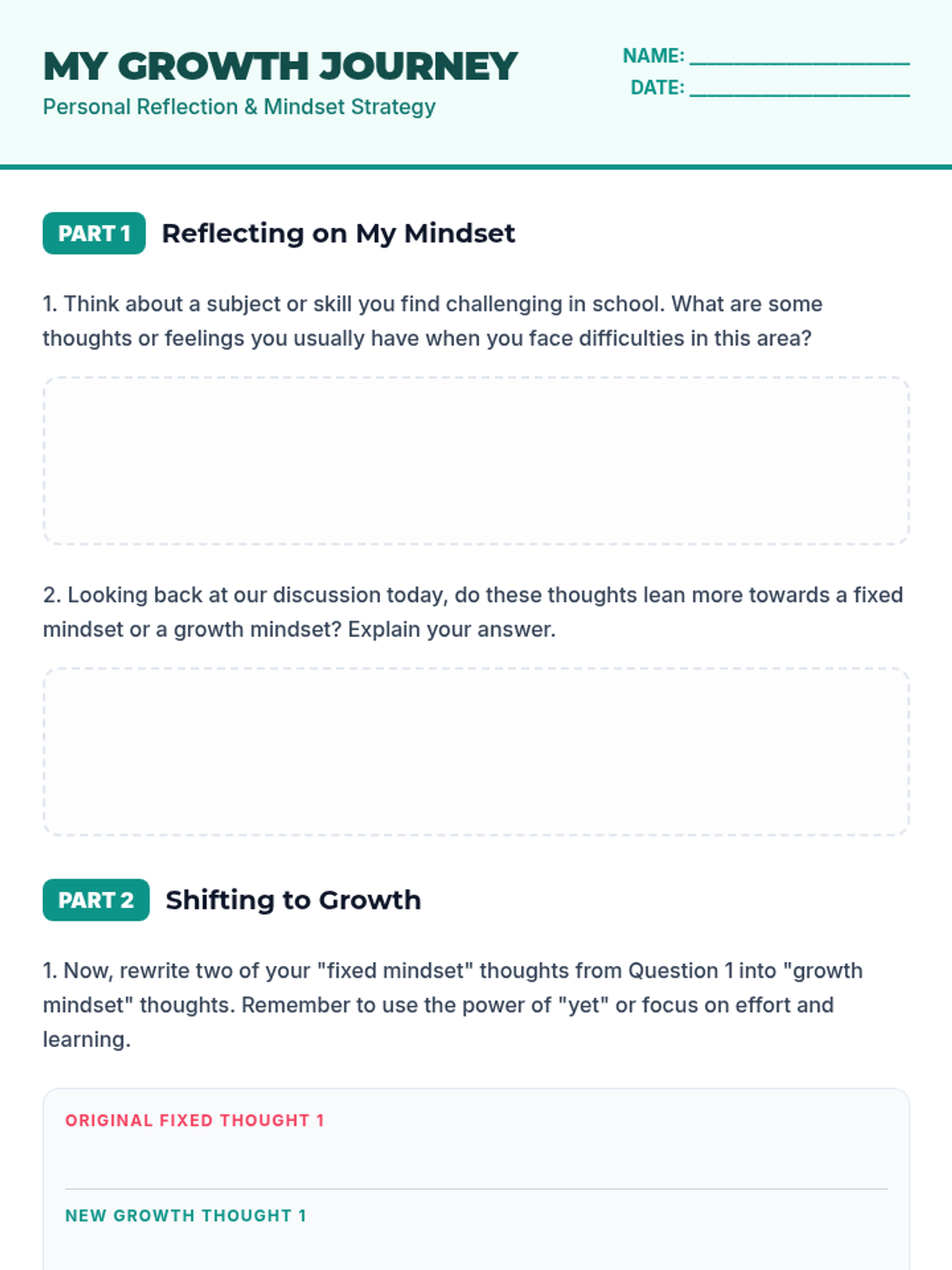 This comprehensive lesson introduces students to the concept of a growth mindset, helping them understand that their intelligence and abilities can develop through dedication and hard work. It's crucial for fostering resilience and a love for learning in all K-12 students. This single session is designed for a 1-hour class.