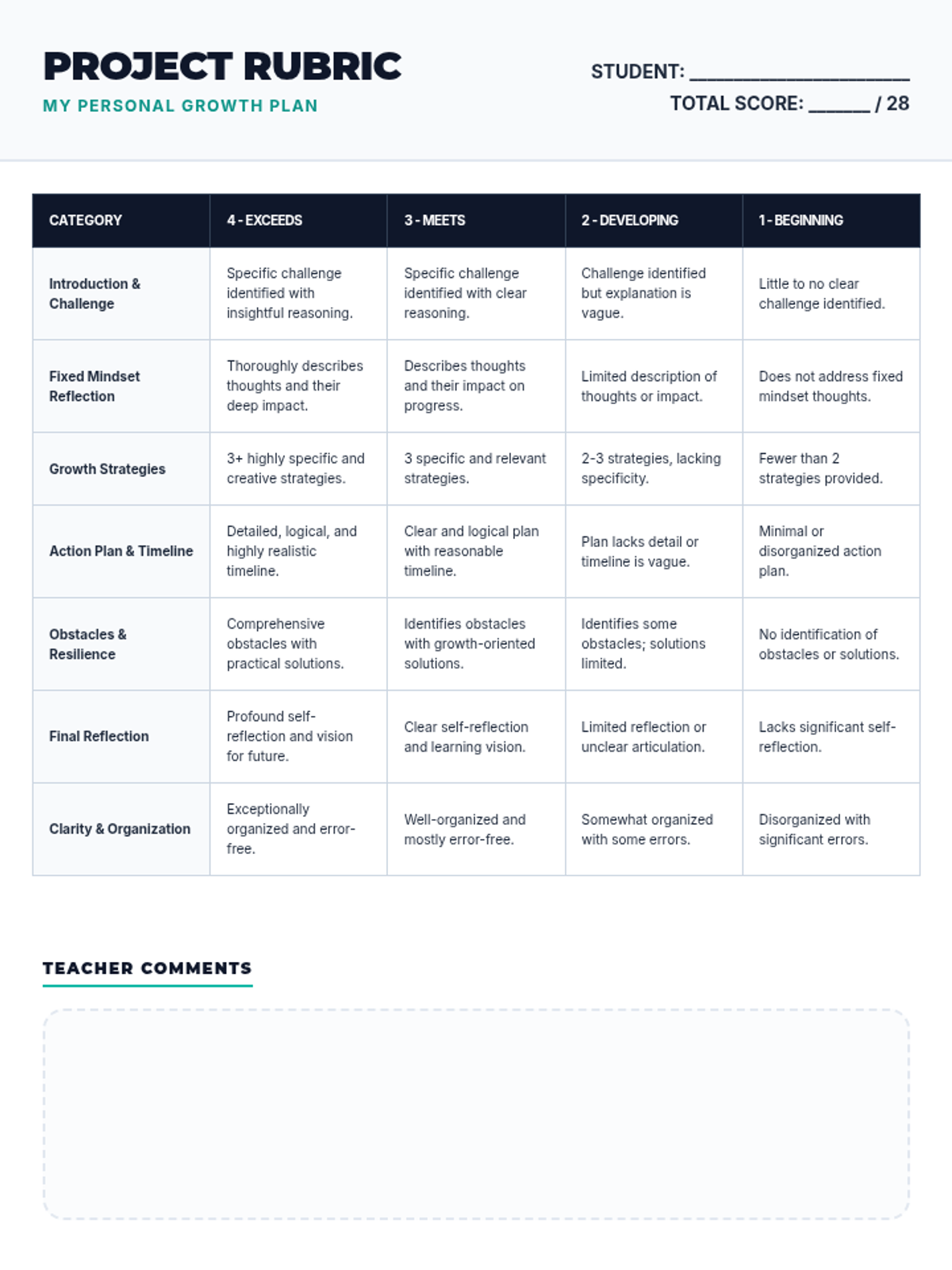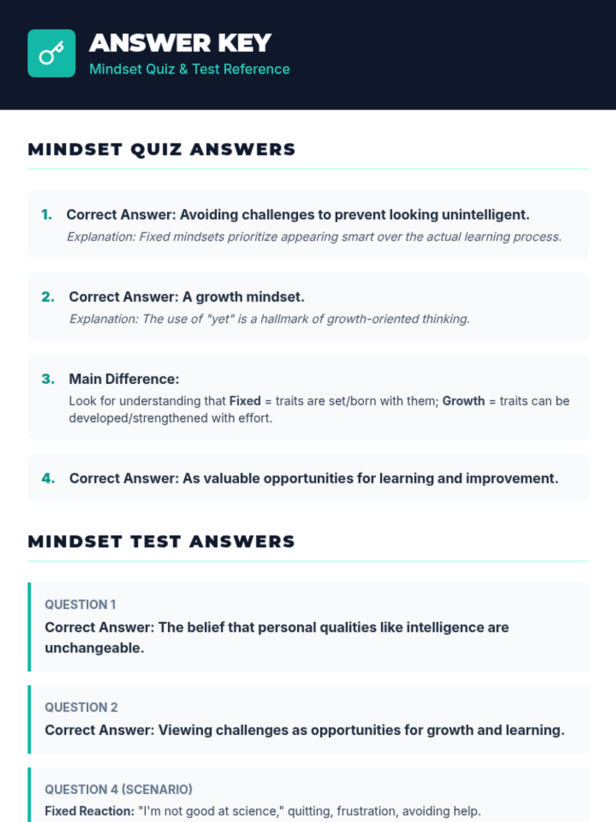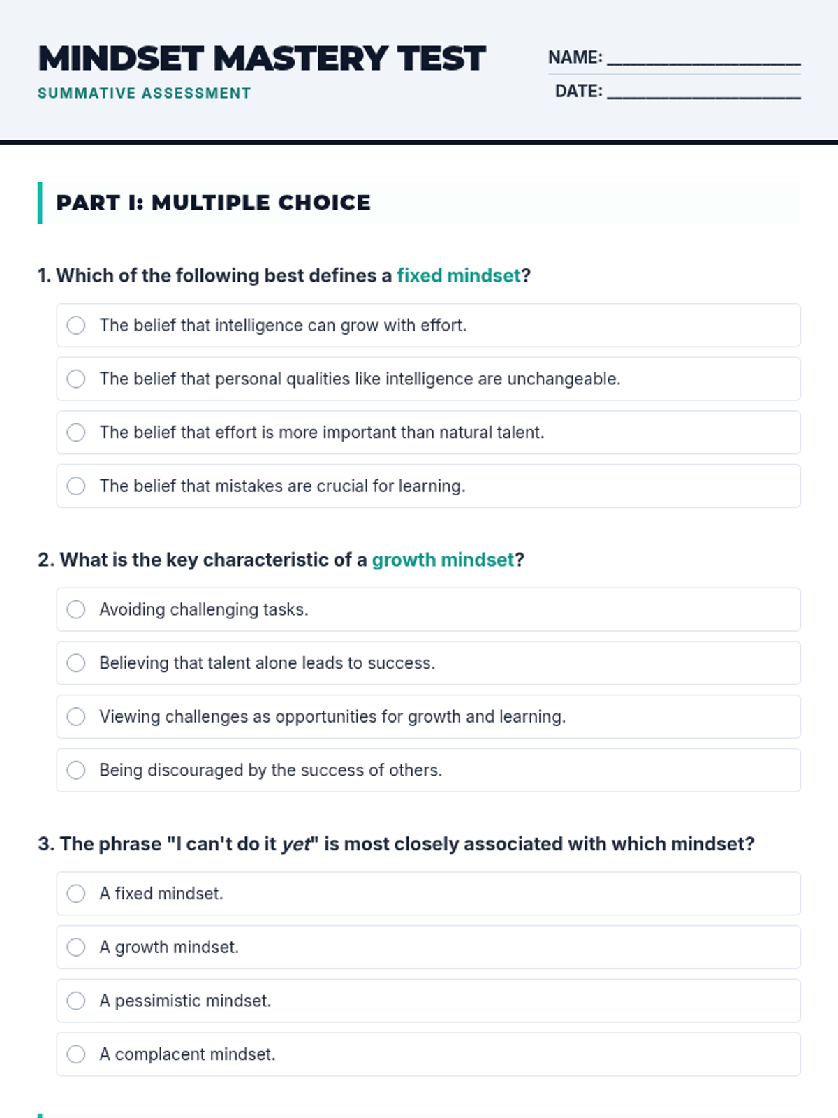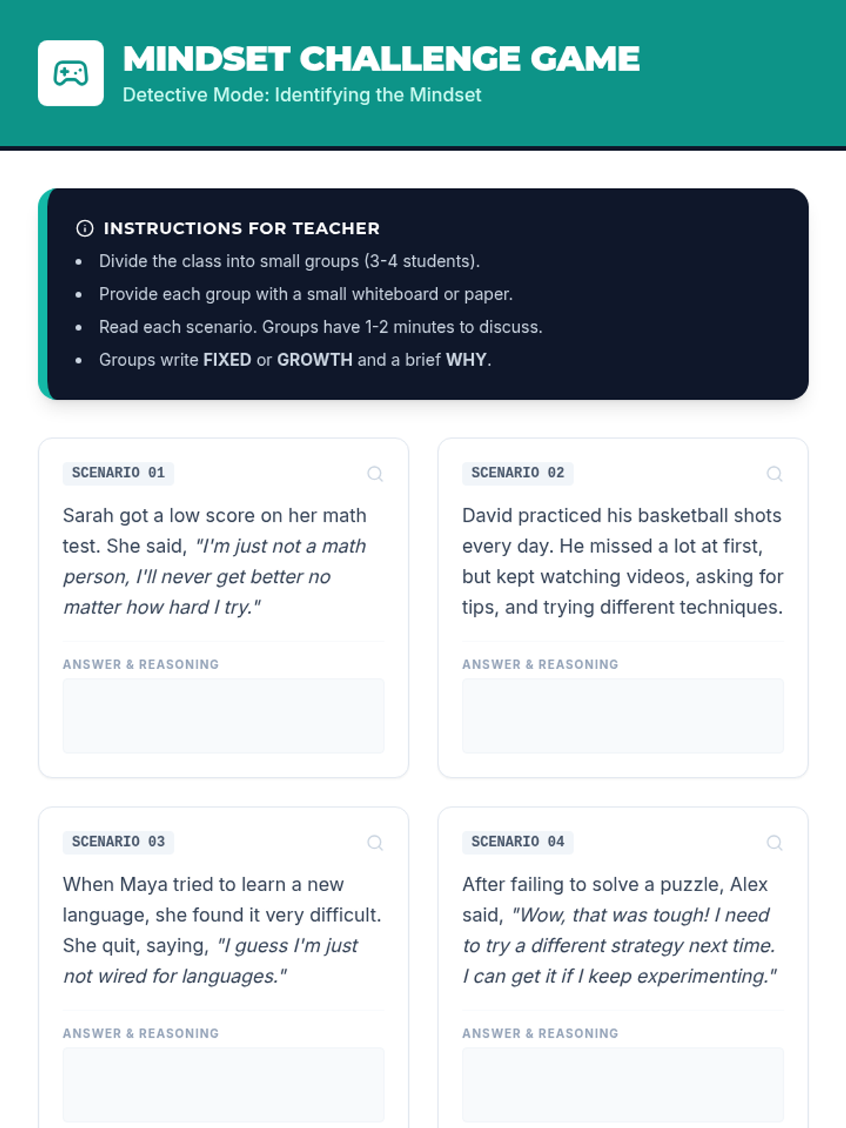 This comprehensive lesson introduces students to the concept of a growth mindset, helping them understand that their intelligence and abilities can develop through dedication and hard work. It's crucial for fostering resilience and a love for learning in all K-12 students. This single session is designed for a 1-hour class.