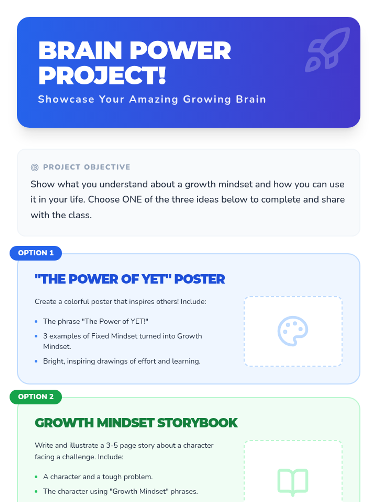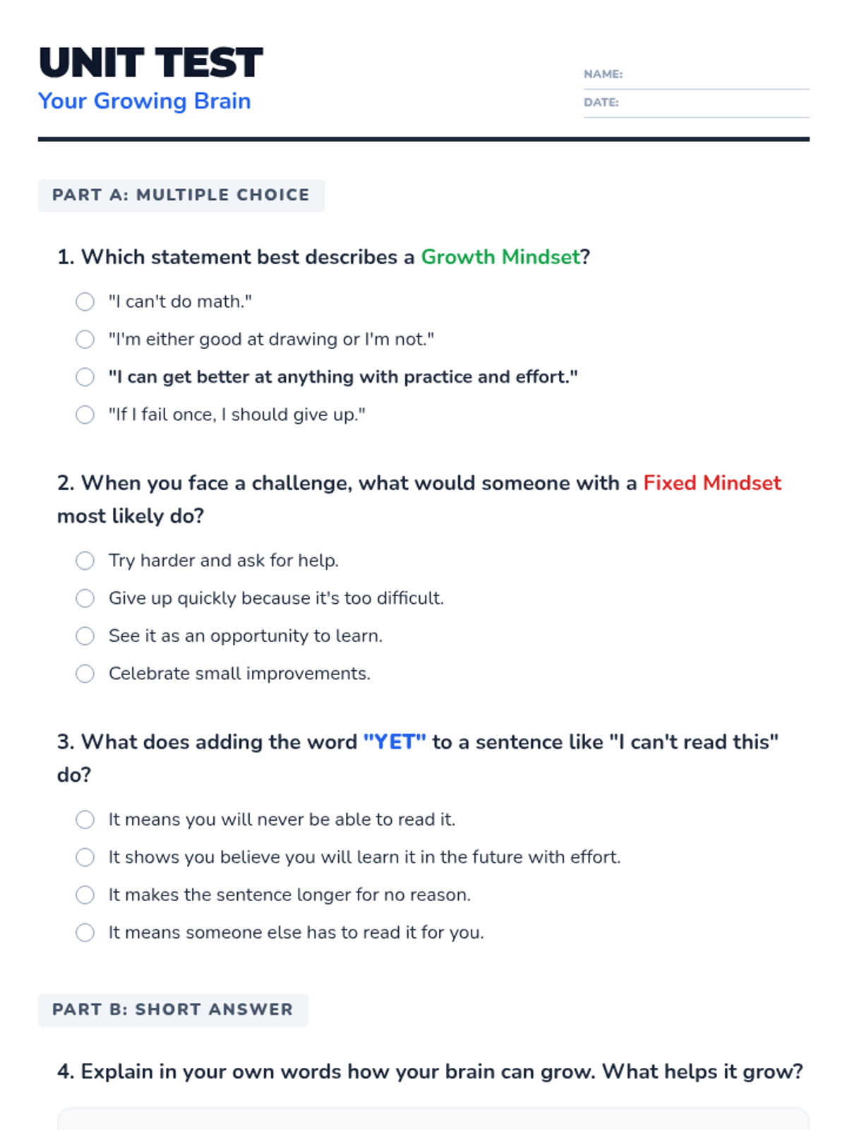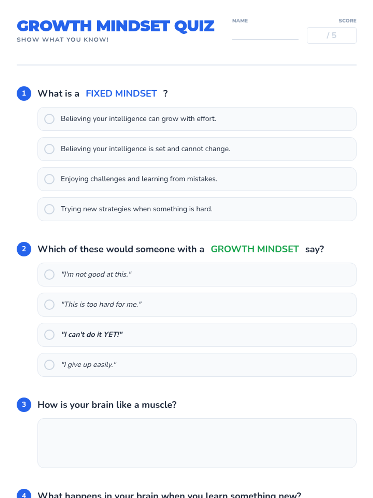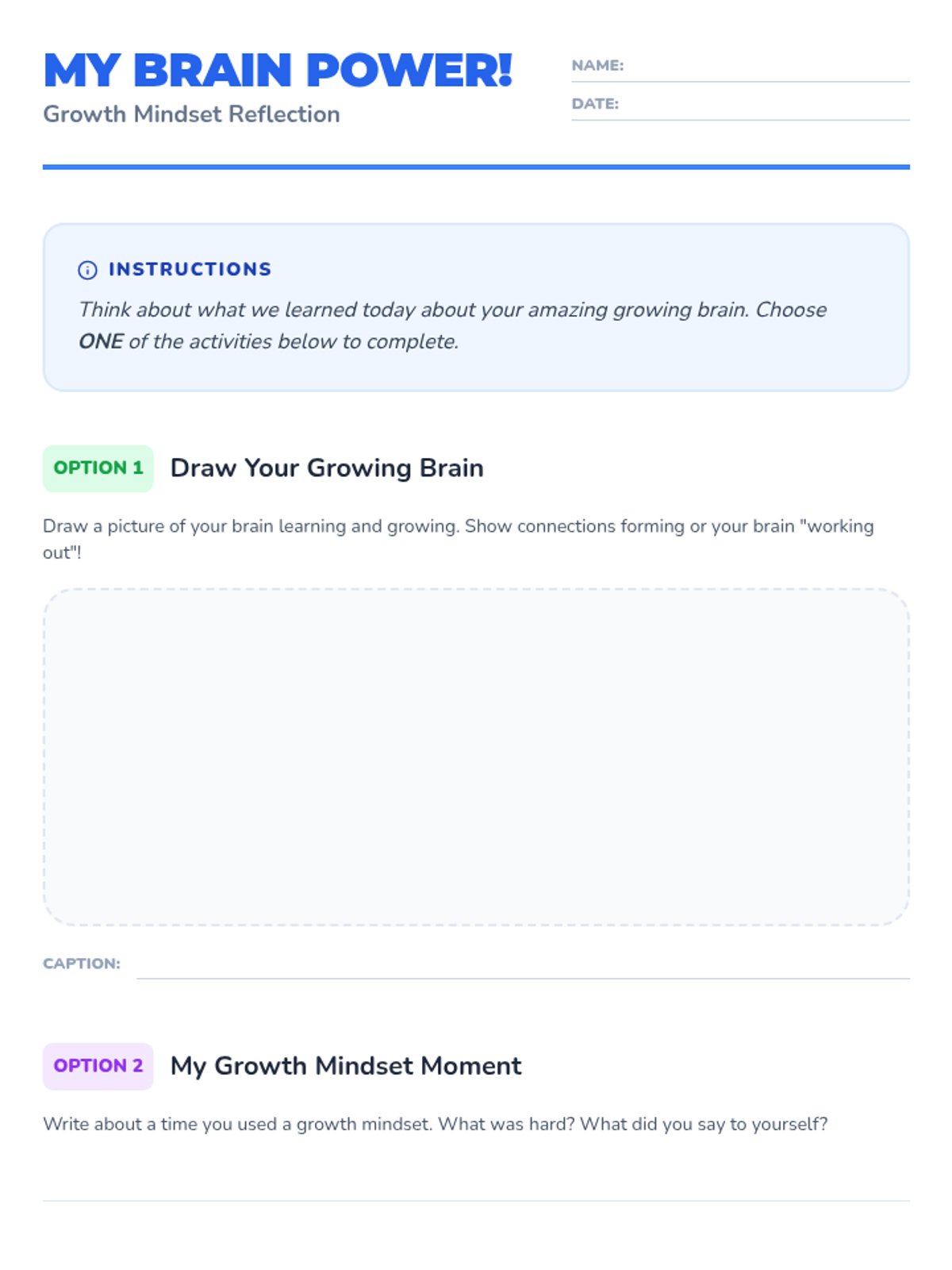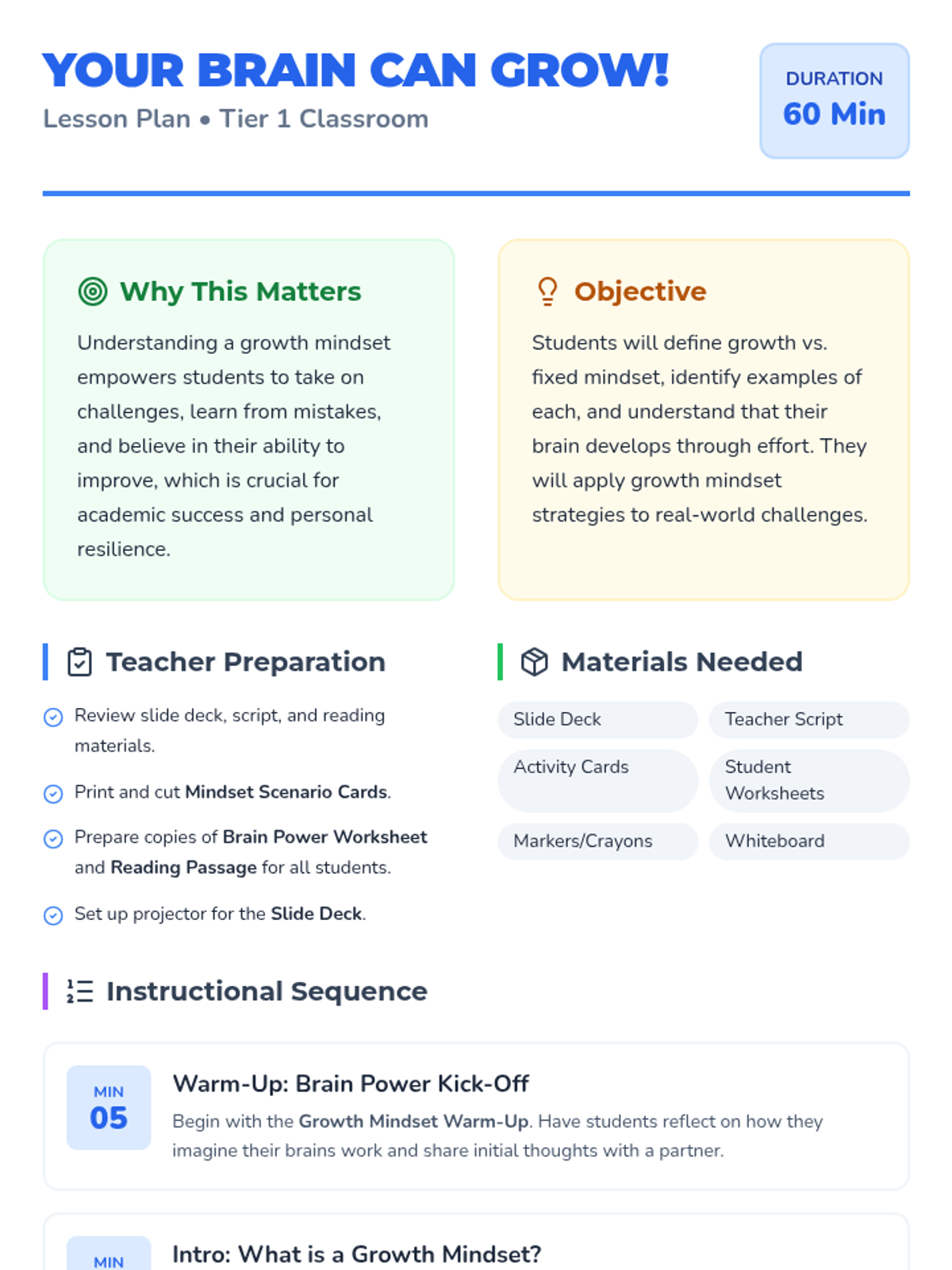 A 60-minute interactive lesson for elementary students that explores brain plasticity and the difference between fixed and growth mindsets through videos, reading, and role-play.