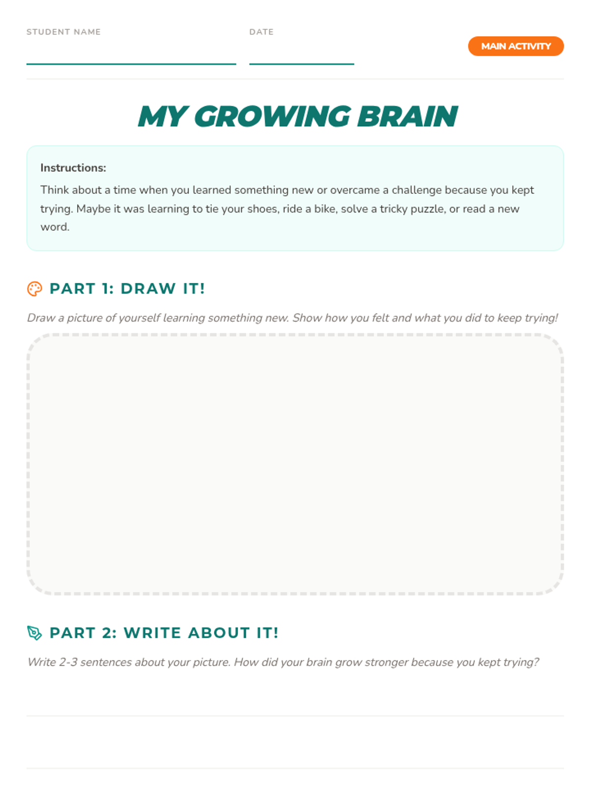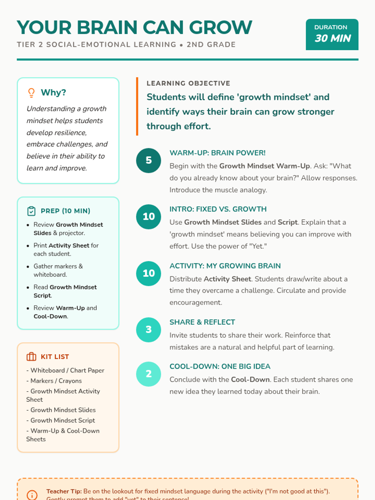 This Tier 2 small group lesson introduces 2nd-grade students to growth mindset, using the analogy of the brain as a muscle that grows with effort and practice.