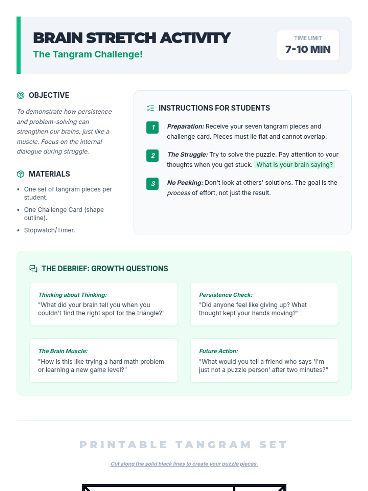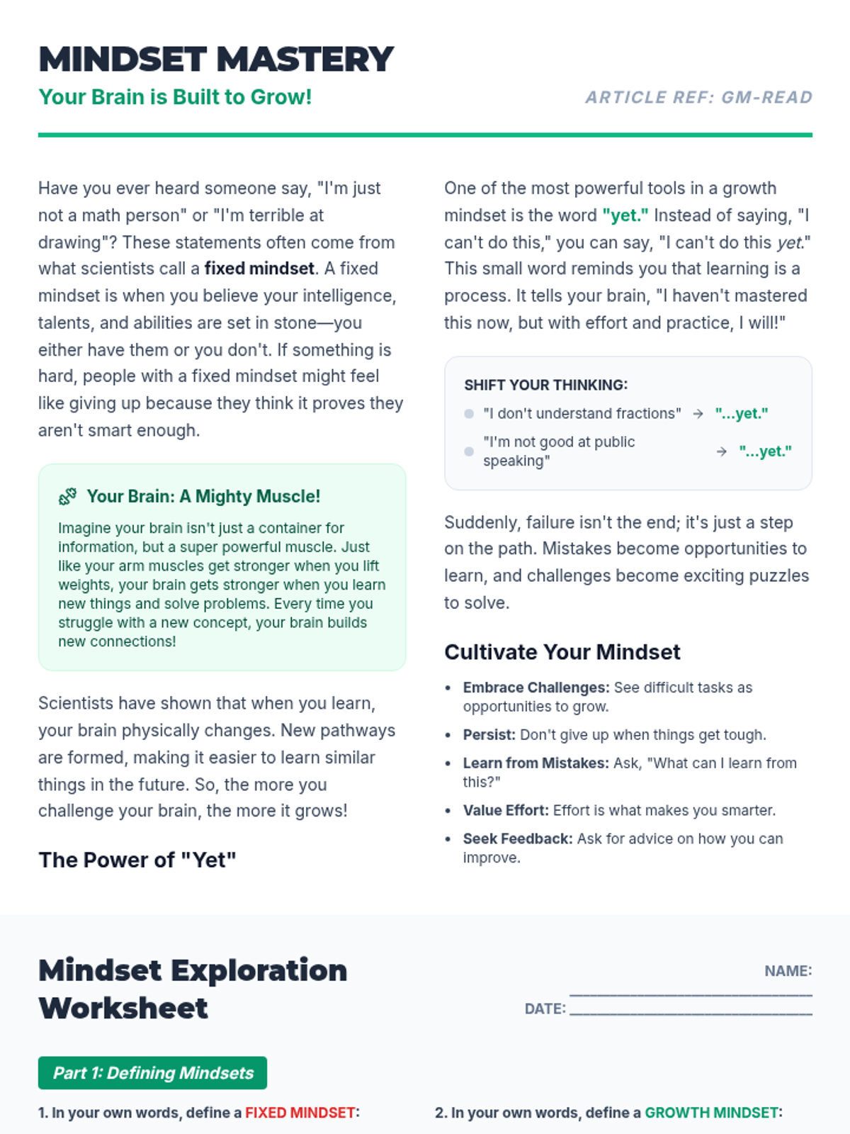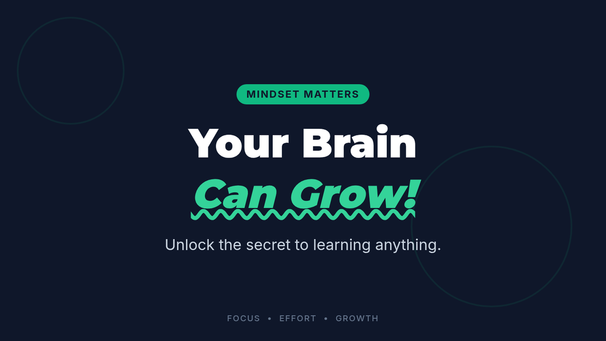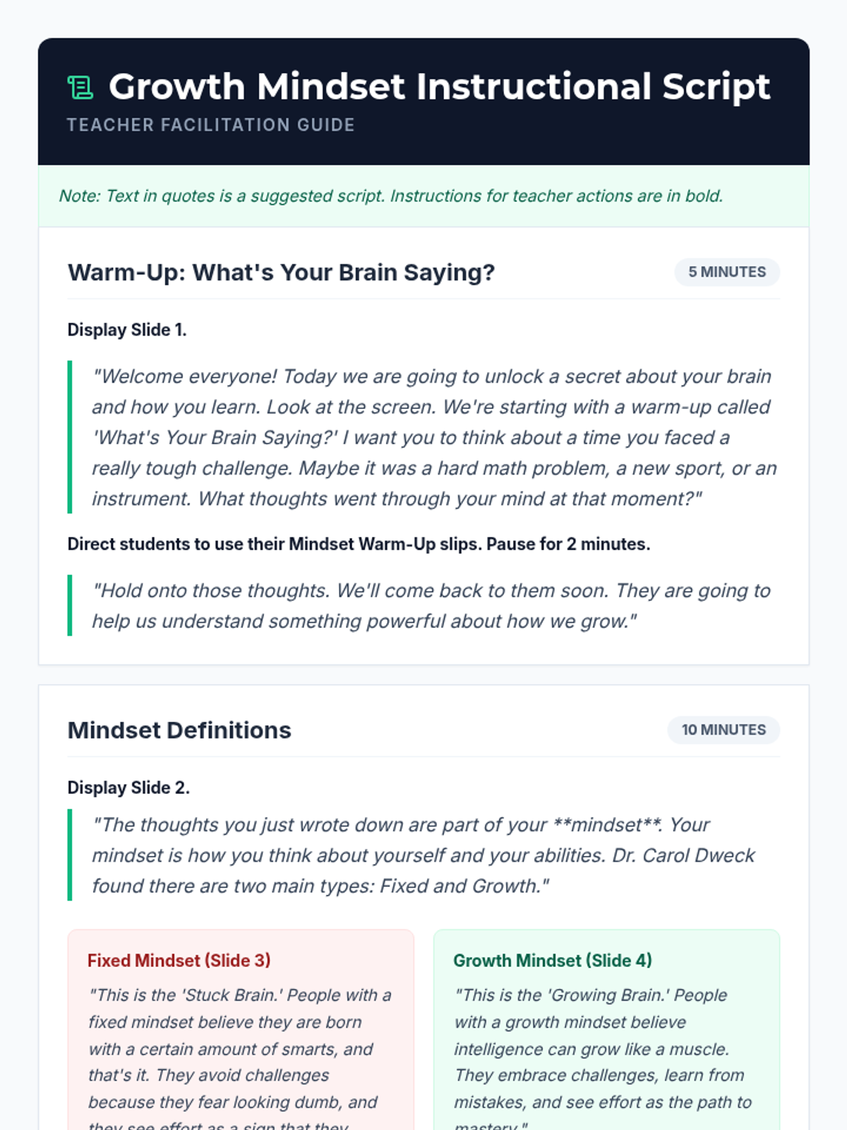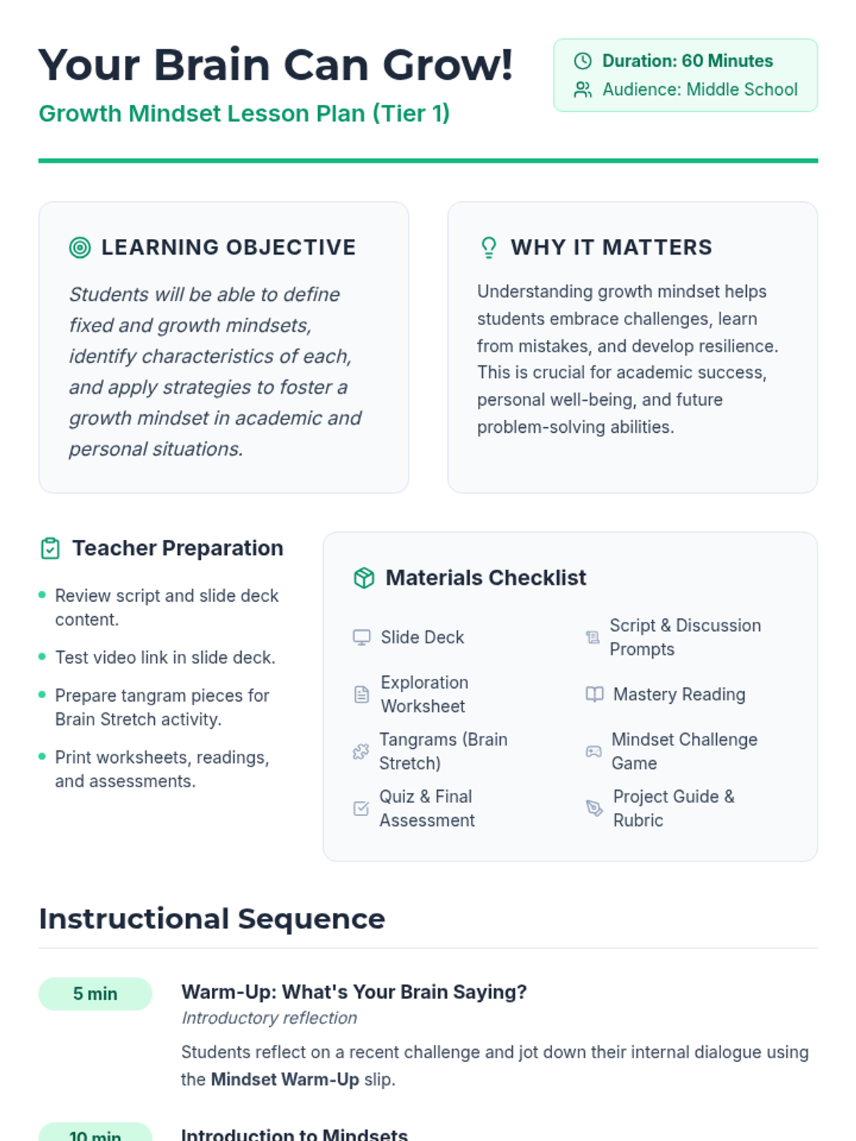 A comprehensive 1-hour lesson introducing middle school students to the concept of growth mindset through interactive discussion, video analysis, and hands-on activities. Students learn that their brain is like a muscle that grows with effort and persistence.