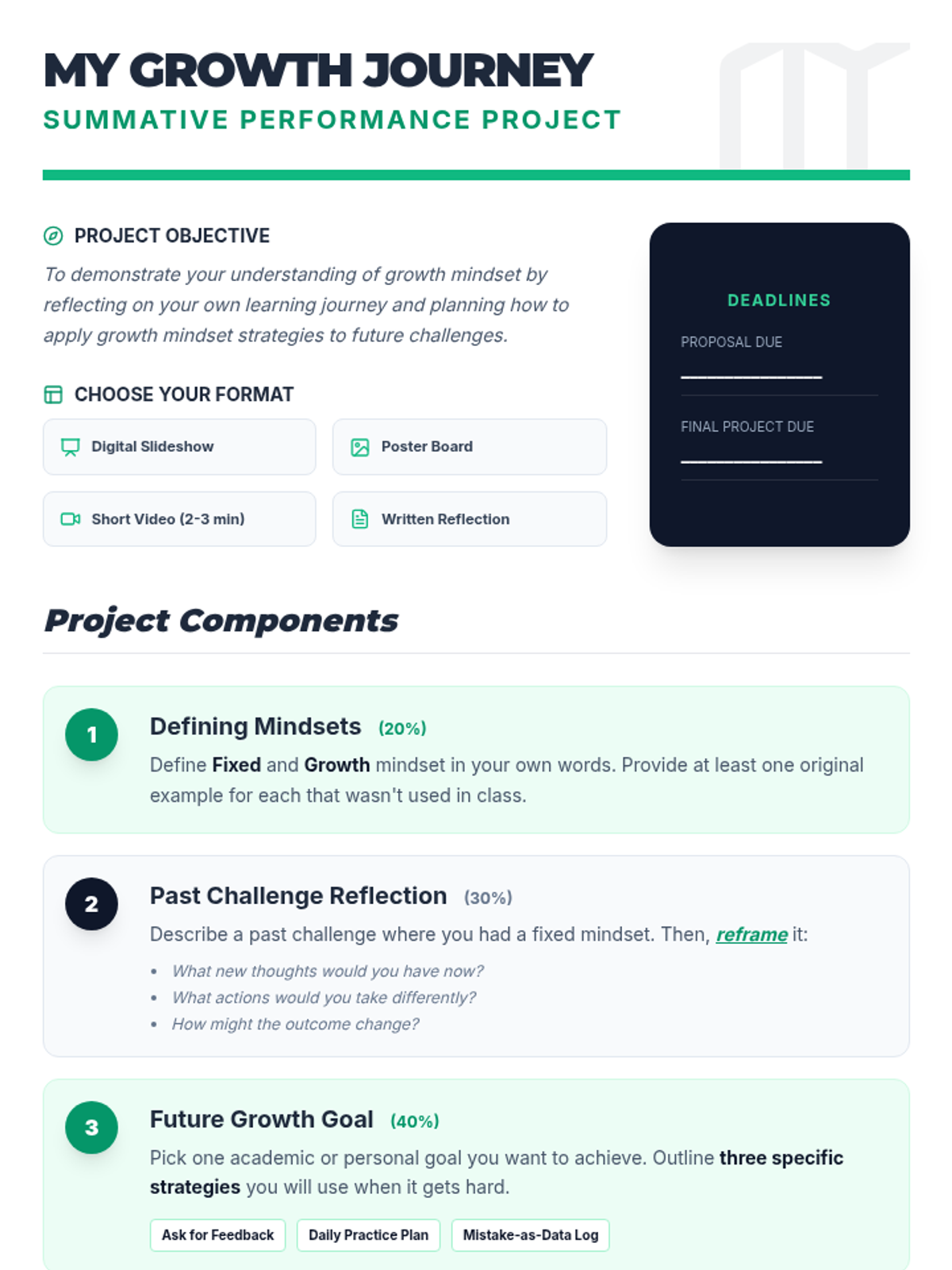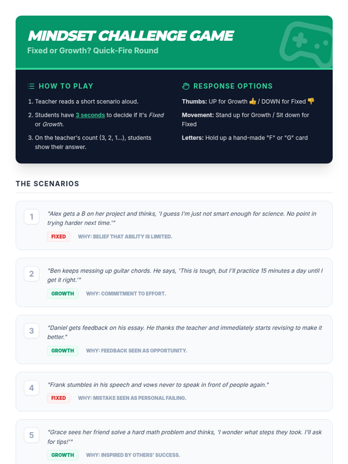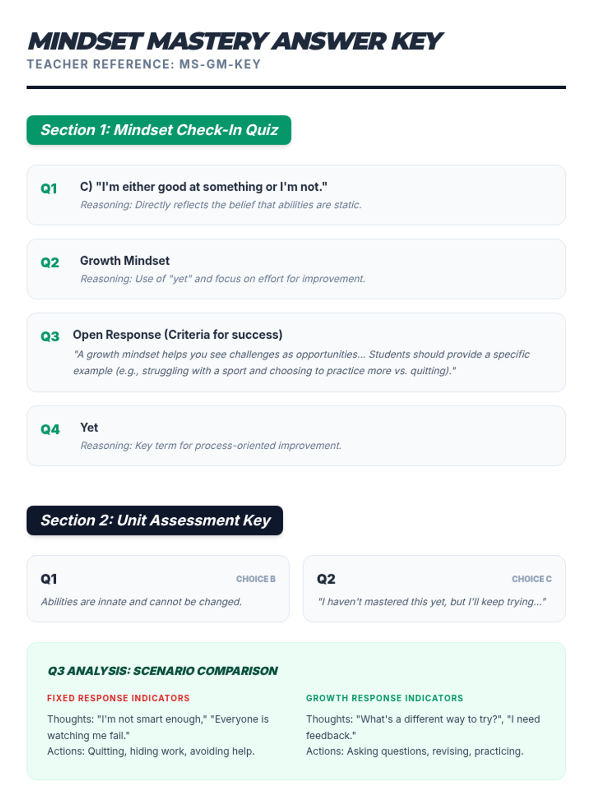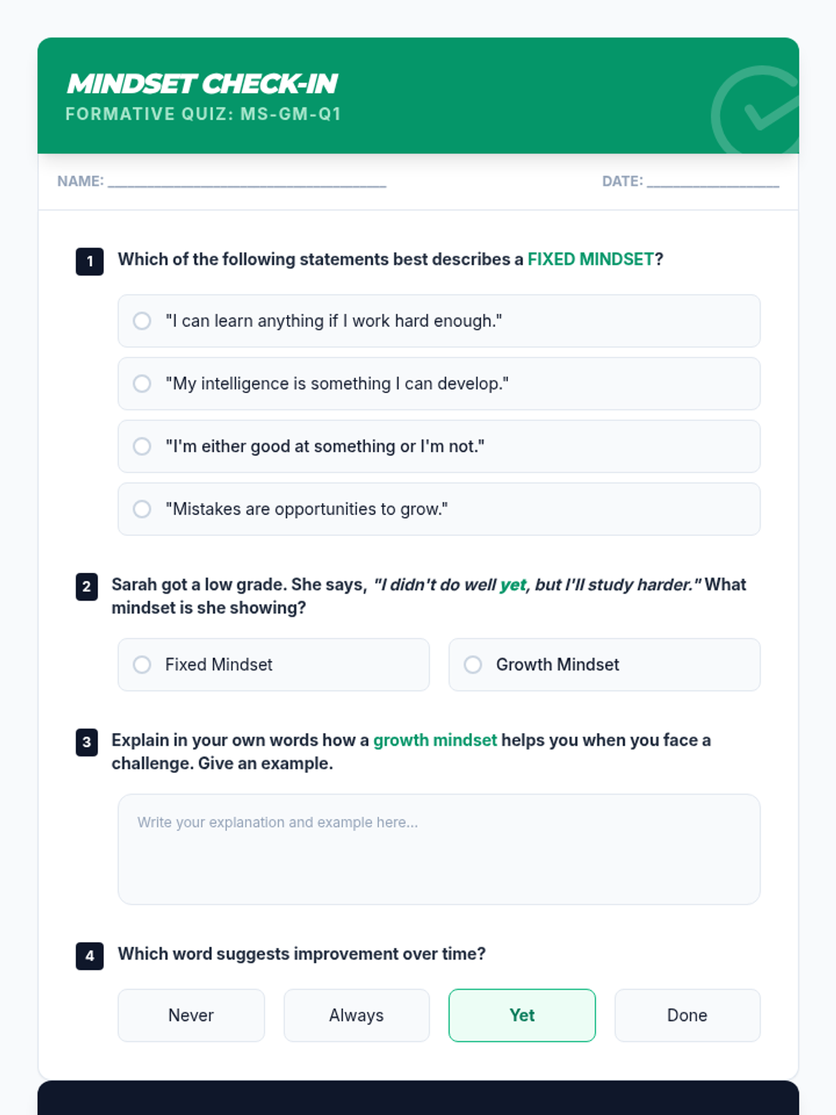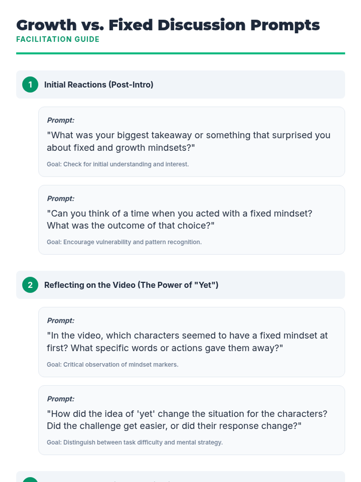A comprehensive 1-hour lesson introducing middle school students to the concept of growth mindset through interactive discussion, video analysis, and hands-on activities. Students learn that their brain is like a muscle that grows with effort and persistence.