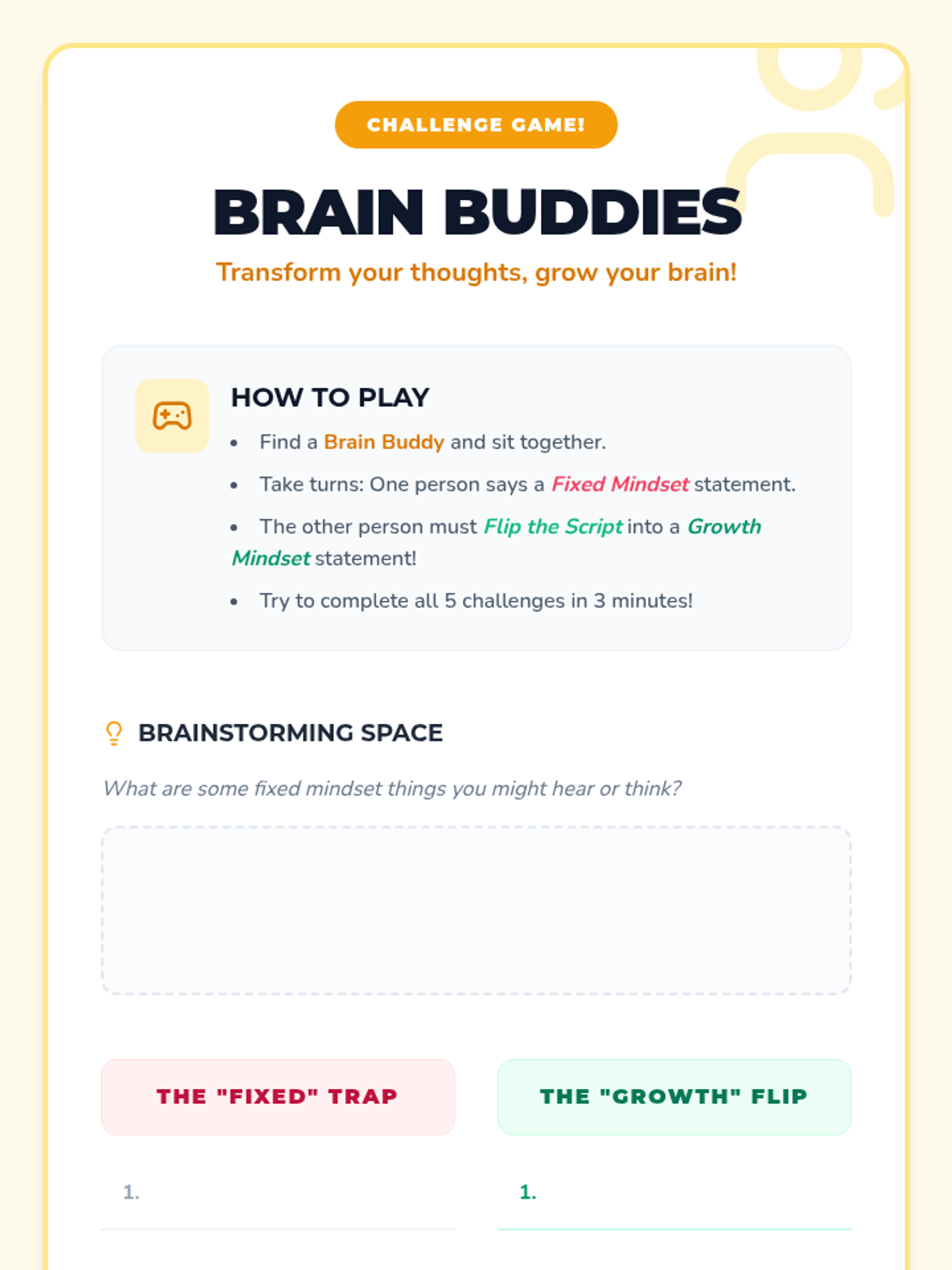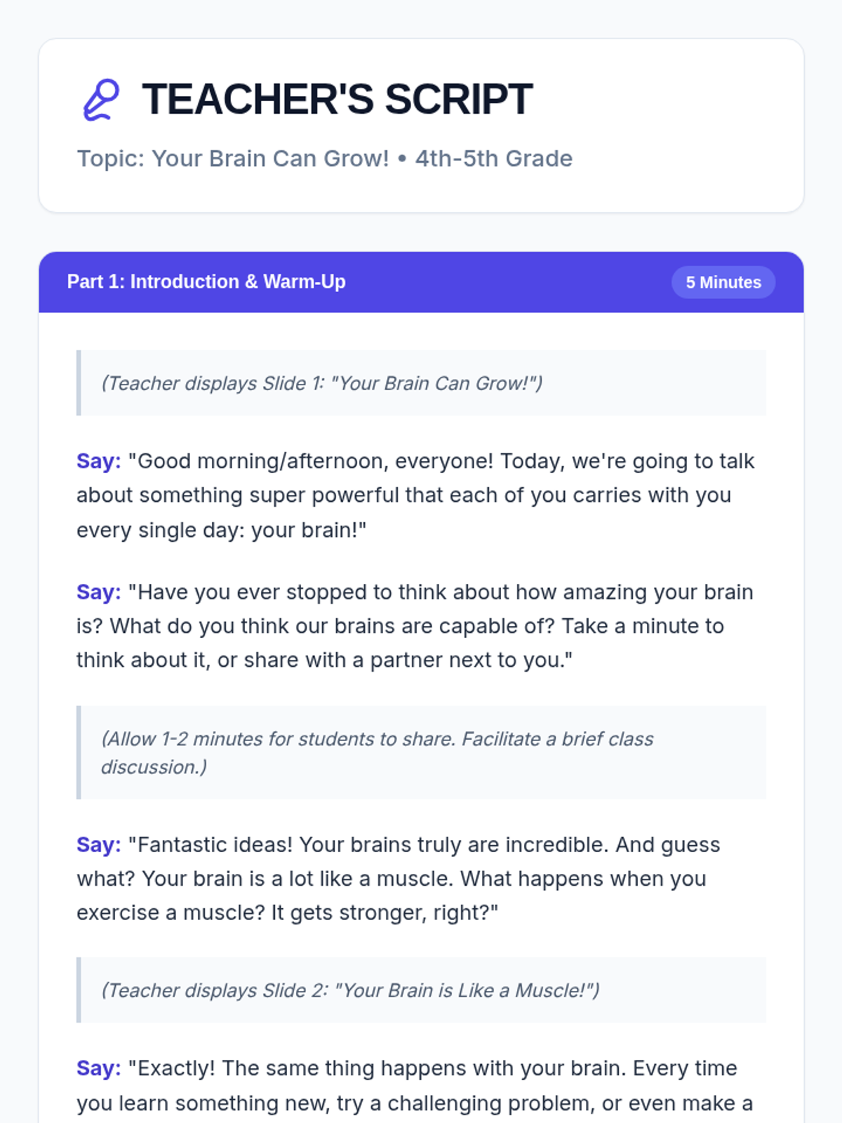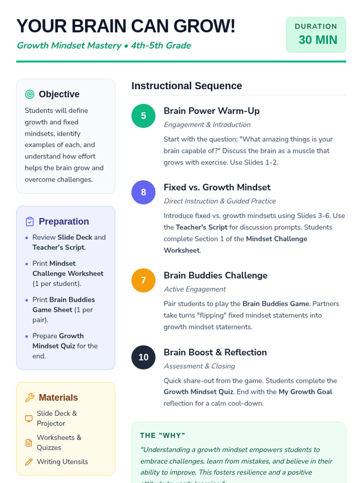 This 30-minute lesson introduces 4th-5th grade students to the concept of a growth mindset, helping them understand that their intelligence and abilities can develop through effort and learning. This lesson is crucial for fostering resilience and a love for learning in young students. Designed for a single classroom session.