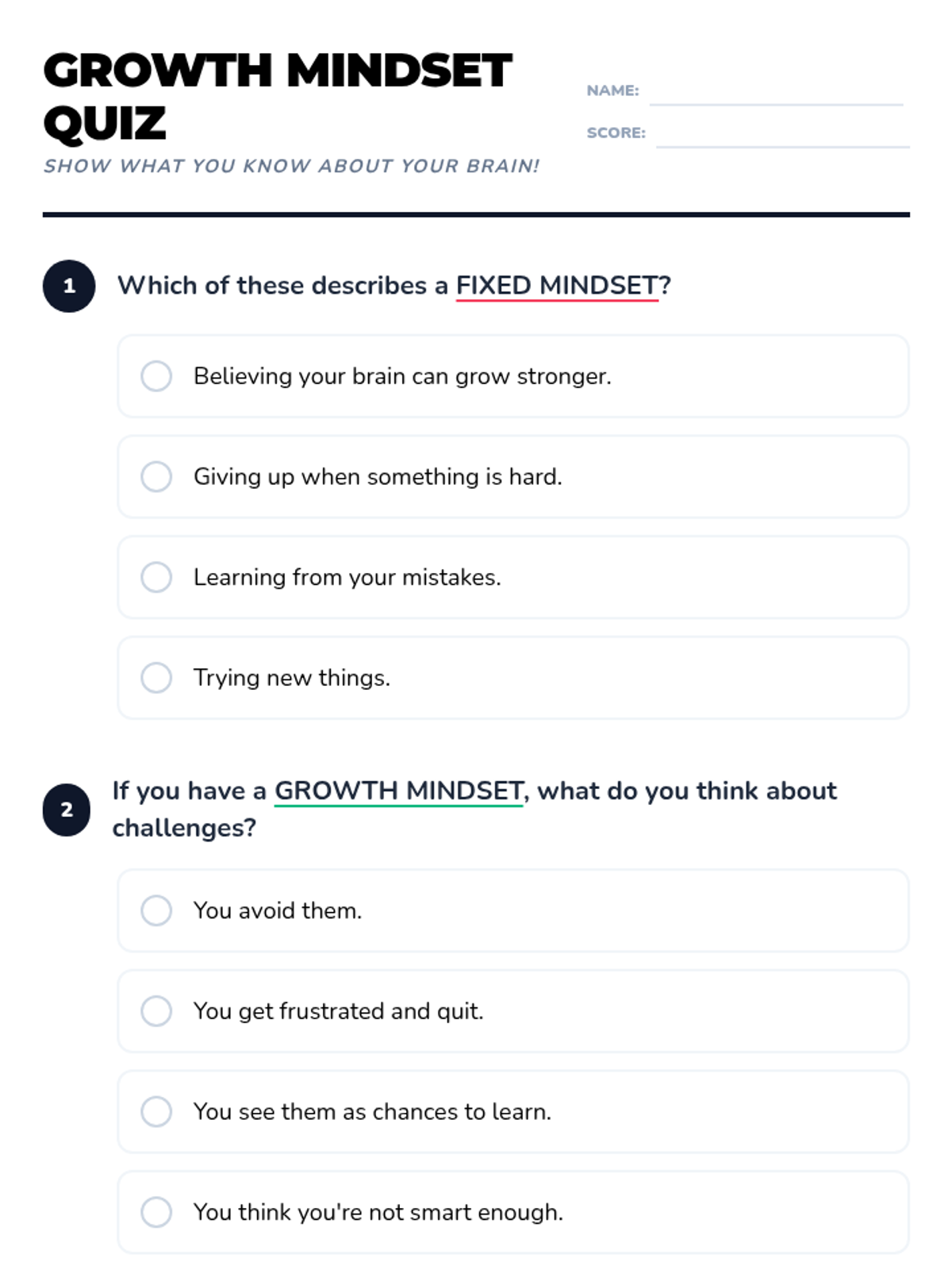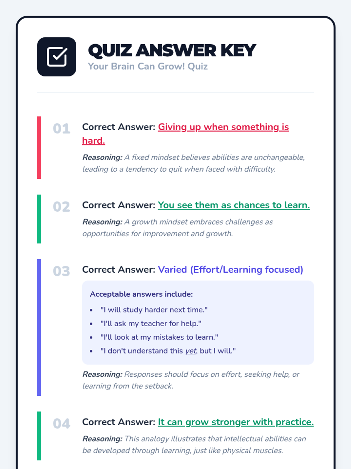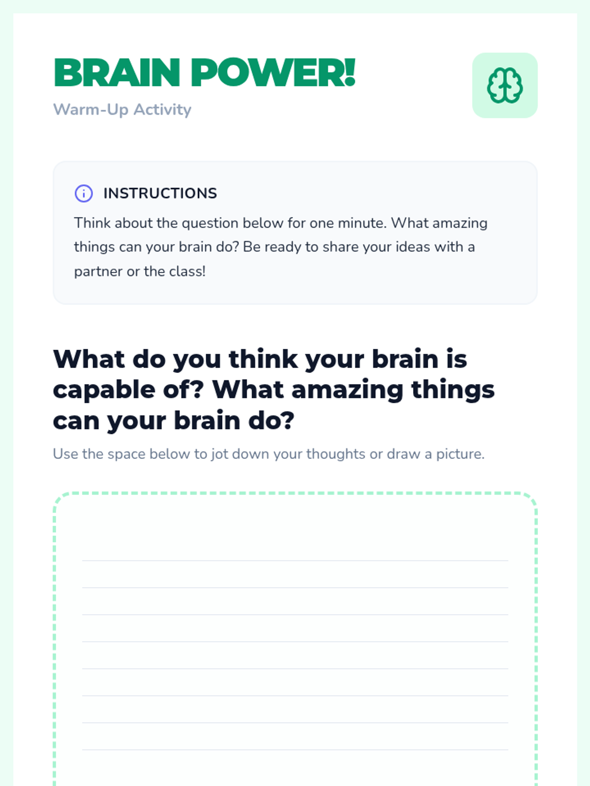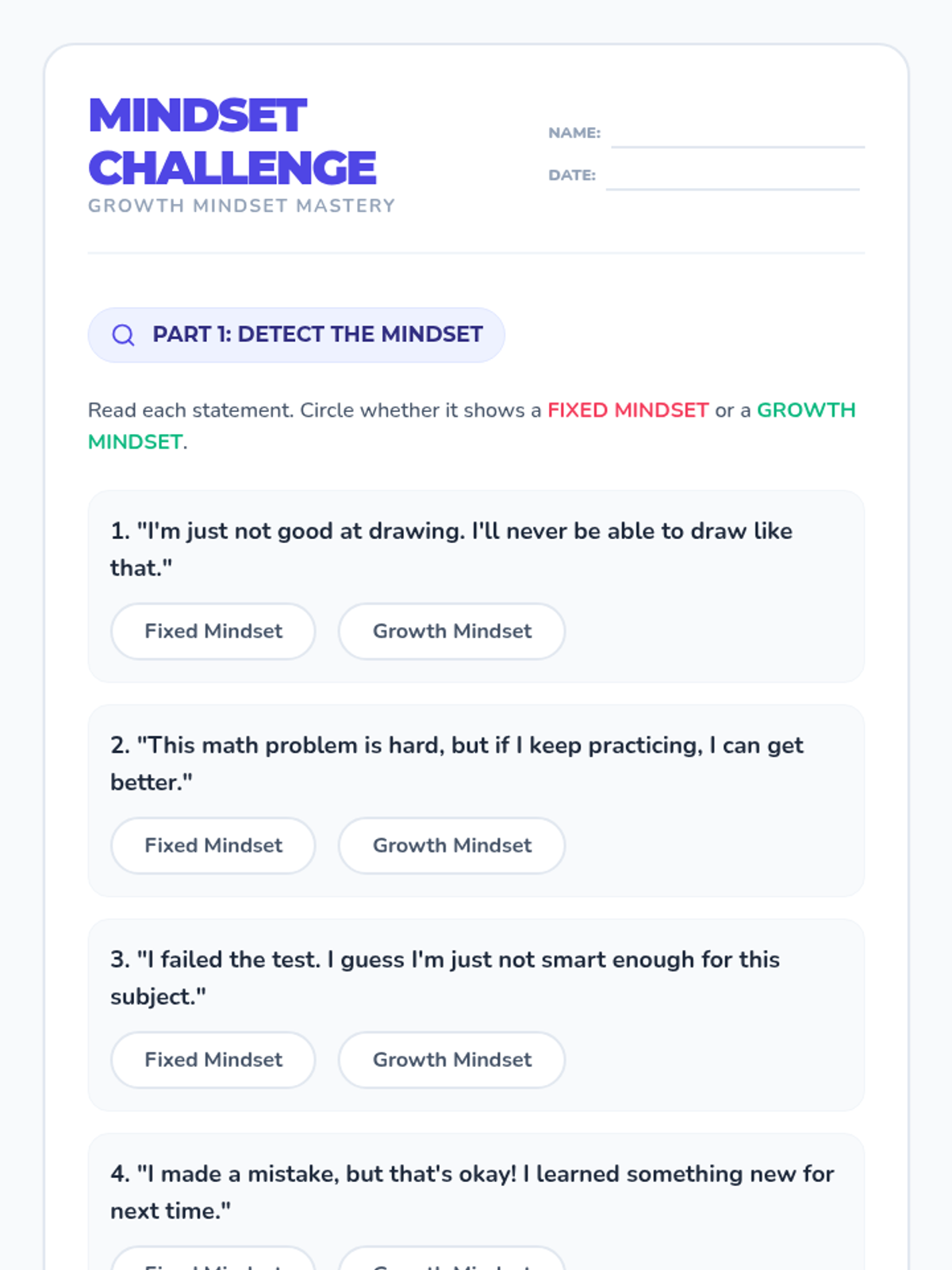 This 30-minute lesson introduces 4th-5th grade students to the concept of a growth mindset, helping them understand that their intelligence and abilities can develop through effort and learning. This lesson is crucial for fostering resilience and a love for learning in young students. Designed for a single classroom session.