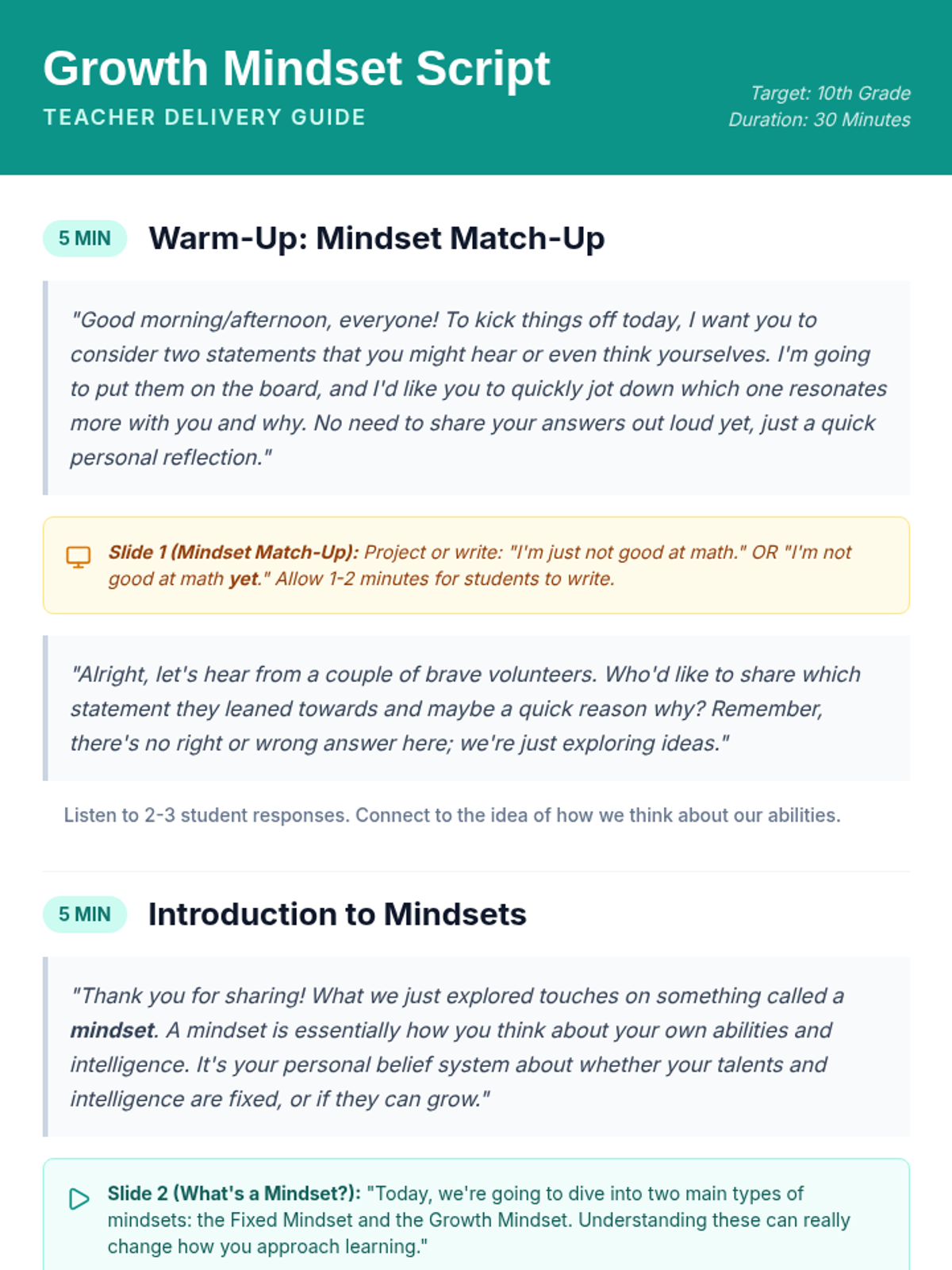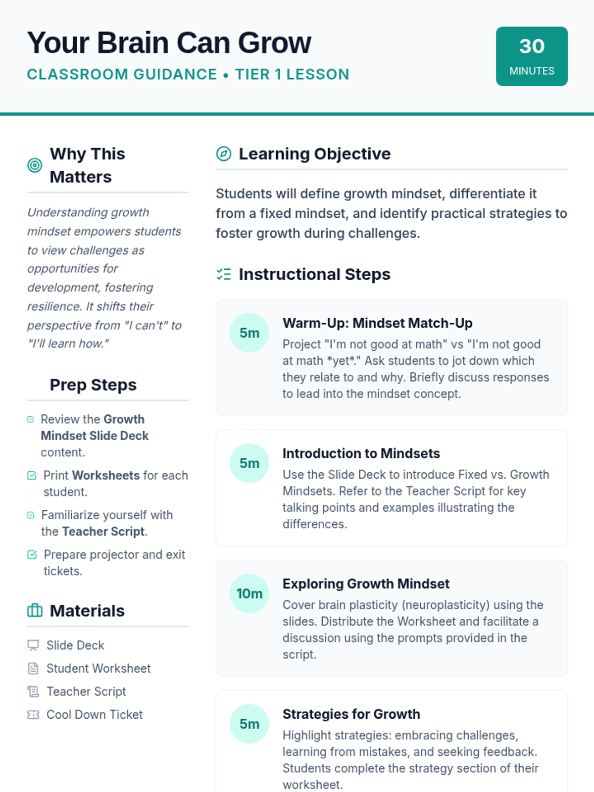 This lesson introduces 10th-grade students to the concept of a growth mindset, helping them understand how their brains can develop and change over time through neuroplasticity. Students will learn the difference between fixed and growth mindsets and explore practical strategies for academic and personal success.