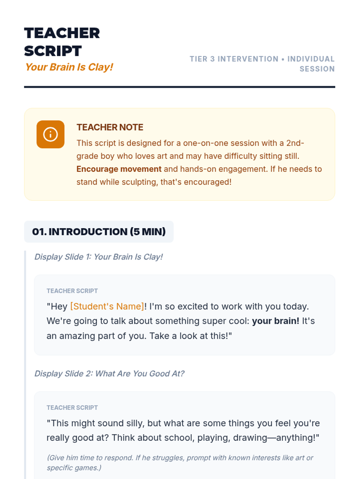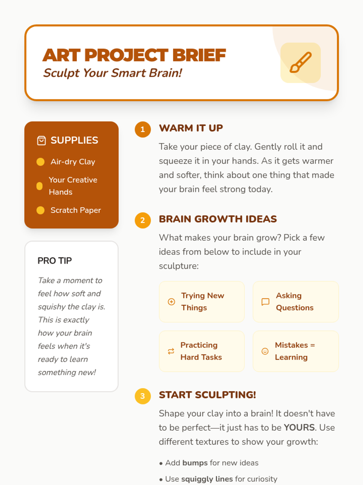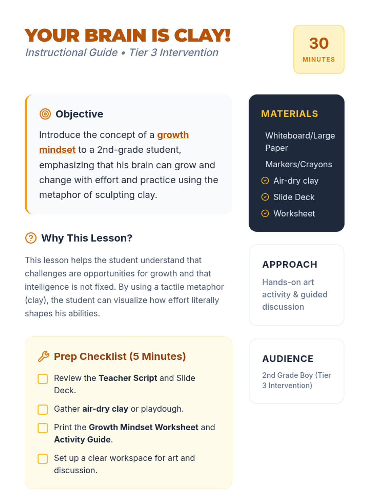 This 30-minute individual lesson for a 2nd-grade student uses the metaphor of clay to teach growth mindset. Through hands-on sculpting and discussion, students learn that effort and practice shape their brains and intelligence.