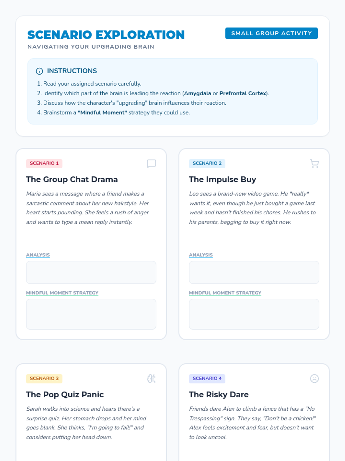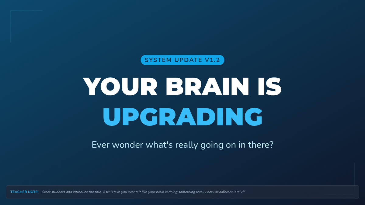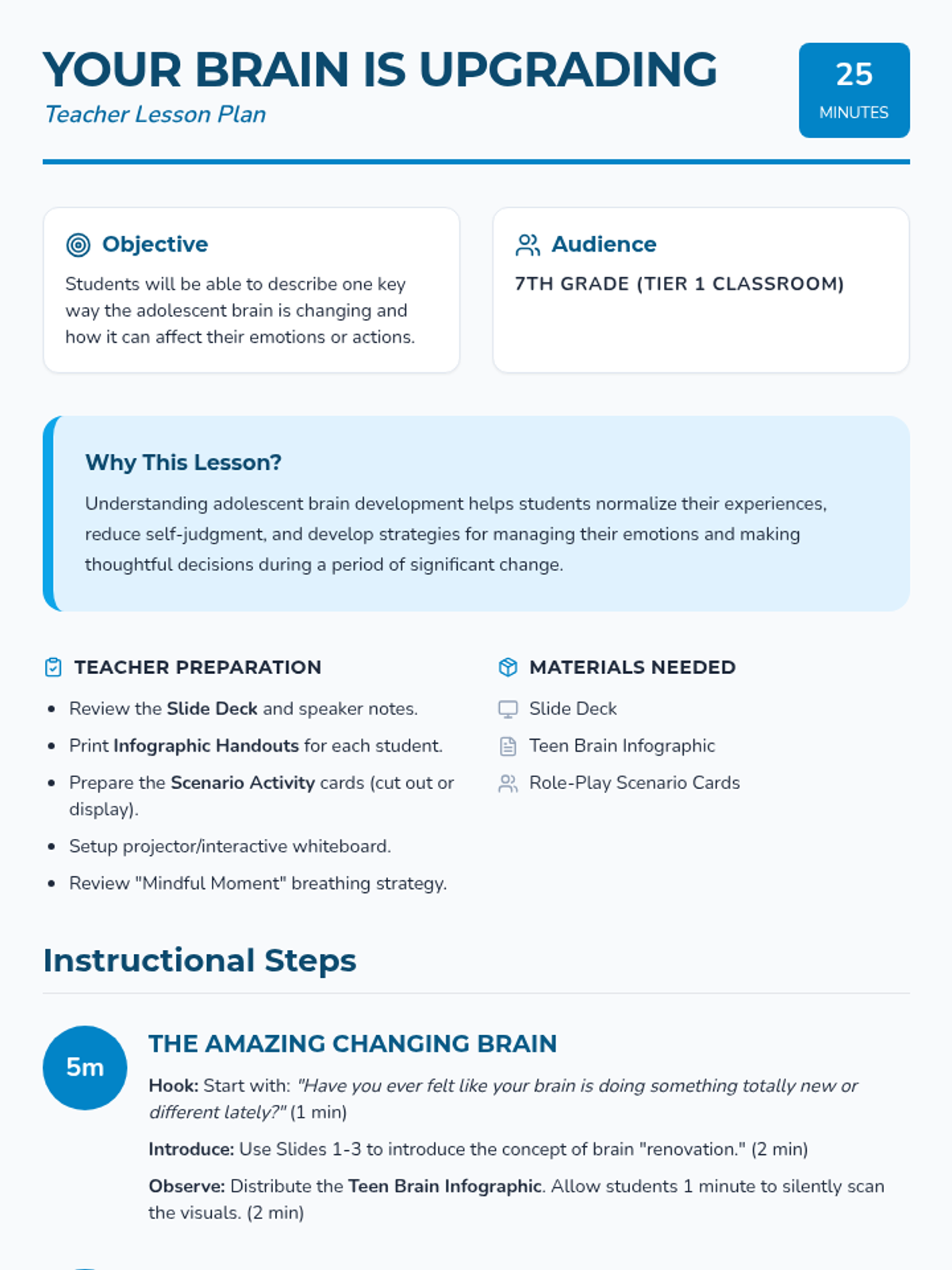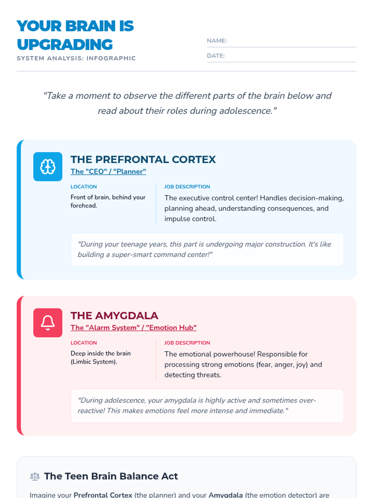 A 25-minute lesson helping 7th graders understand adolescent brain development, focusing on the prefrontal cortex and amygdala to improve self-awareness and emotional regulation.
