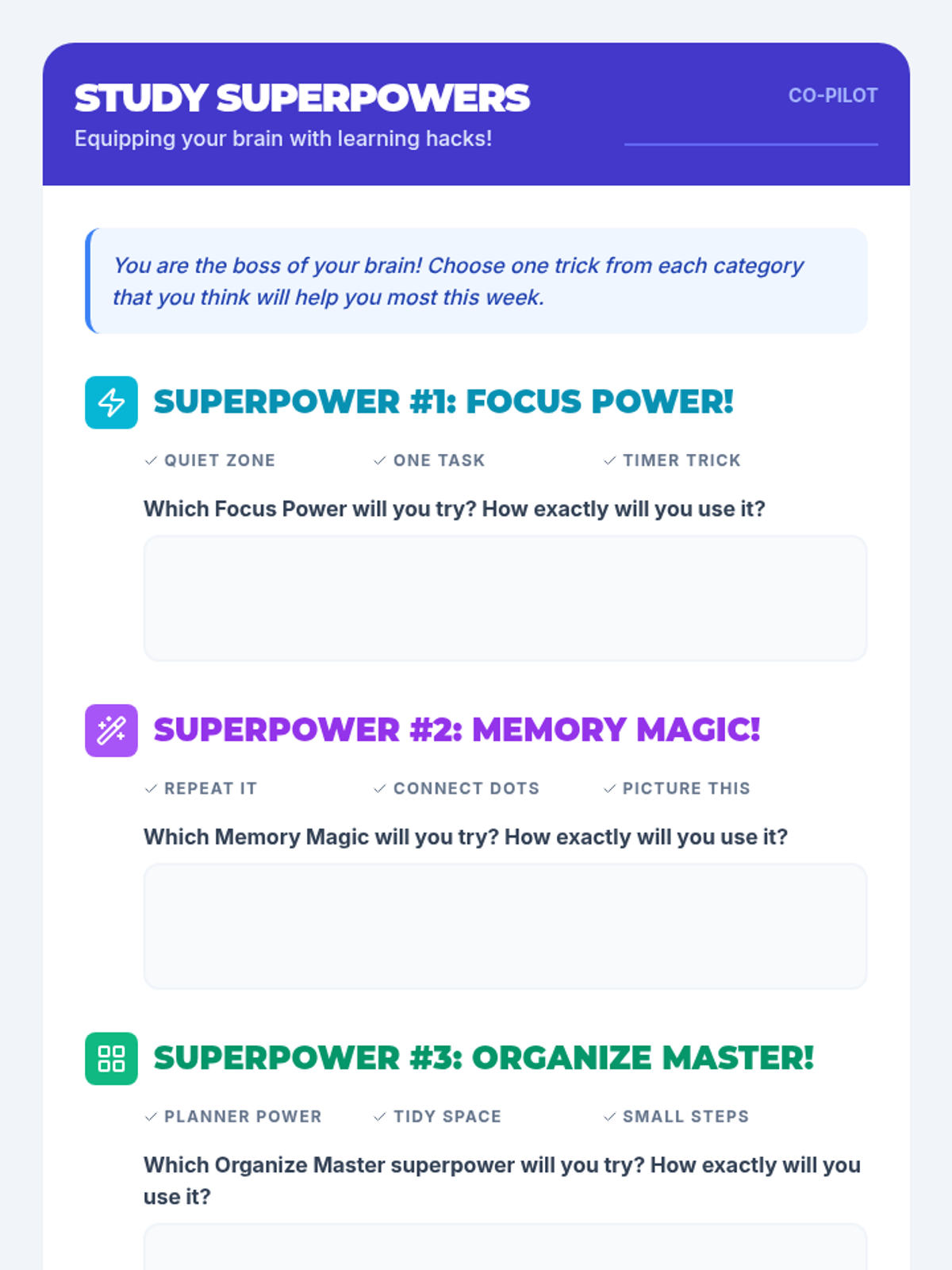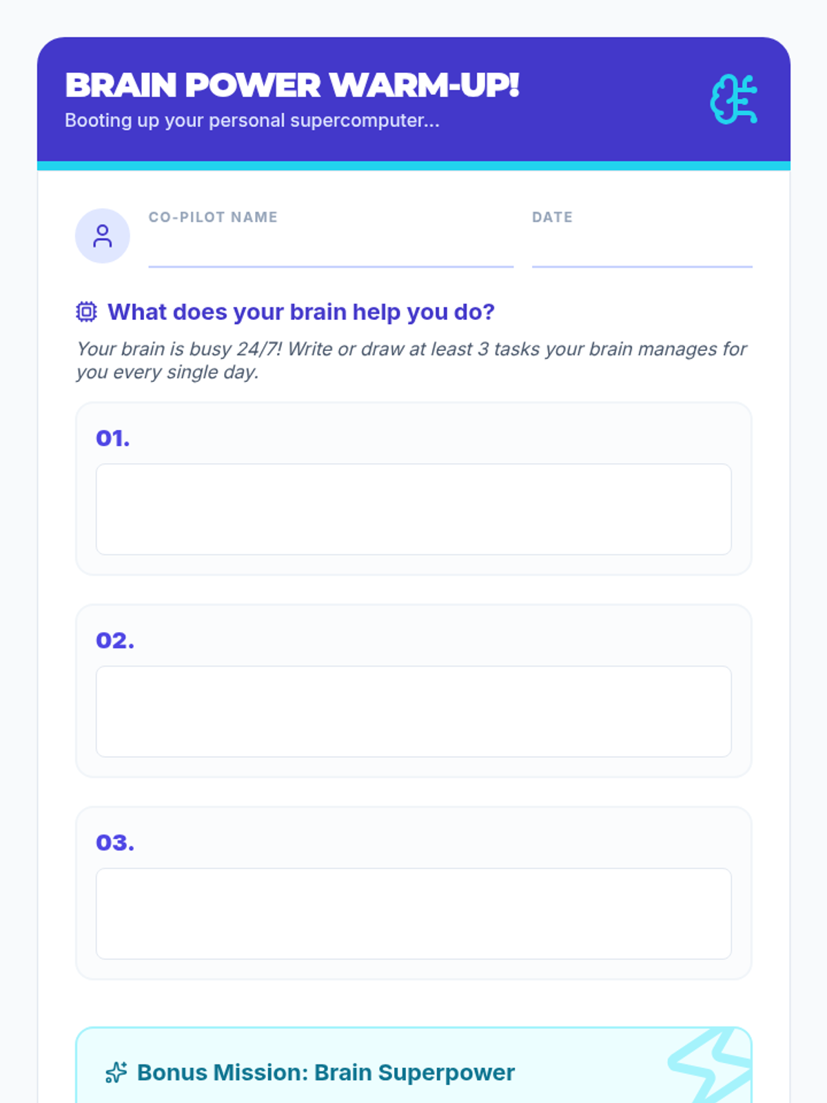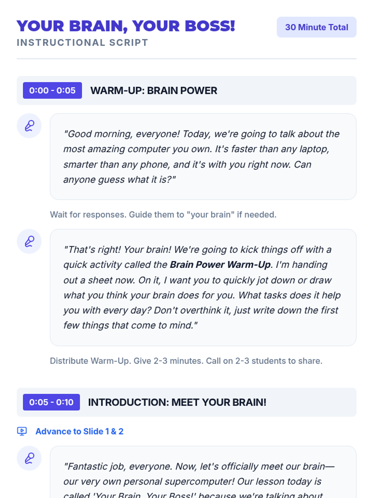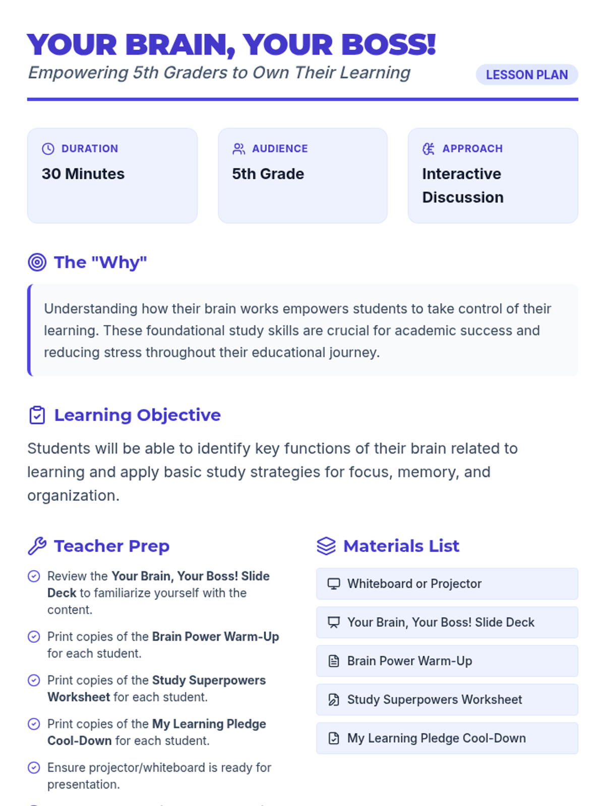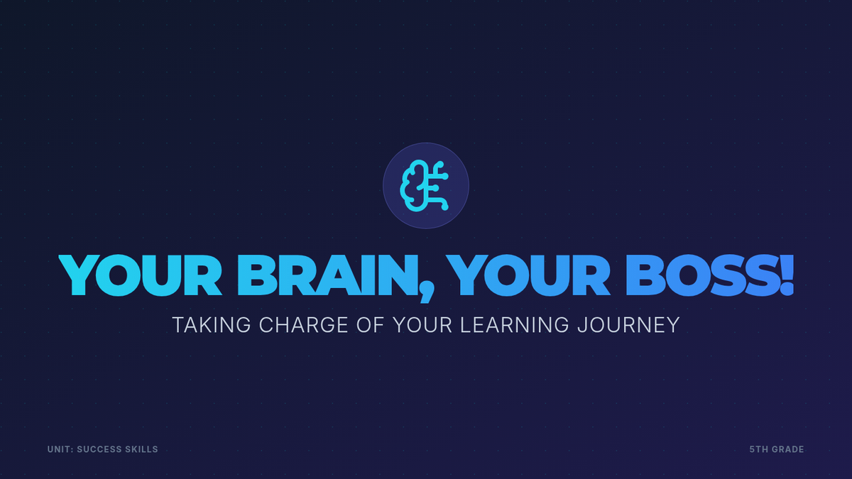 A 30-minute lesson for 5th graders that teaches how the brain works as a 'boss' supercomputer and introduces practical study skills for focus, memory, and organization.
