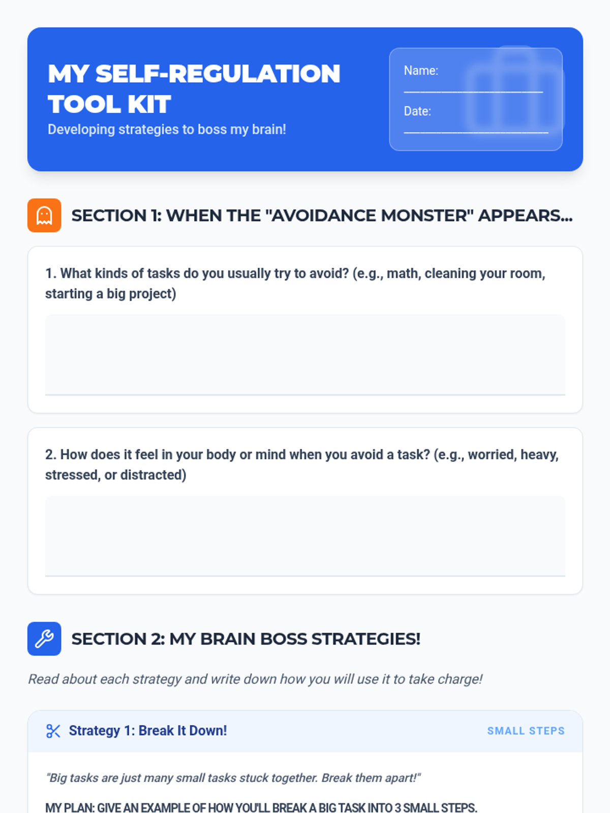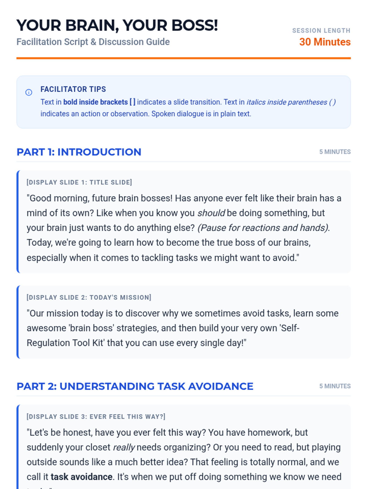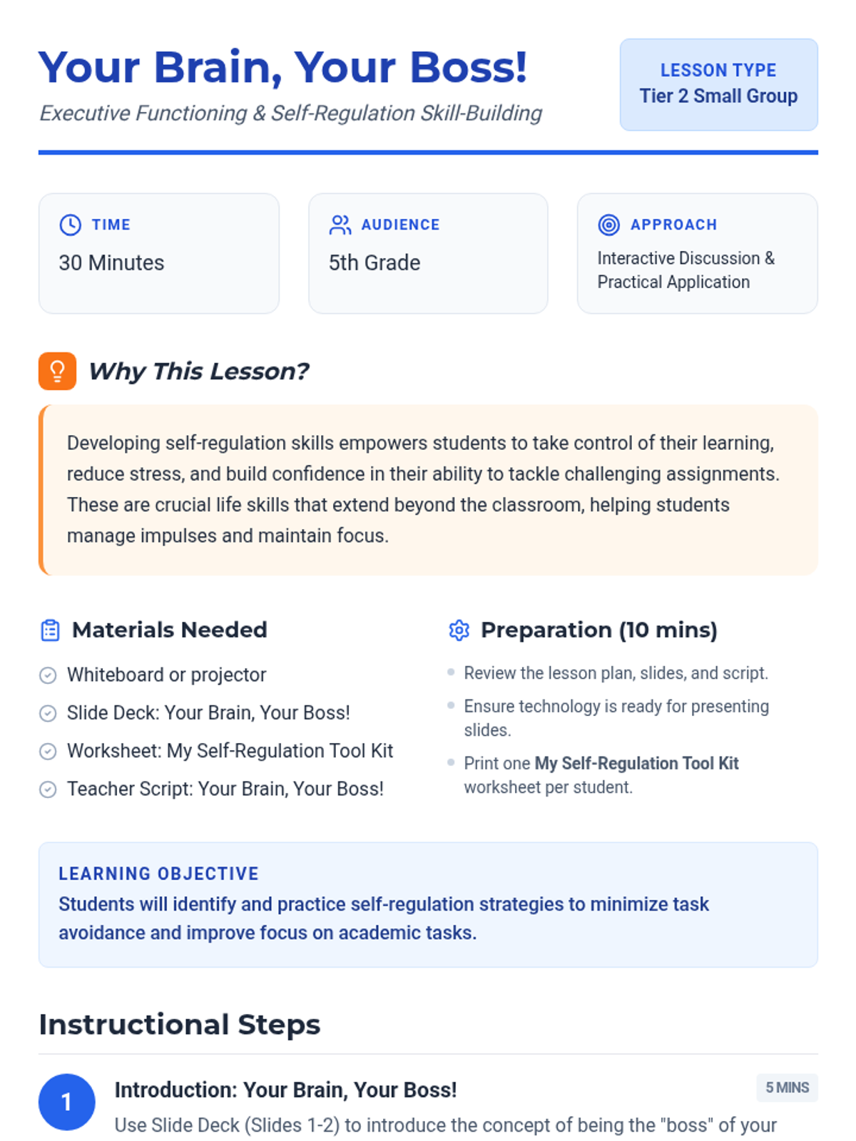 A small-group lesson for 5th graders focused on developing self-regulation strategies to overcome task avoidance and improve focus. Students learn to 'boss' their brains using tools like breaking down tasks, timers, and positive self-talk.