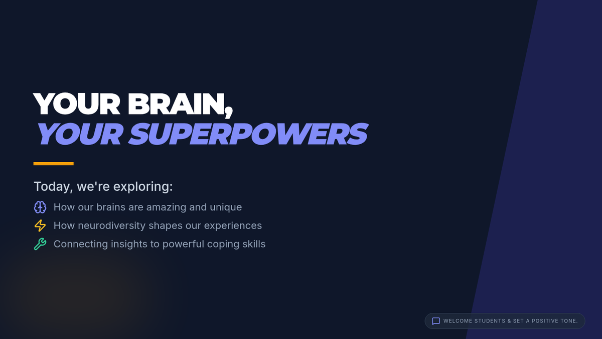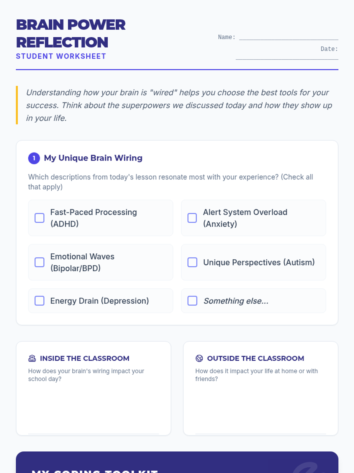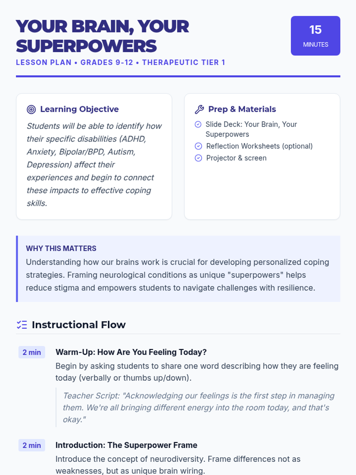 A 15-minute therapeutic lesson for high schoolers that frames neurological conditions like ADHD, Anxiety, and Autism as unique brain 'superpowers' and introduces personalized coping strategies.