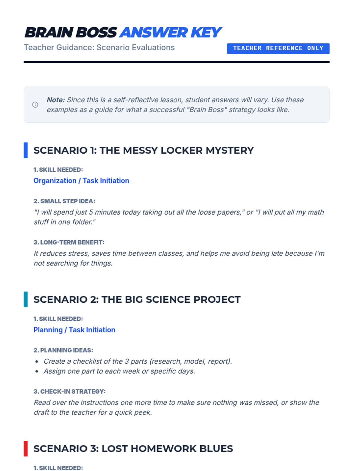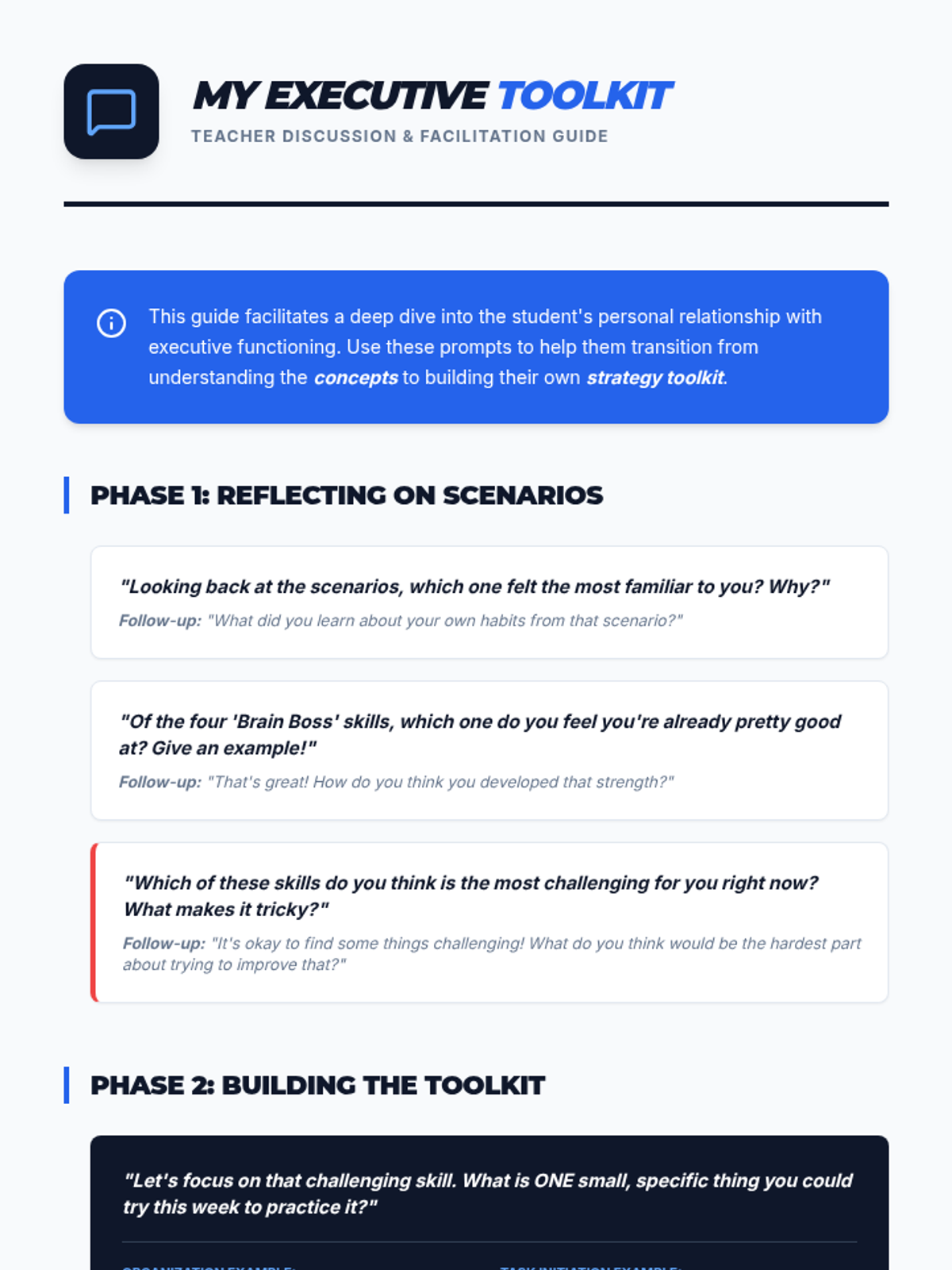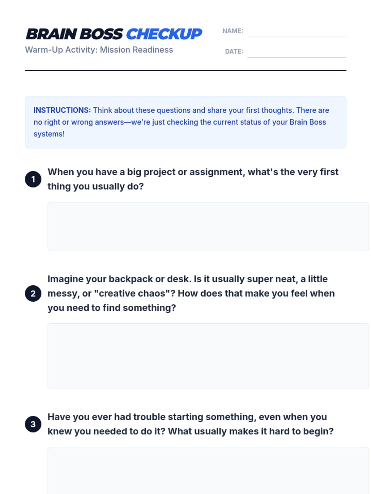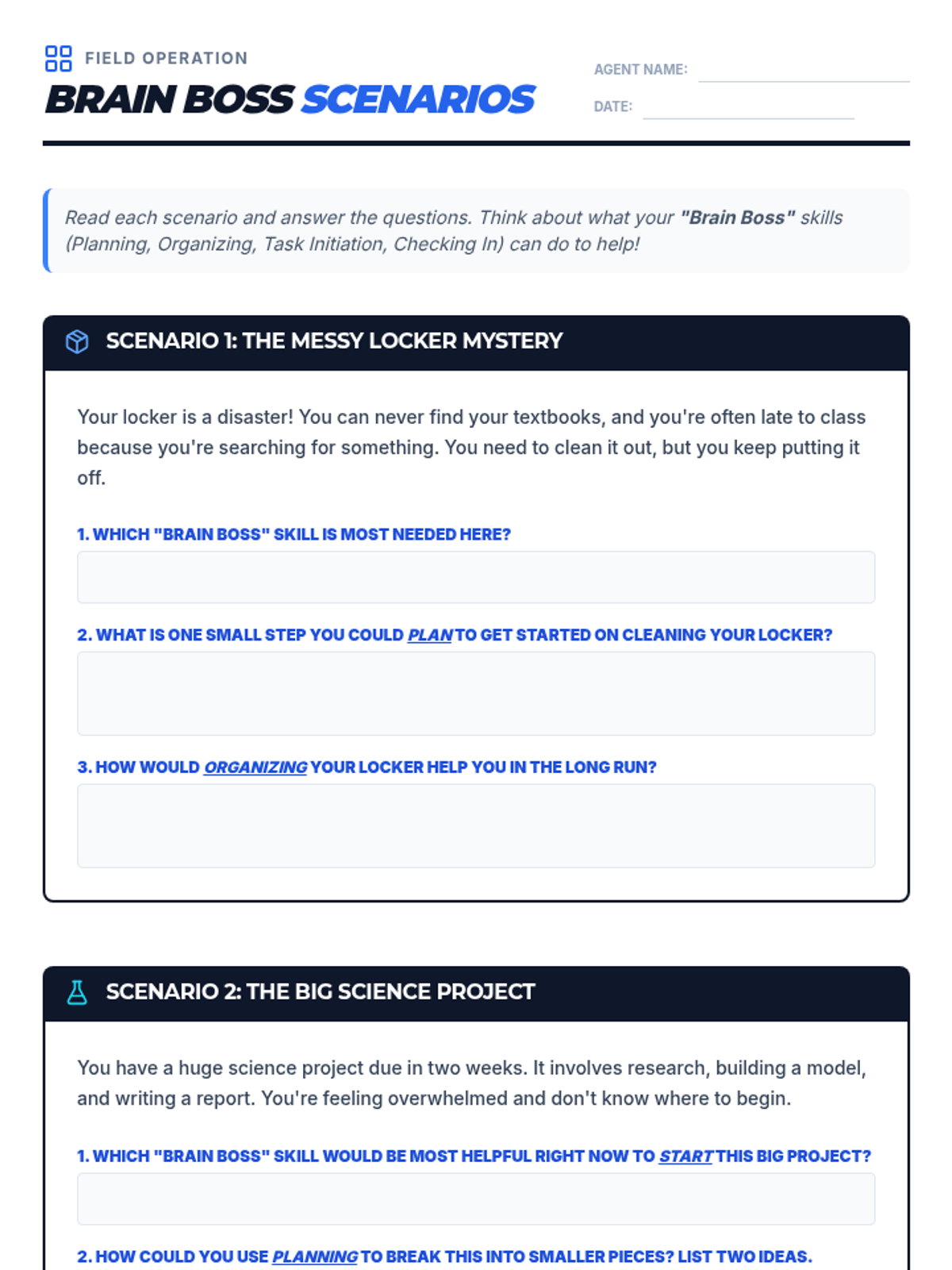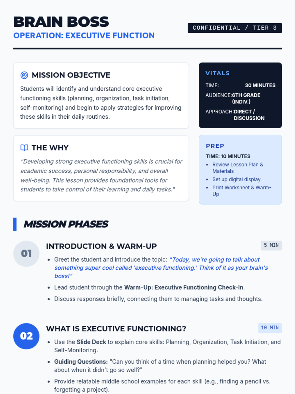 This 30-minute, Tier 3 lesson for a 6th-grade individual student introduces key executive functioning skills (planning, organization, task initiation, and self-monitoring) using a 'Brain Boss' command center metaphor. Students identify their own strengths and challenges while building a practical toolkit for managing academic and daily tasks.