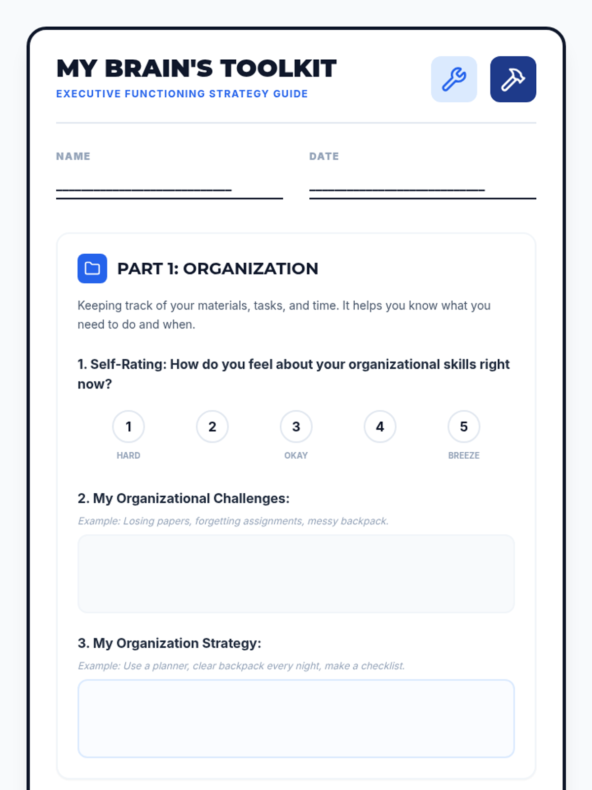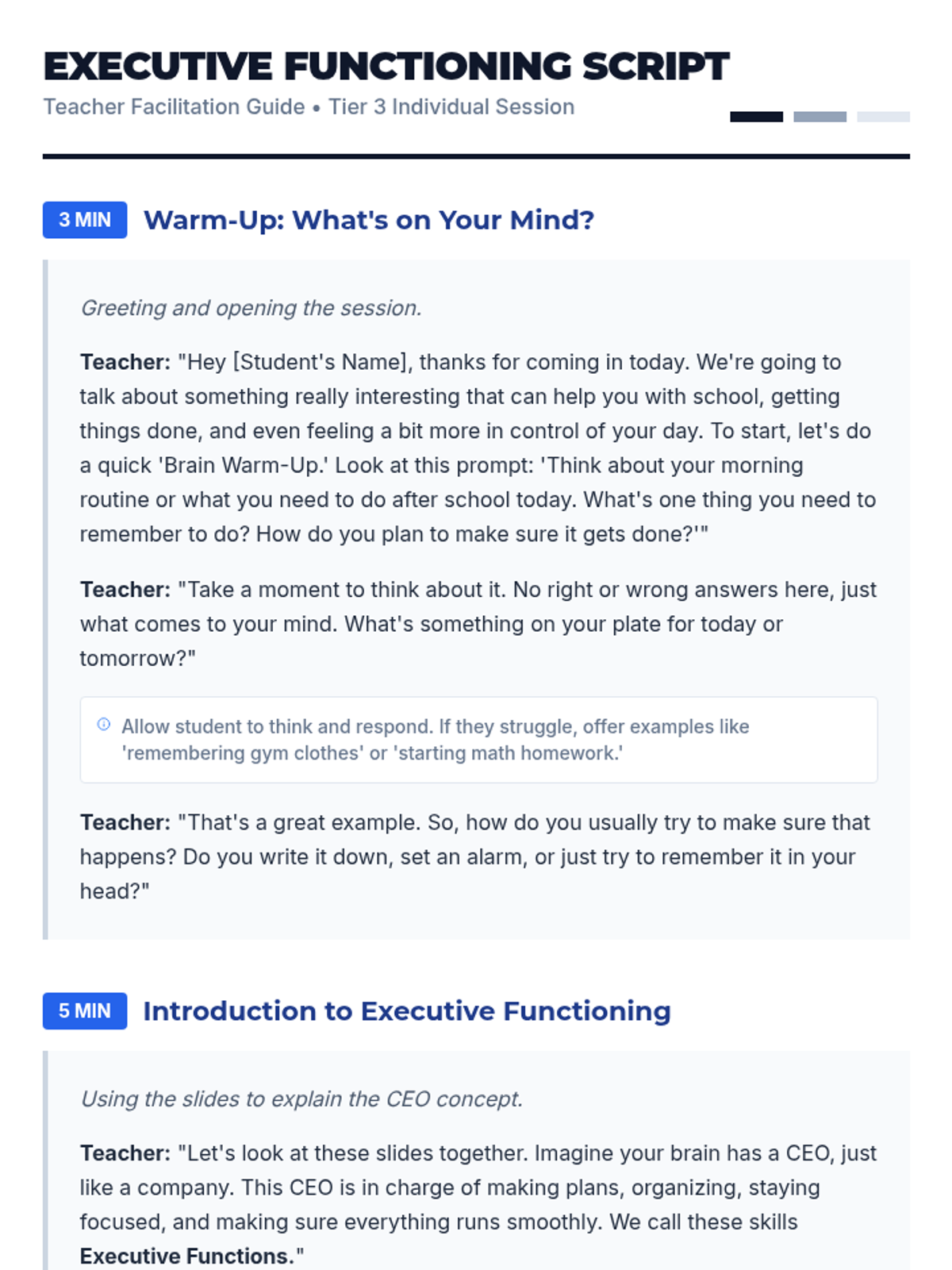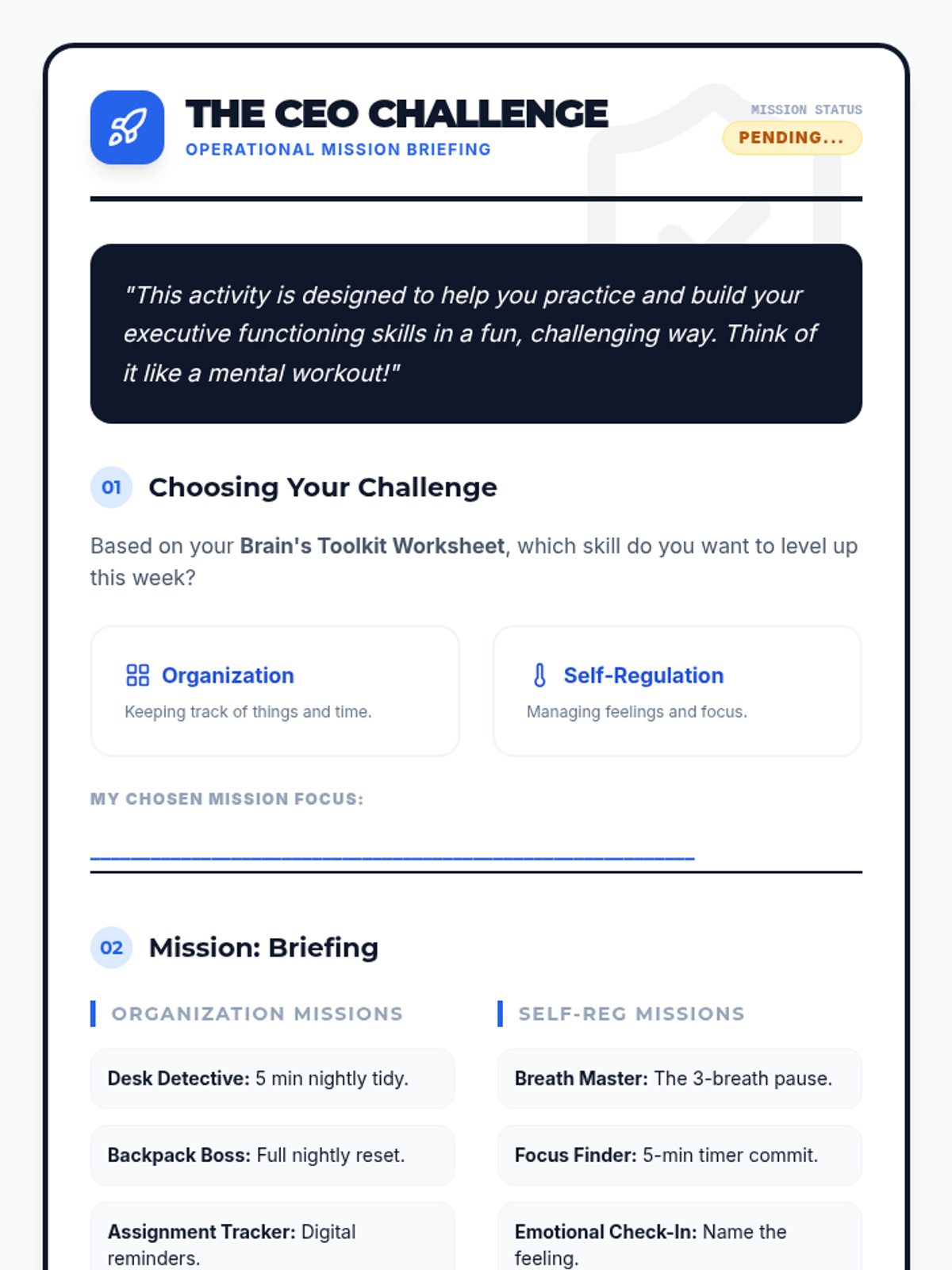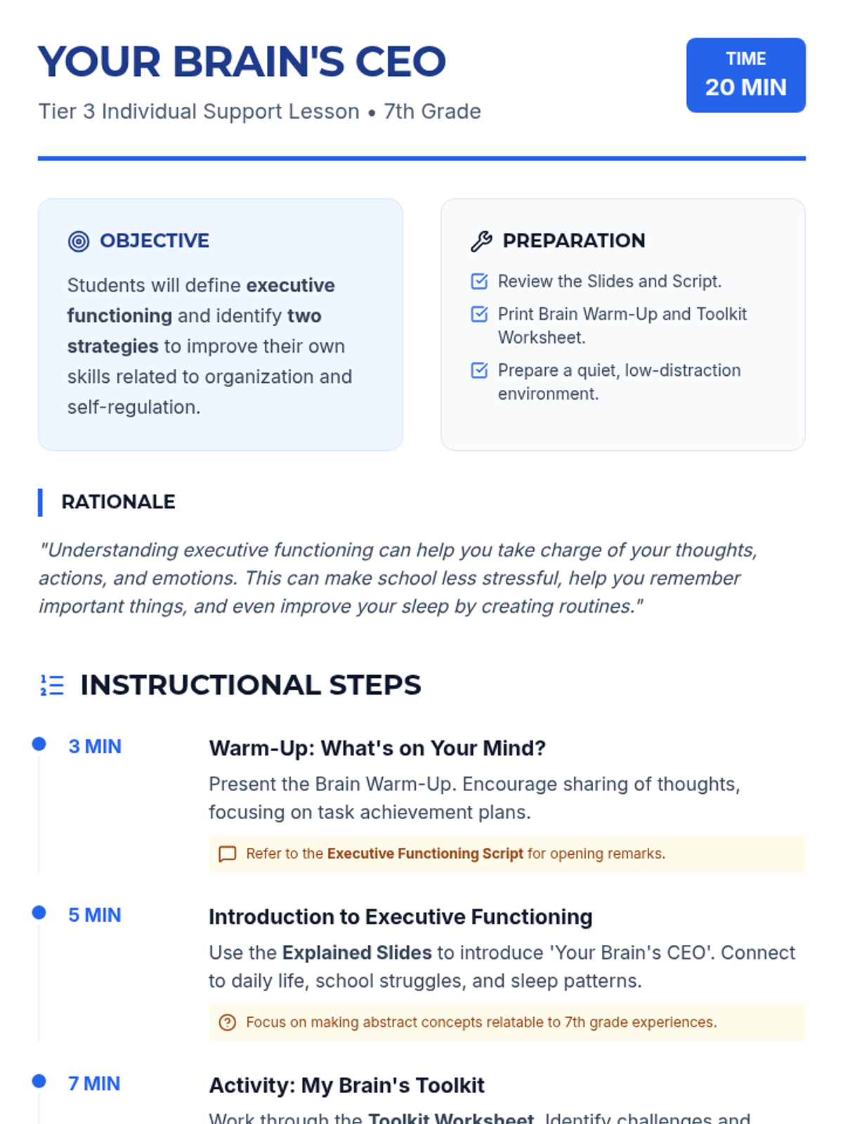 A 20-minute, individualized Tier 3 lesson for a 7th-grade student to understand executive functioning as 'the brain's CEO,' focusing on organization and self-regulation strategies.