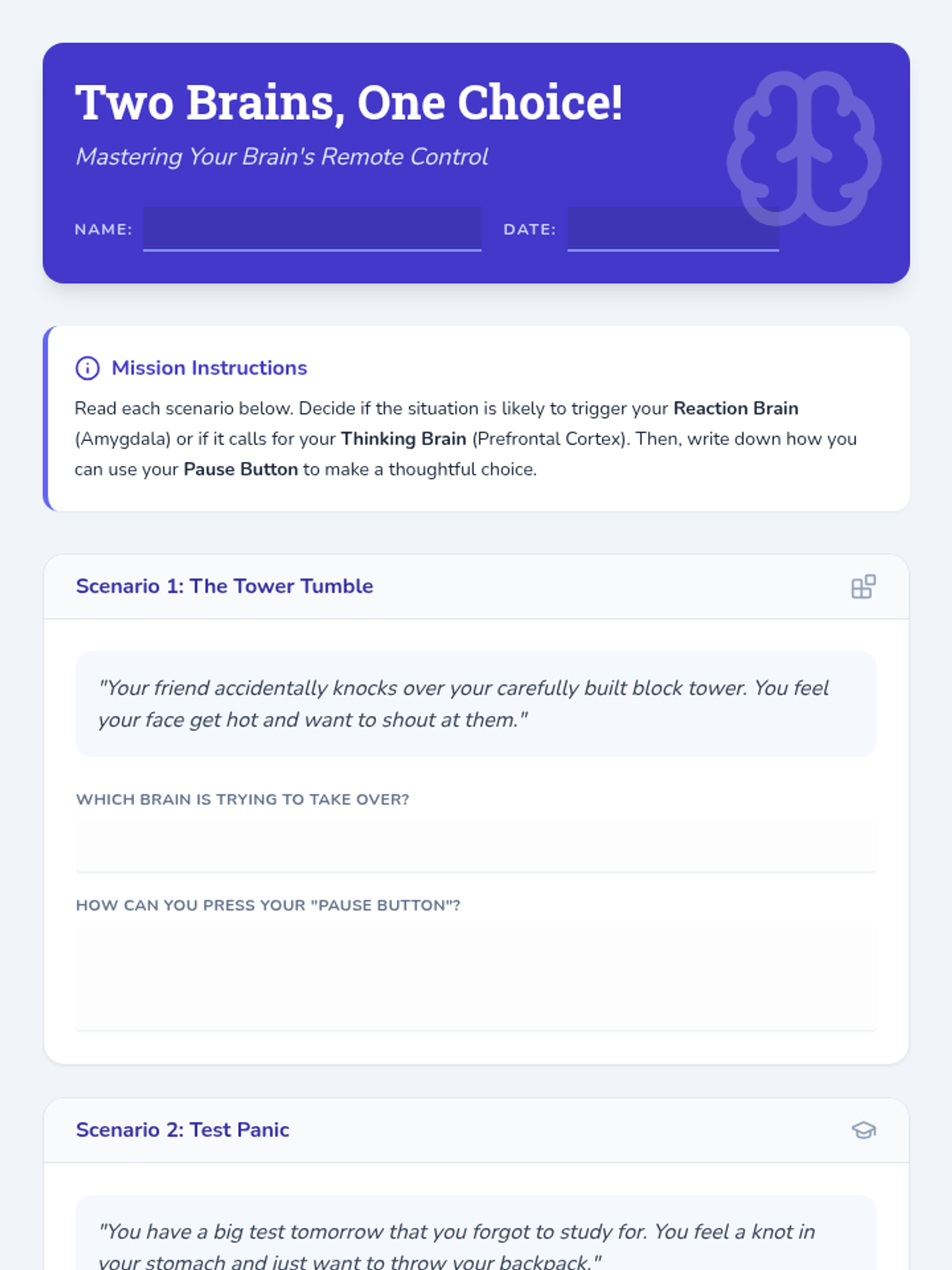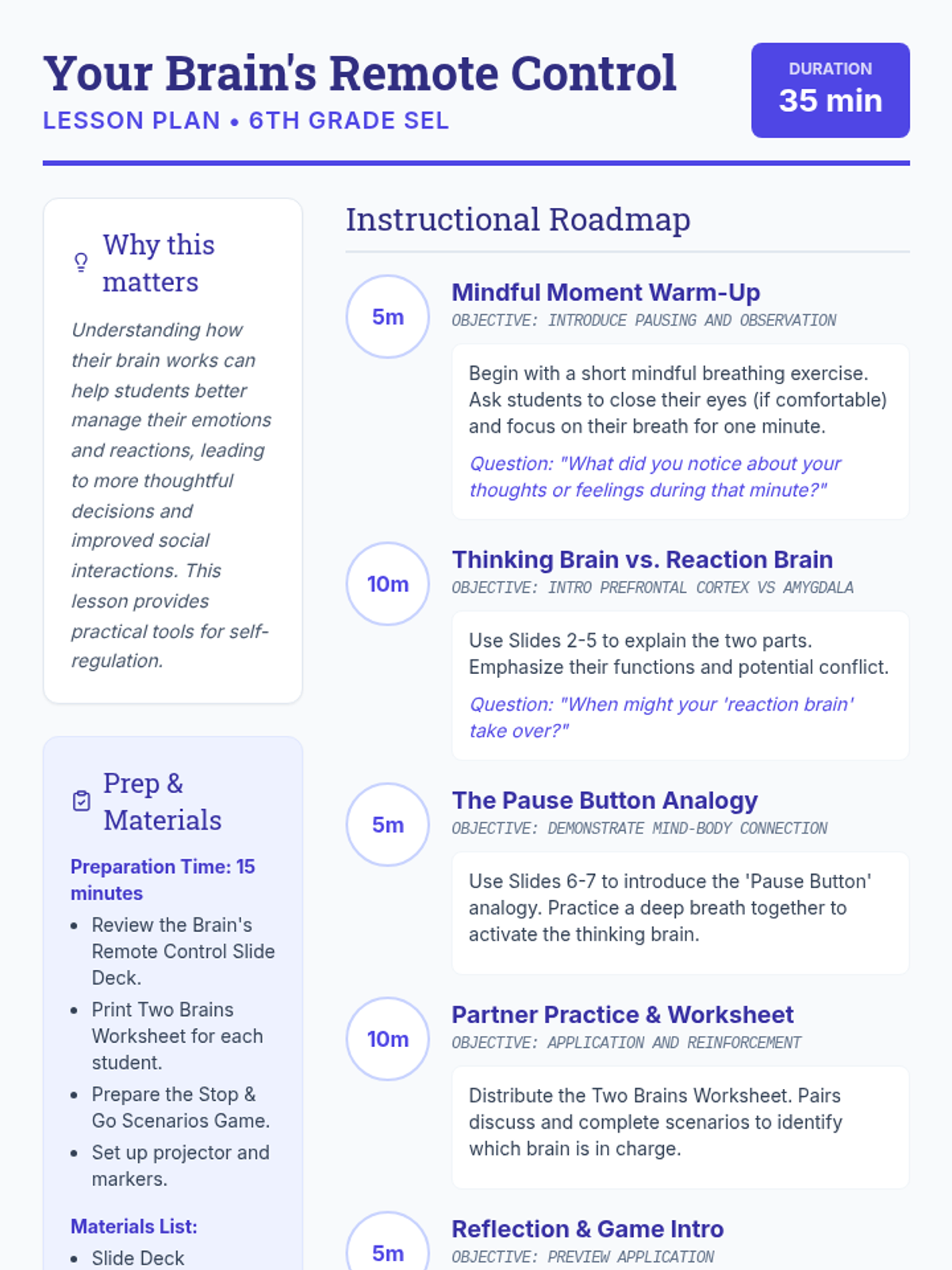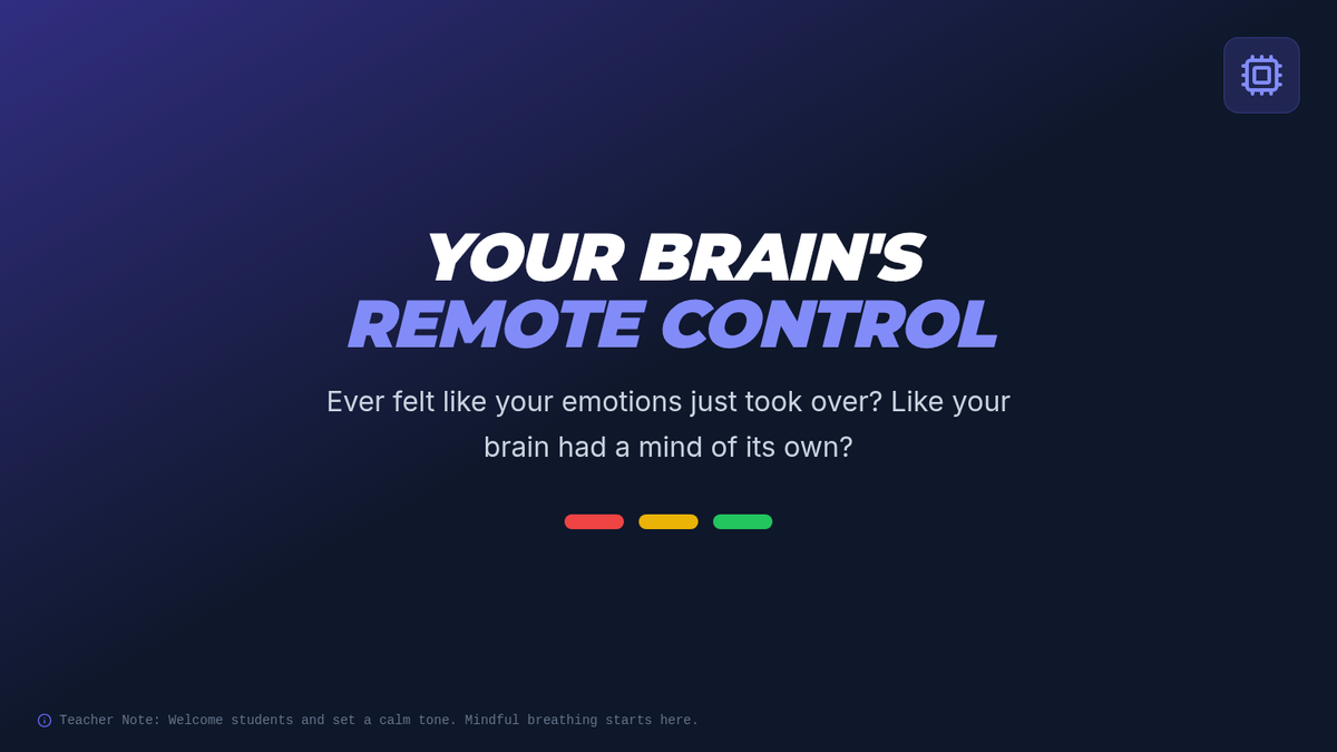 A 35-minute lesson for 6th graders exploring the neuroscience of self-regulation through the 'Thinking Brain' (prefrontal cortex) and 'Reaction Brain' (amygdala) using a remote control analogy.
