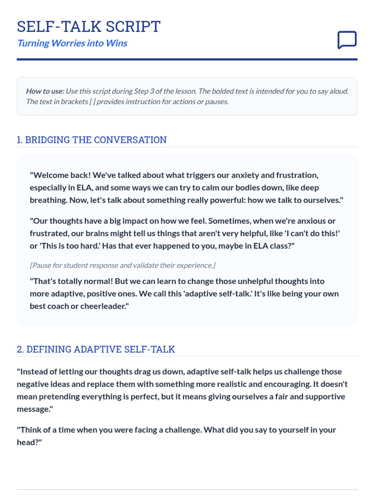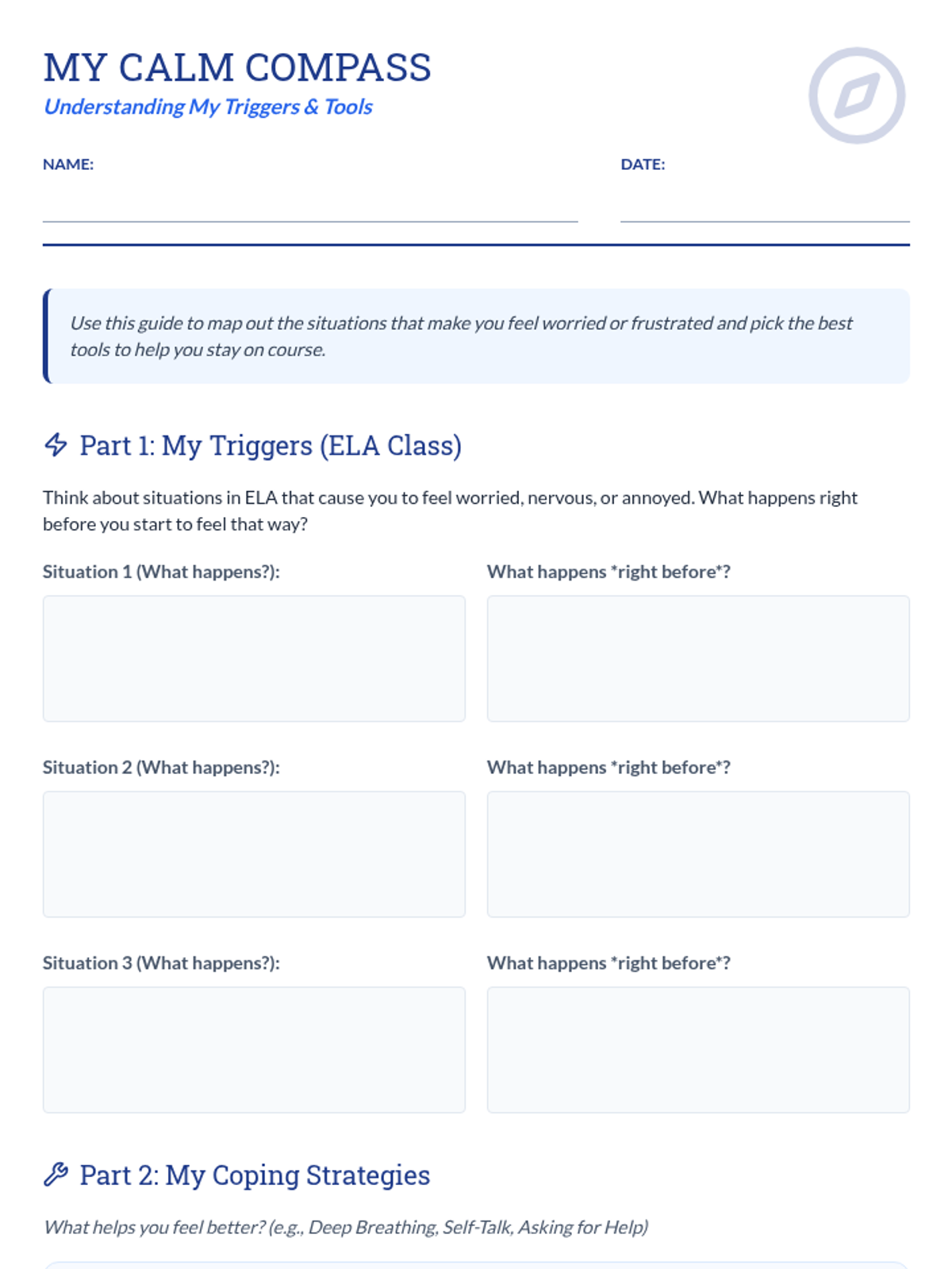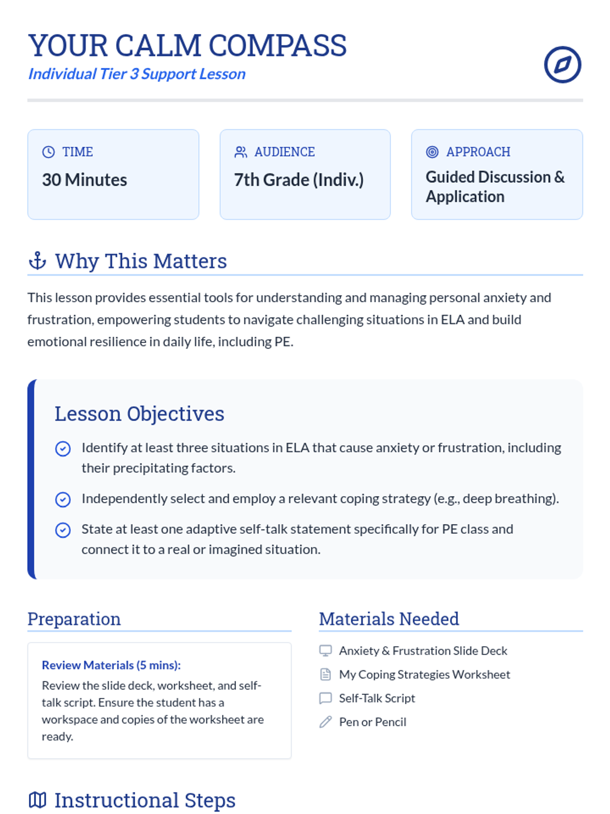 A 30-minute Tier 3 individual lesson for 7th-grade students to identify personal triggers for anxiety and frustration in ELA and practice coping strategies, including adaptive self-talk for PE.