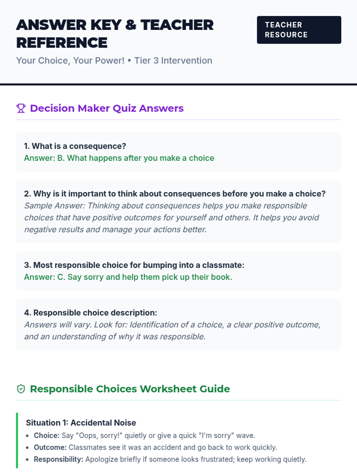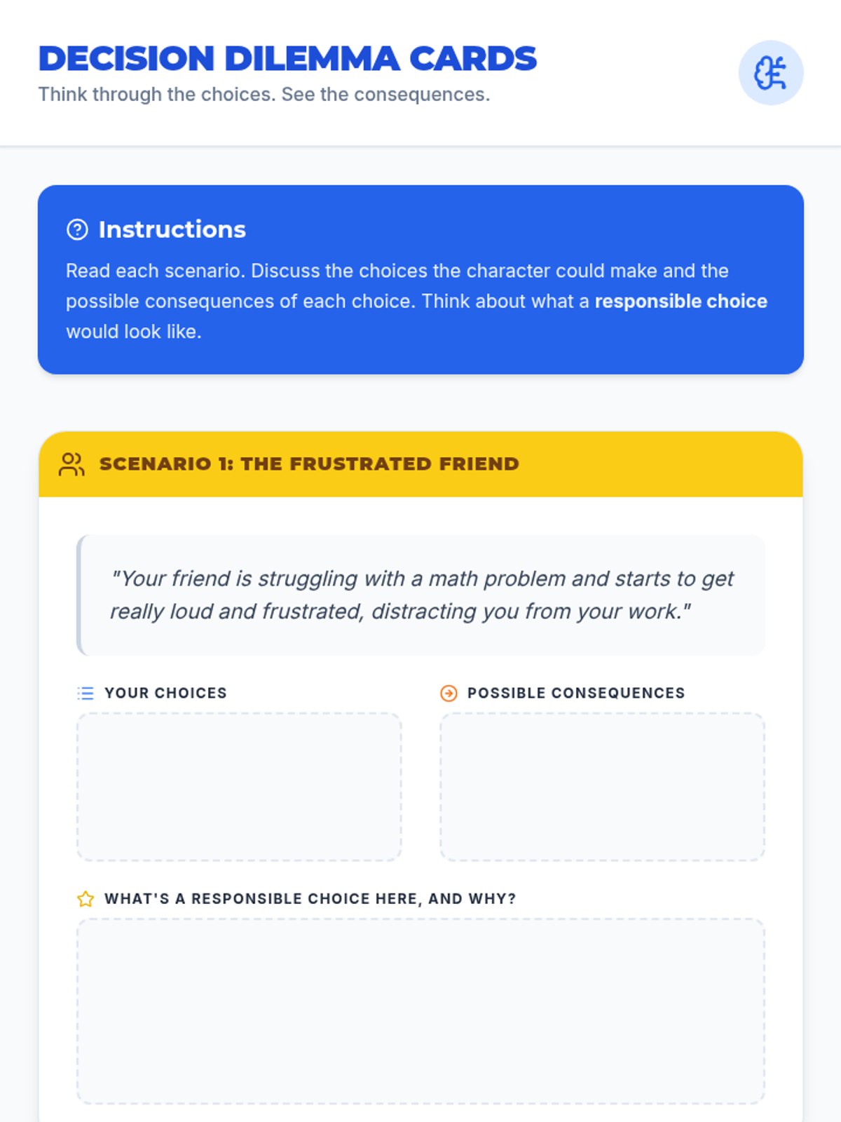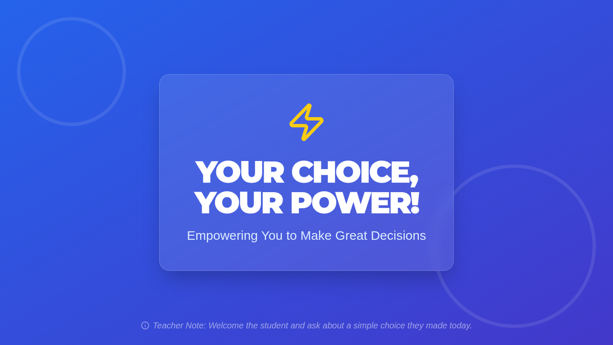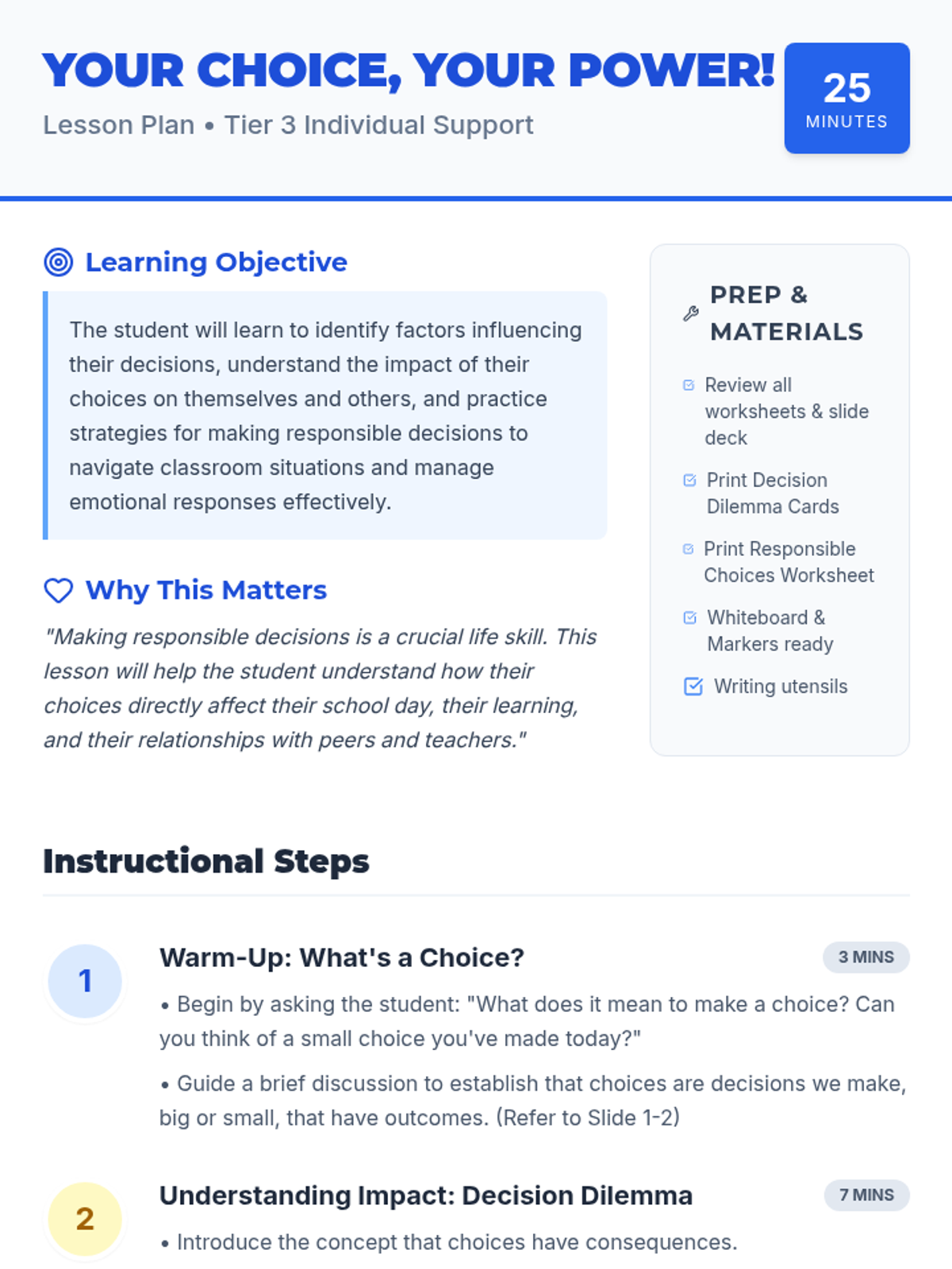 A 25-minute individual session helping students understand the impact of their choices and develop strategies for responsible decision-making in the classroom.