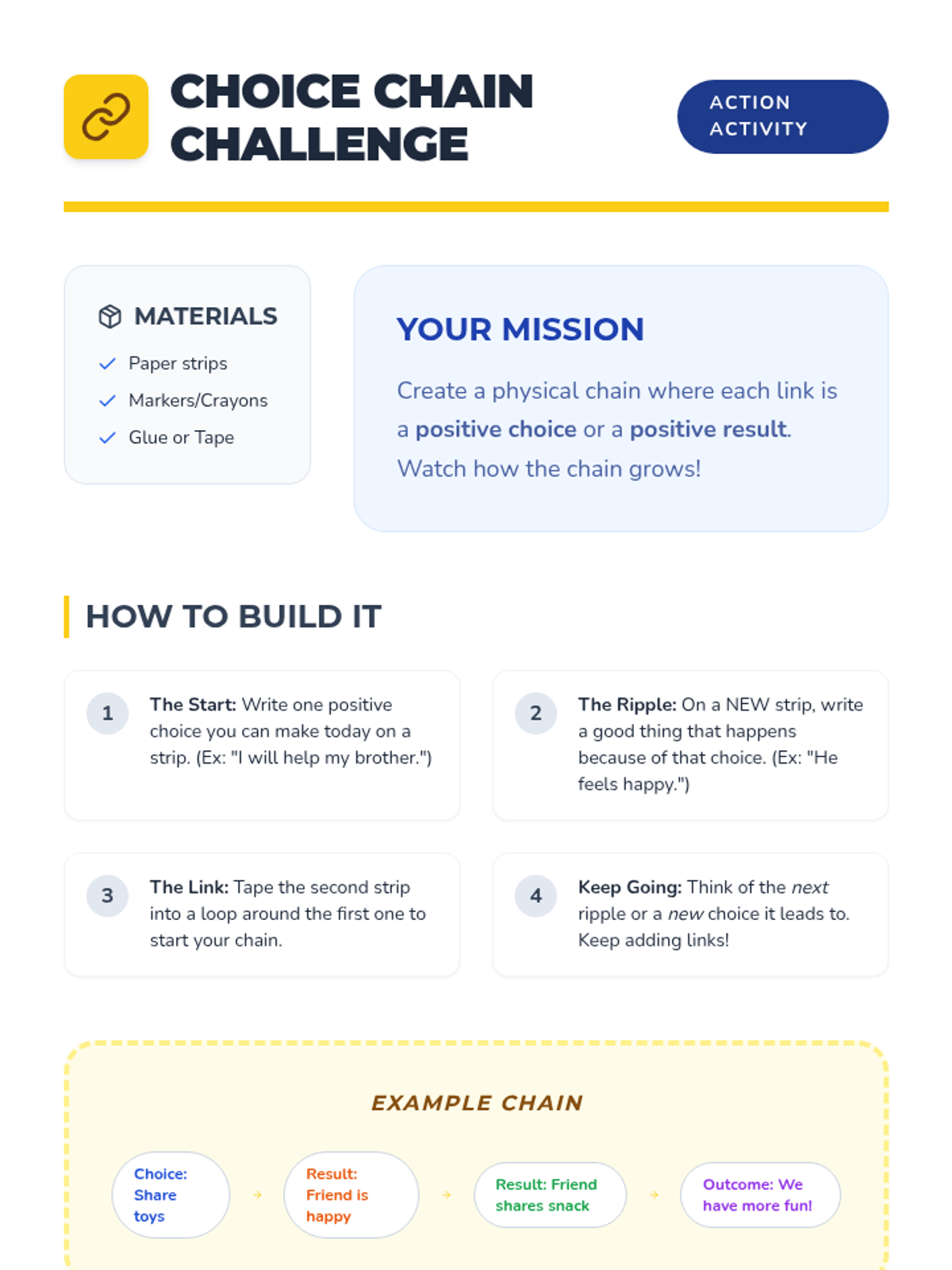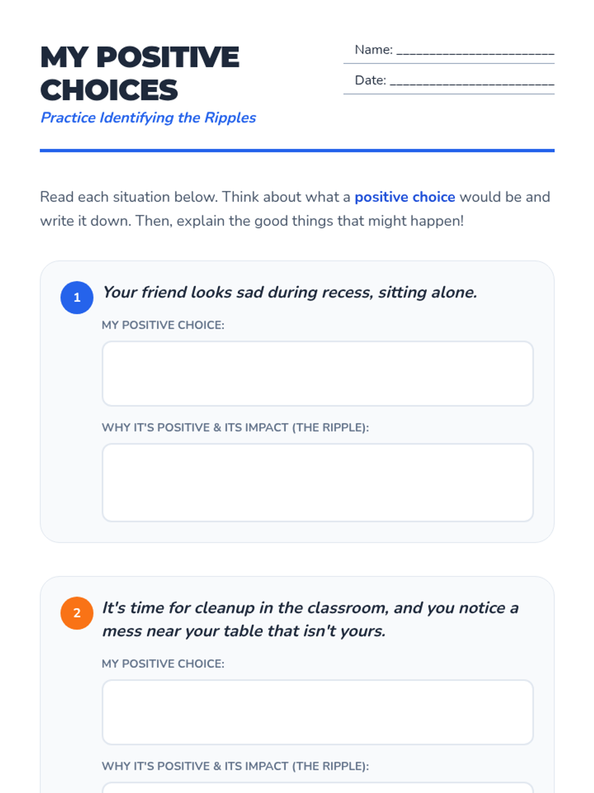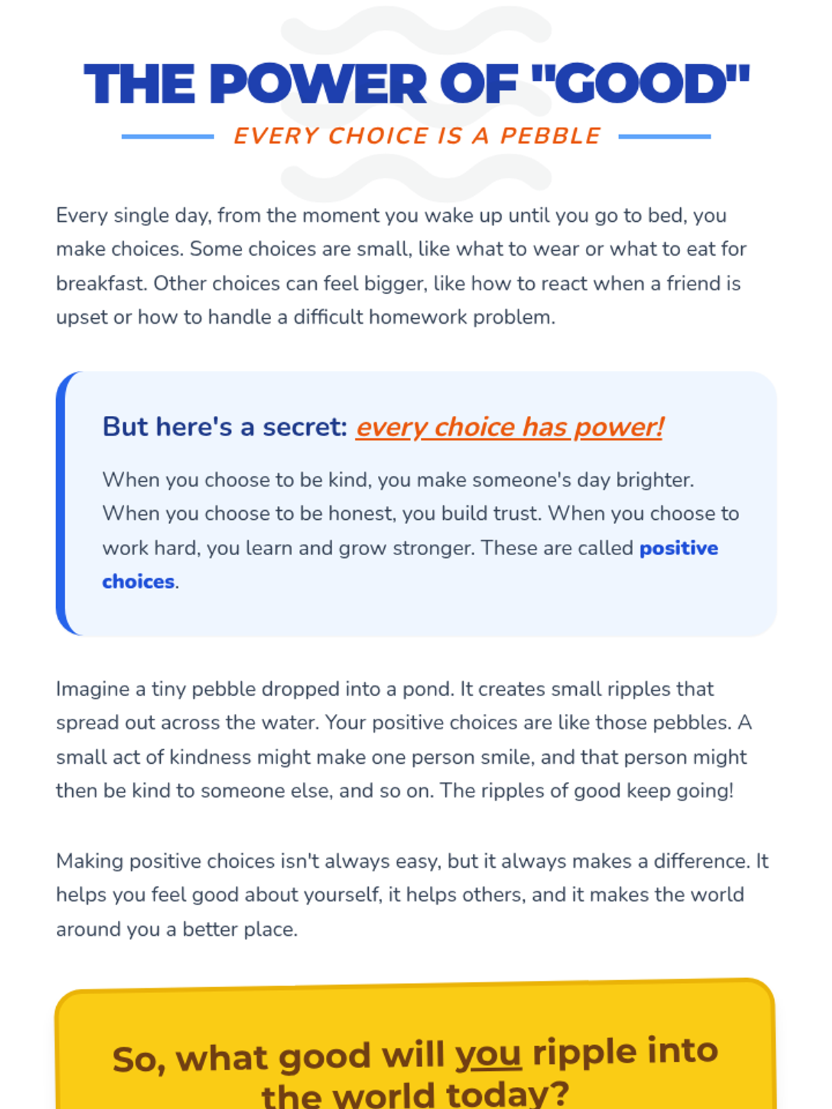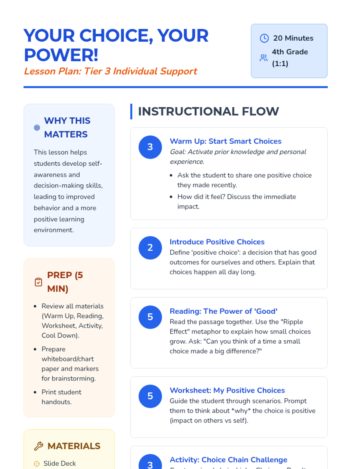 A 20-minute Tier 3 individual lesson for 4th graders focused on recognizing the impact of positive choices. Students explore the 'ripple effect' of their decisions through reading, discussion, and a hands-on activity.