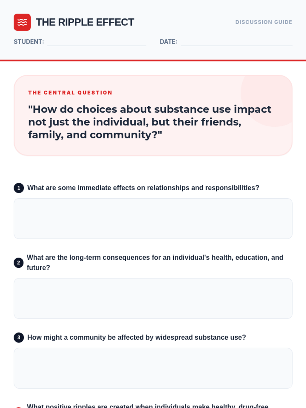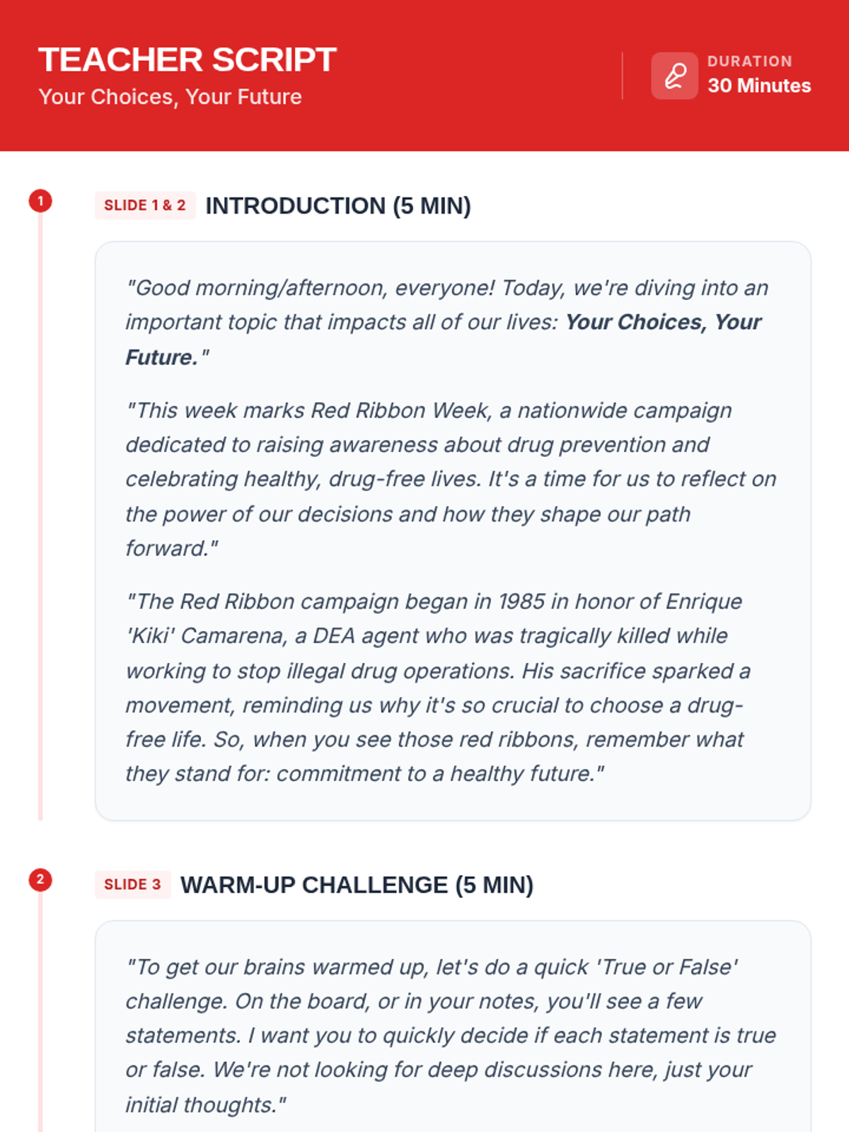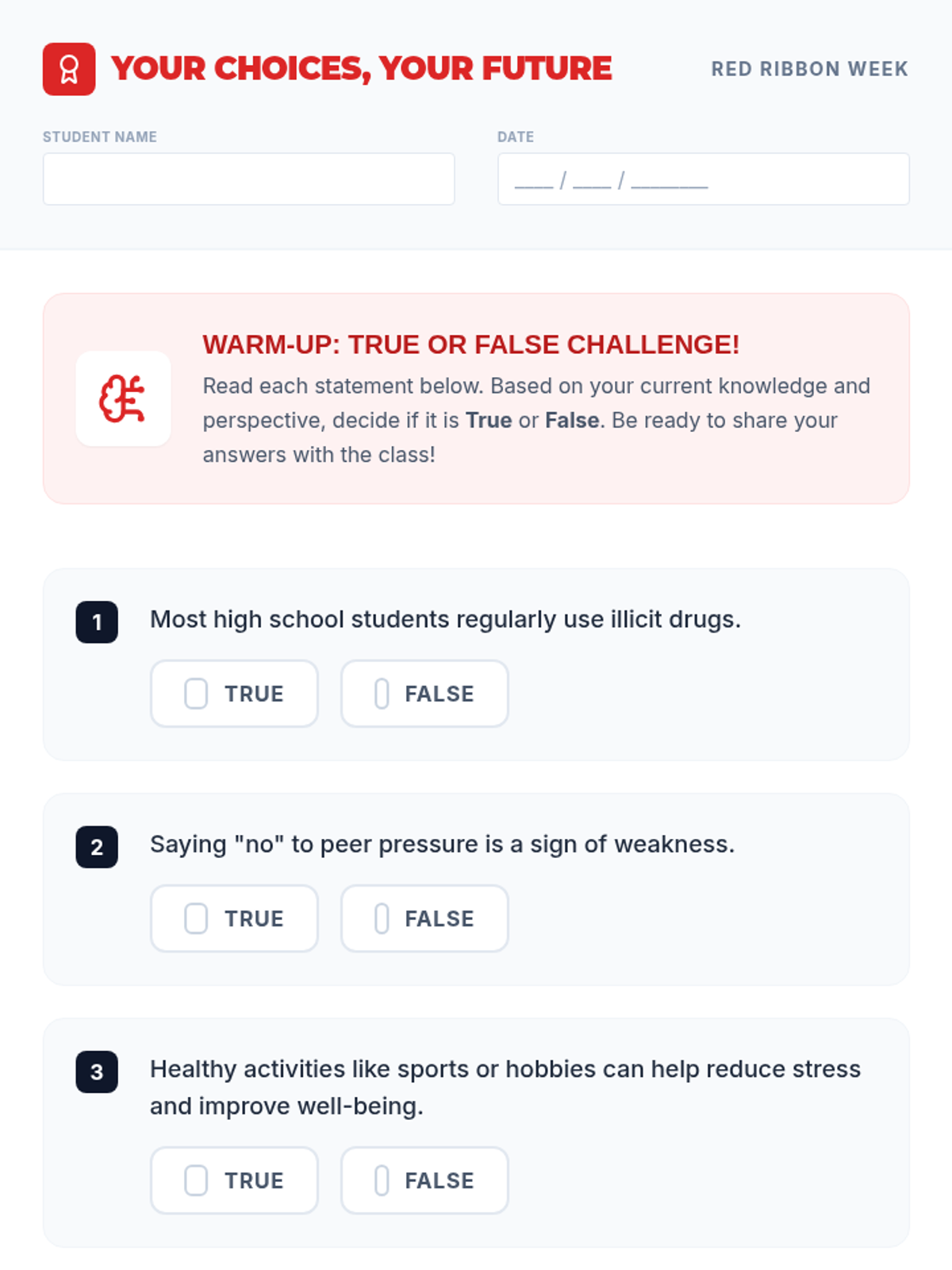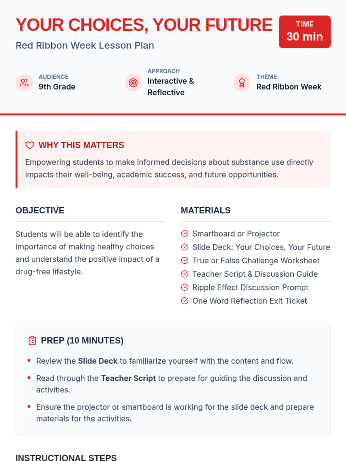 This 30-minute lesson for 9th-grade students explores the impact of substance use choices through the lens of Red Ribbon Week, using interactive discussions and reflective activities to empower healthy decision-making.