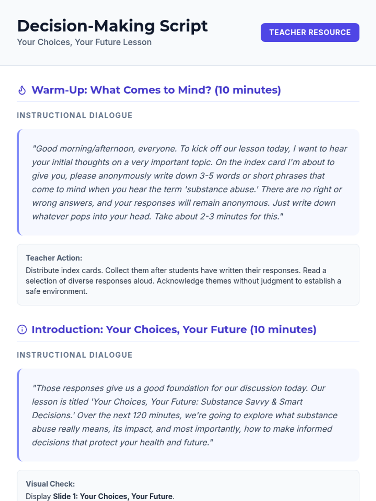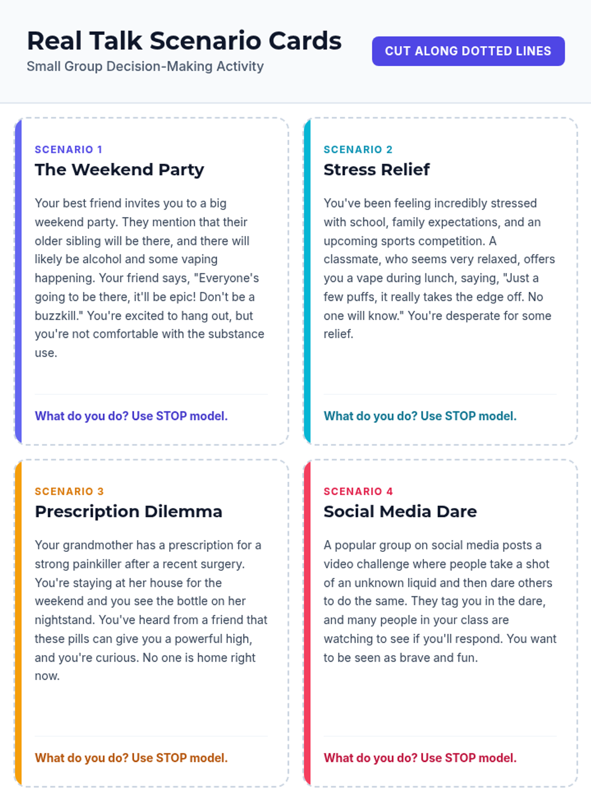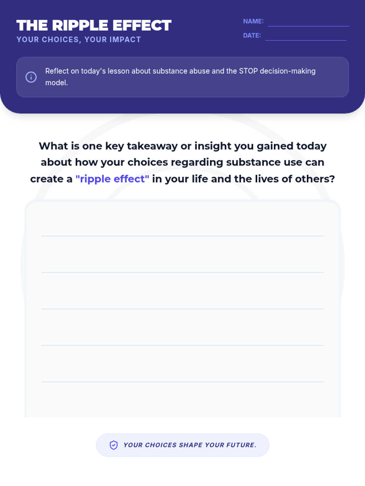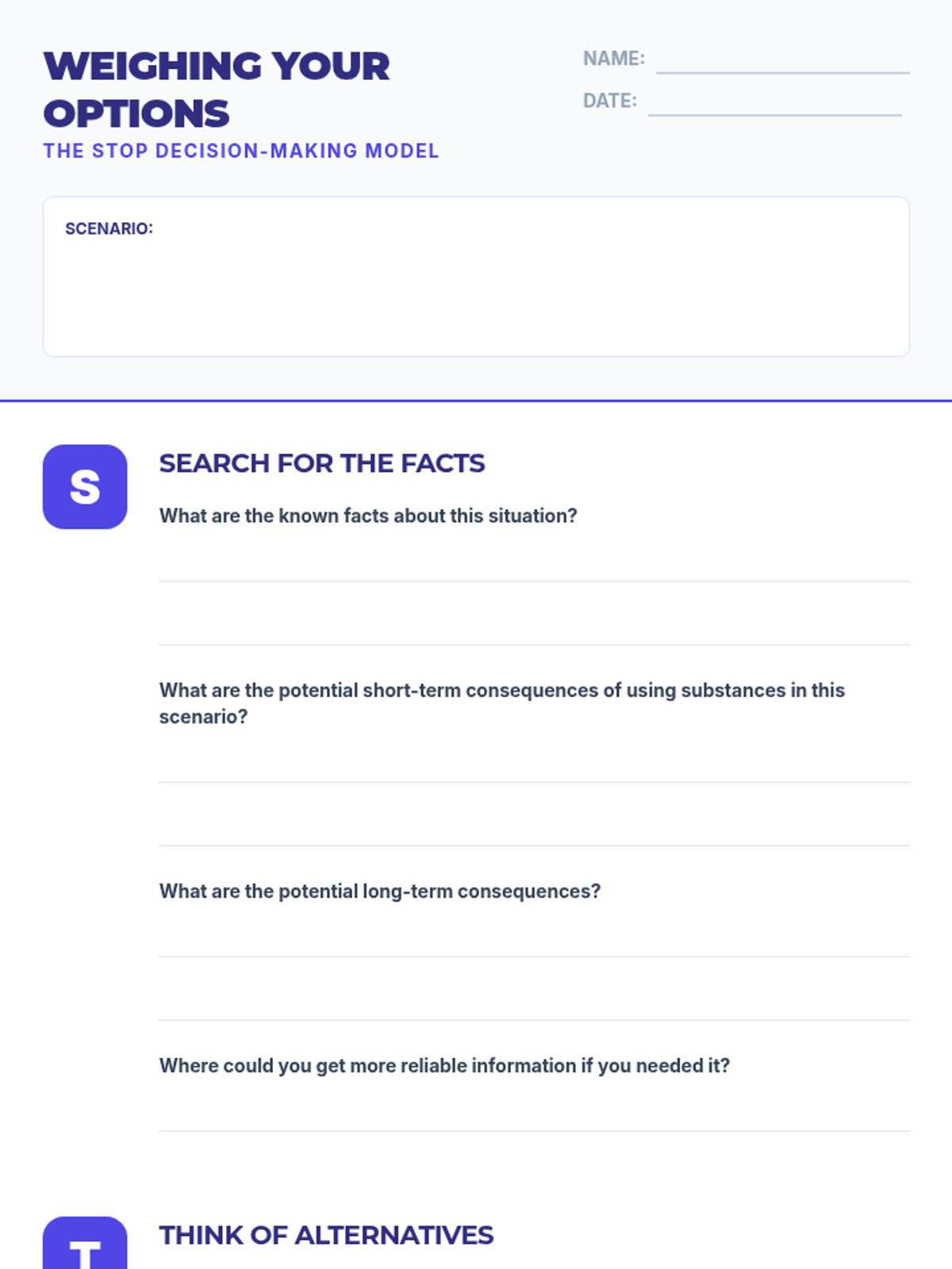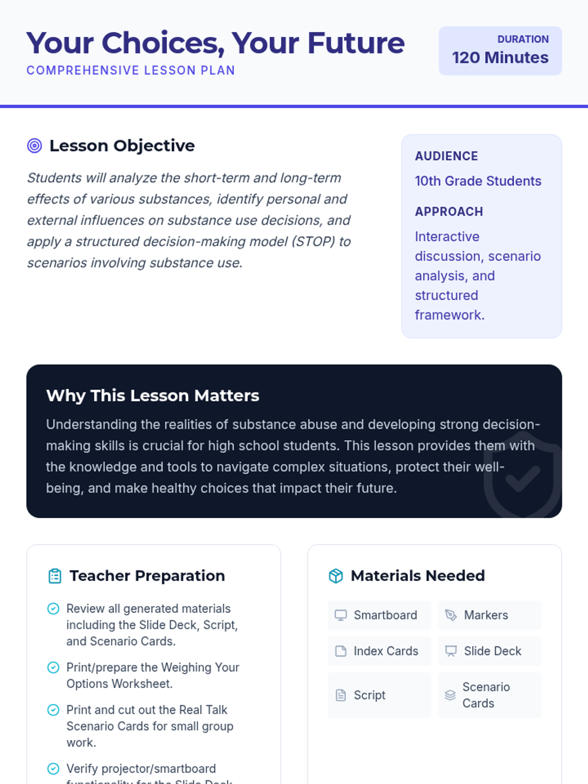 This 120-minute lesson empowers 10th-grade students to make informed decisions about substance use by analyzing impacts and practicing a structured decision-making model (STOP).