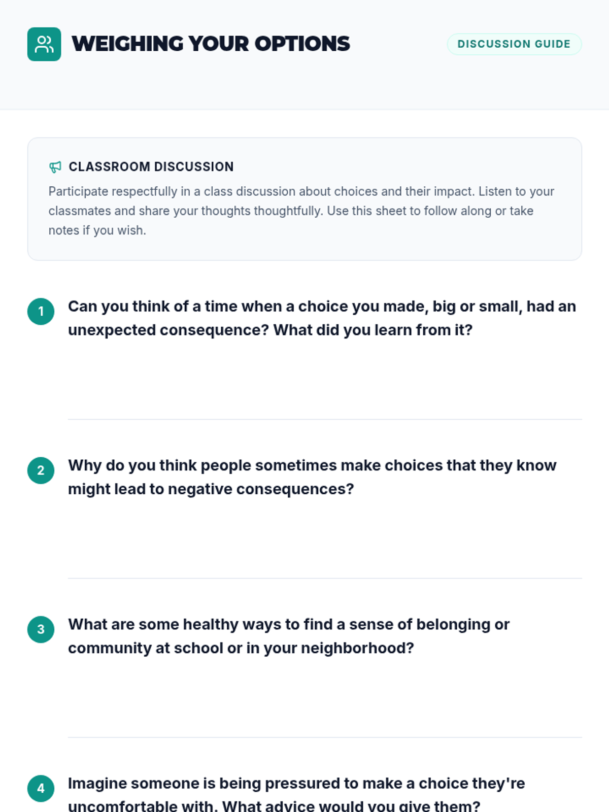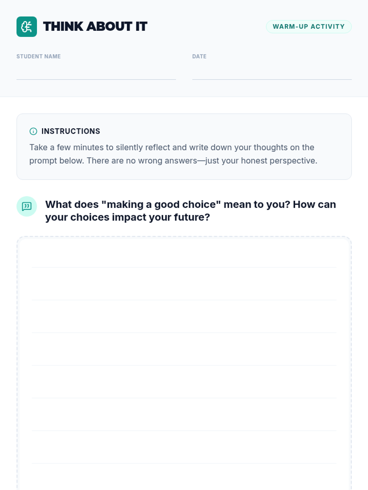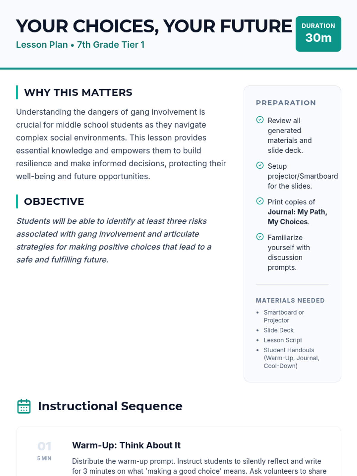 A 30-minute lesson for 7th graders focused on the impact of personal decisions, the risks of gang involvement, and empowering students to choose positive paths for their future.