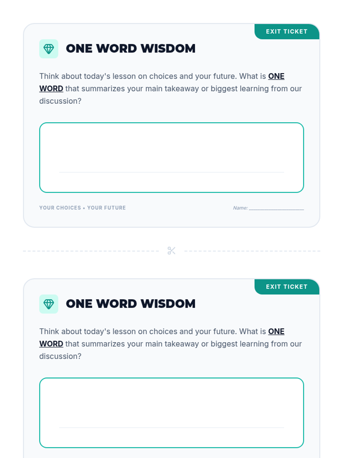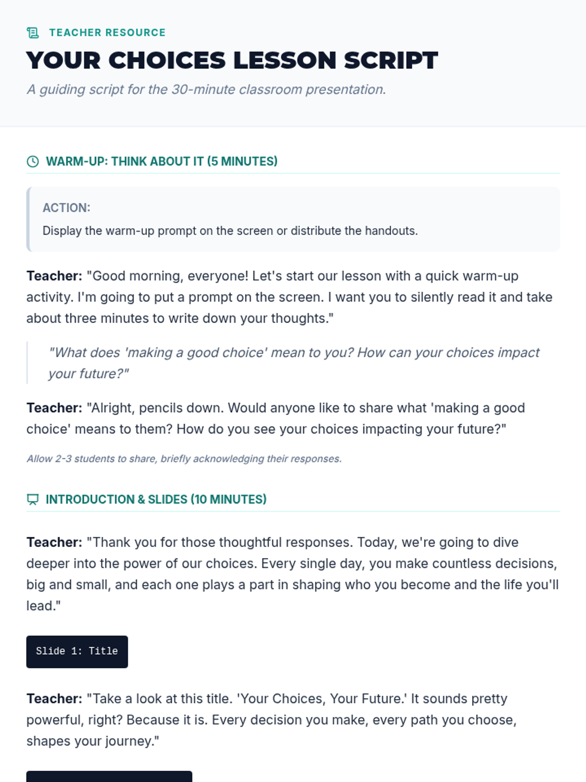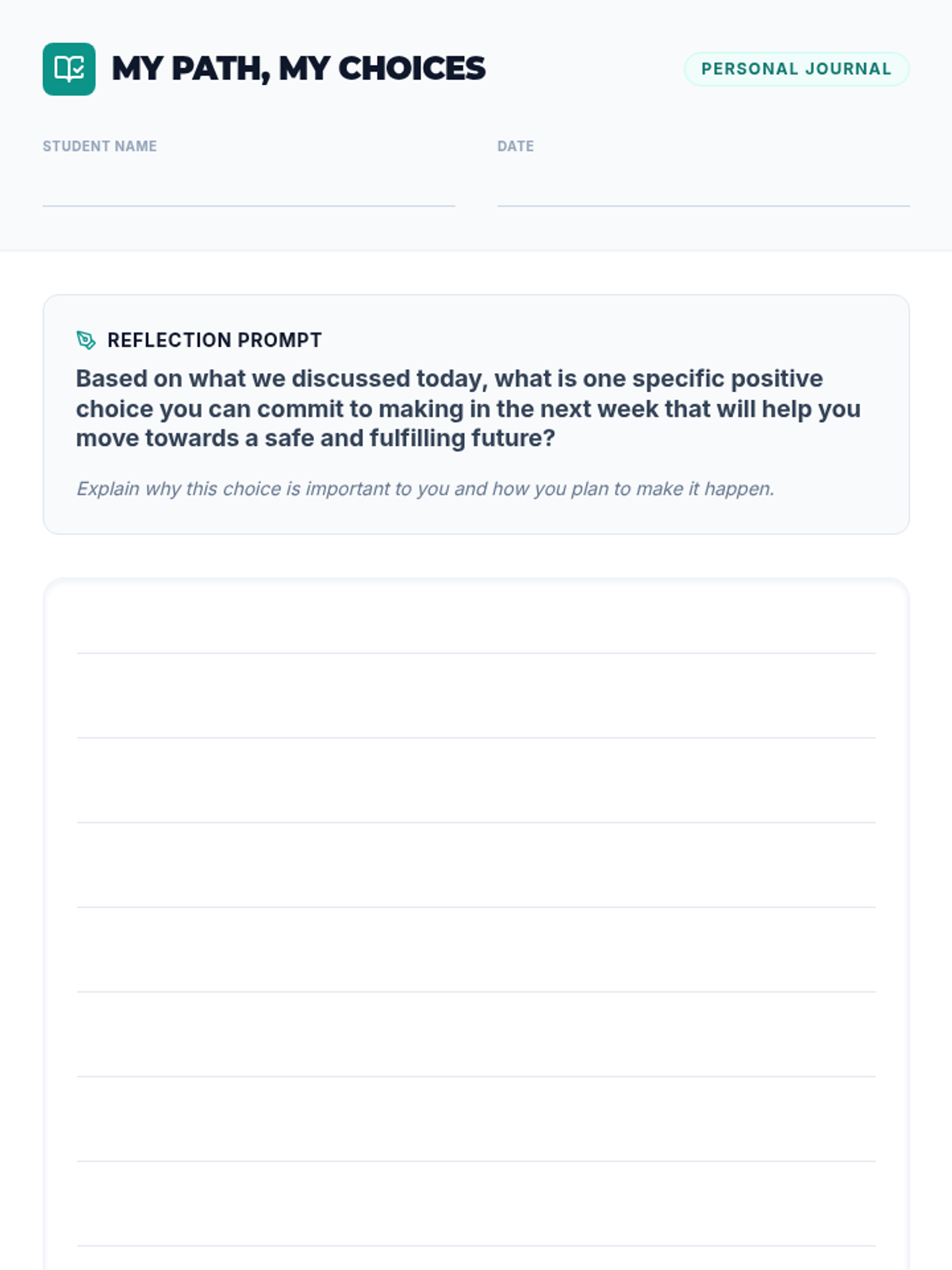 A 30-minute lesson for 7th graders focused on the impact of personal decisions, the risks of gang involvement, and empowering students to choose positive paths for their future.