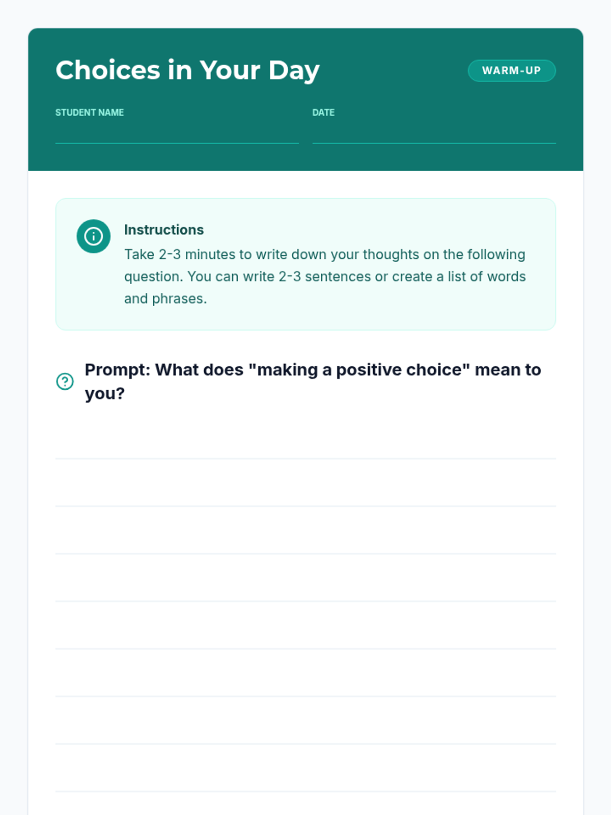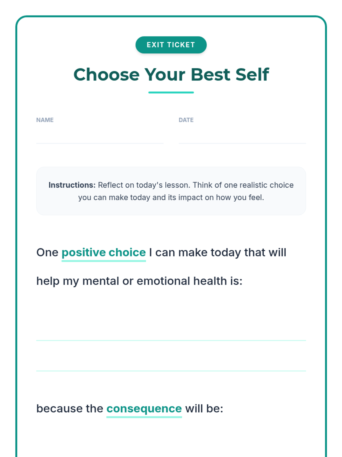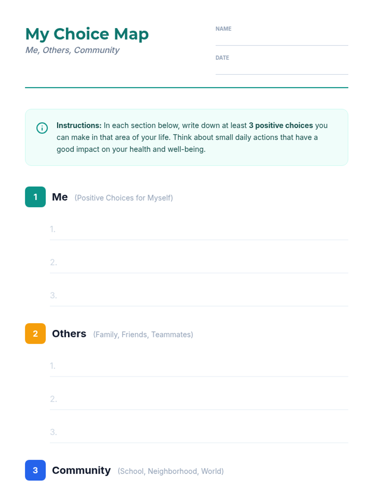 A 45-minute session for 6th graders exploring the link between daily choices, their consequences, and mental/emotional well-being. Students map out positive actions for themselves, others, and their community.