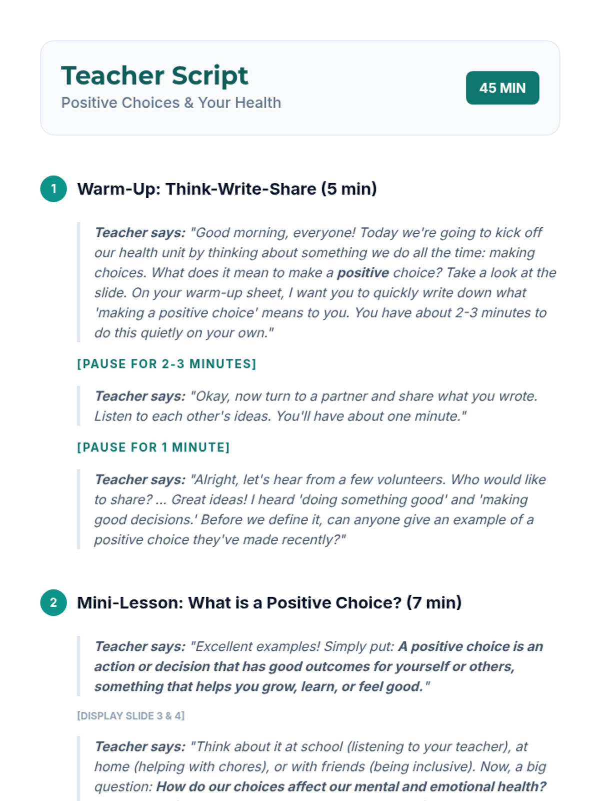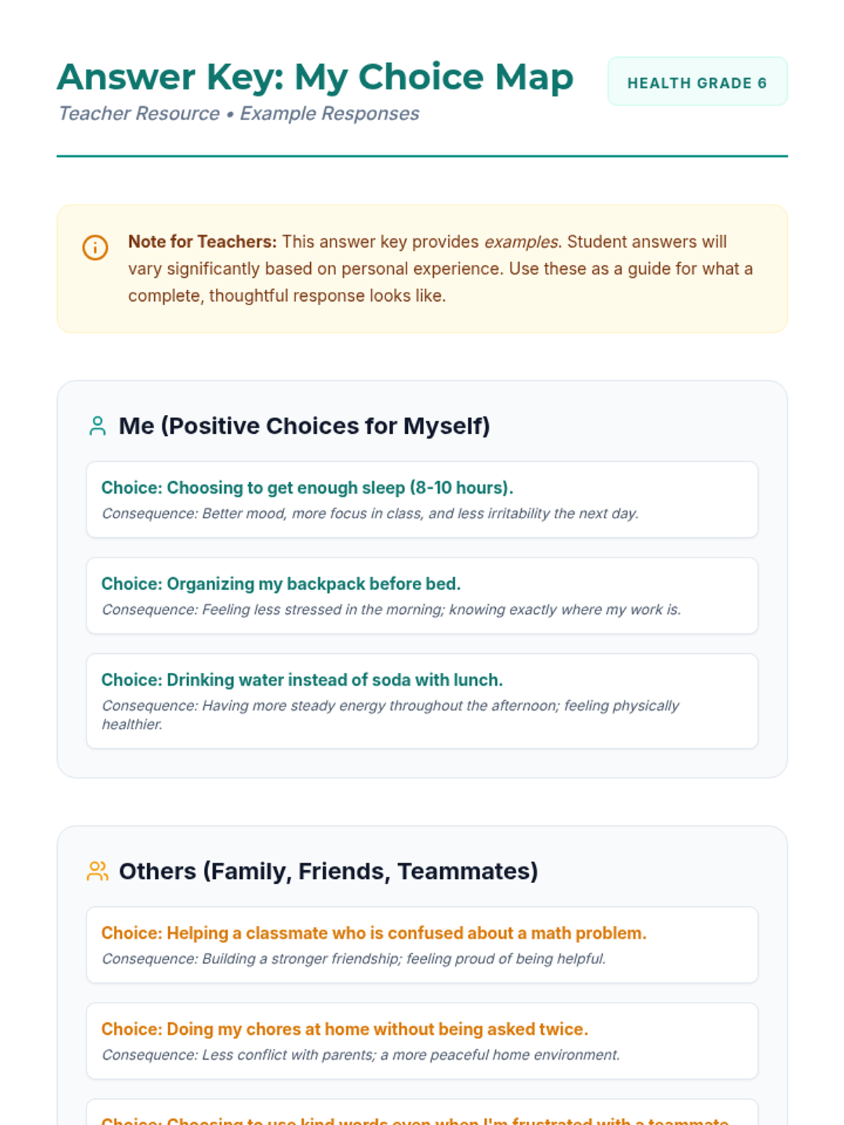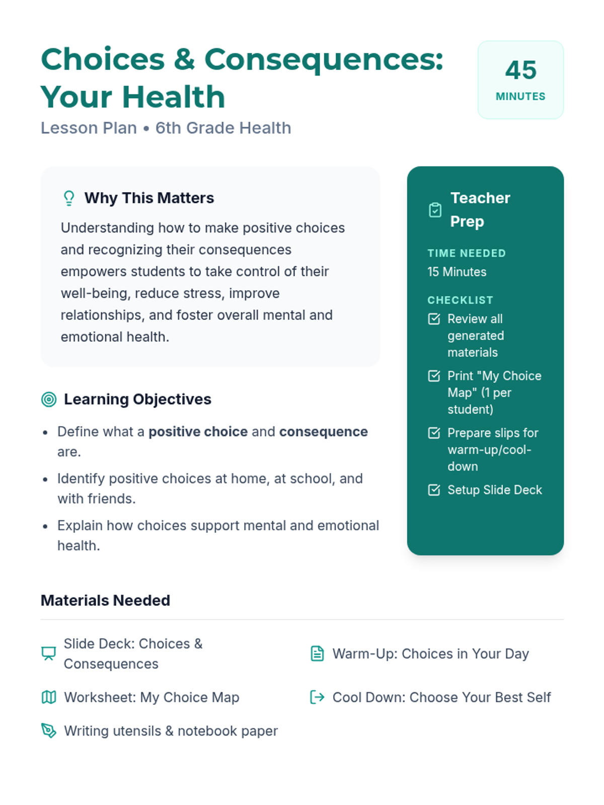 A 45-minute session for 6th graders exploring the link between daily choices, their consequences, and mental/emotional well-being. Students map out positive actions for themselves, others, and their community.