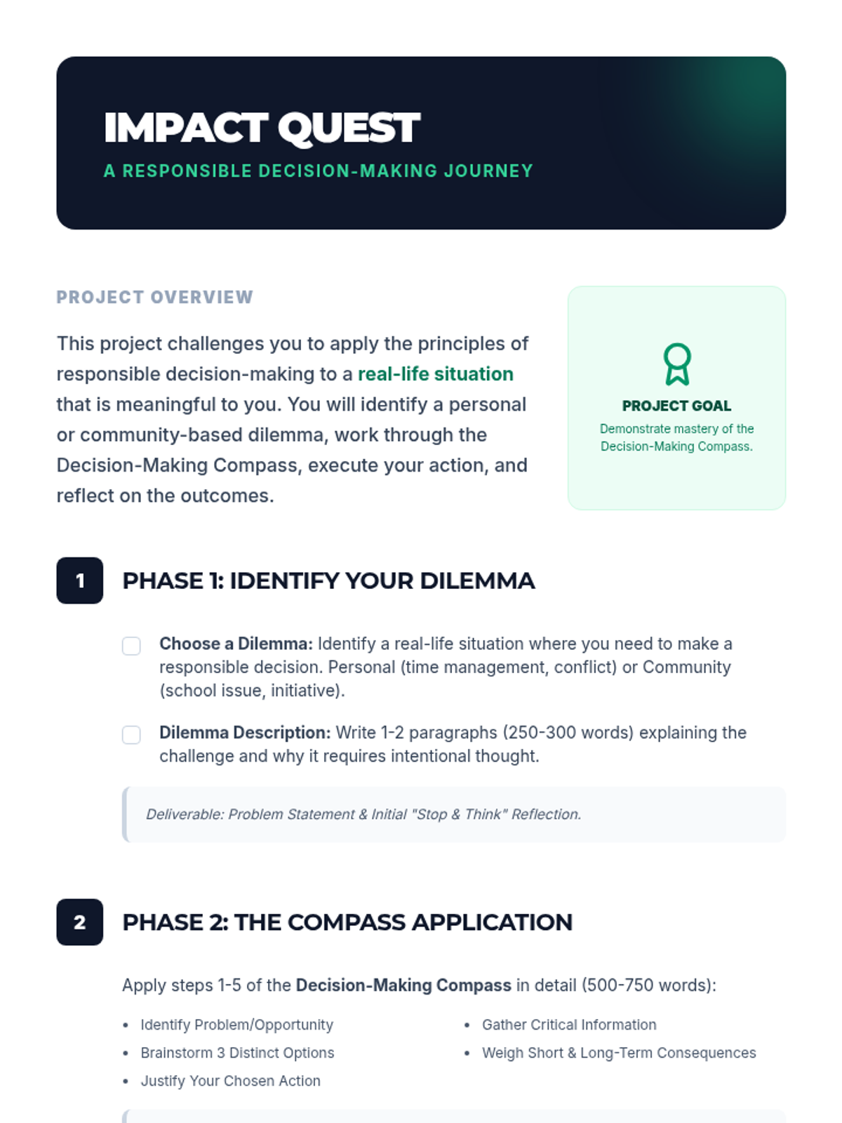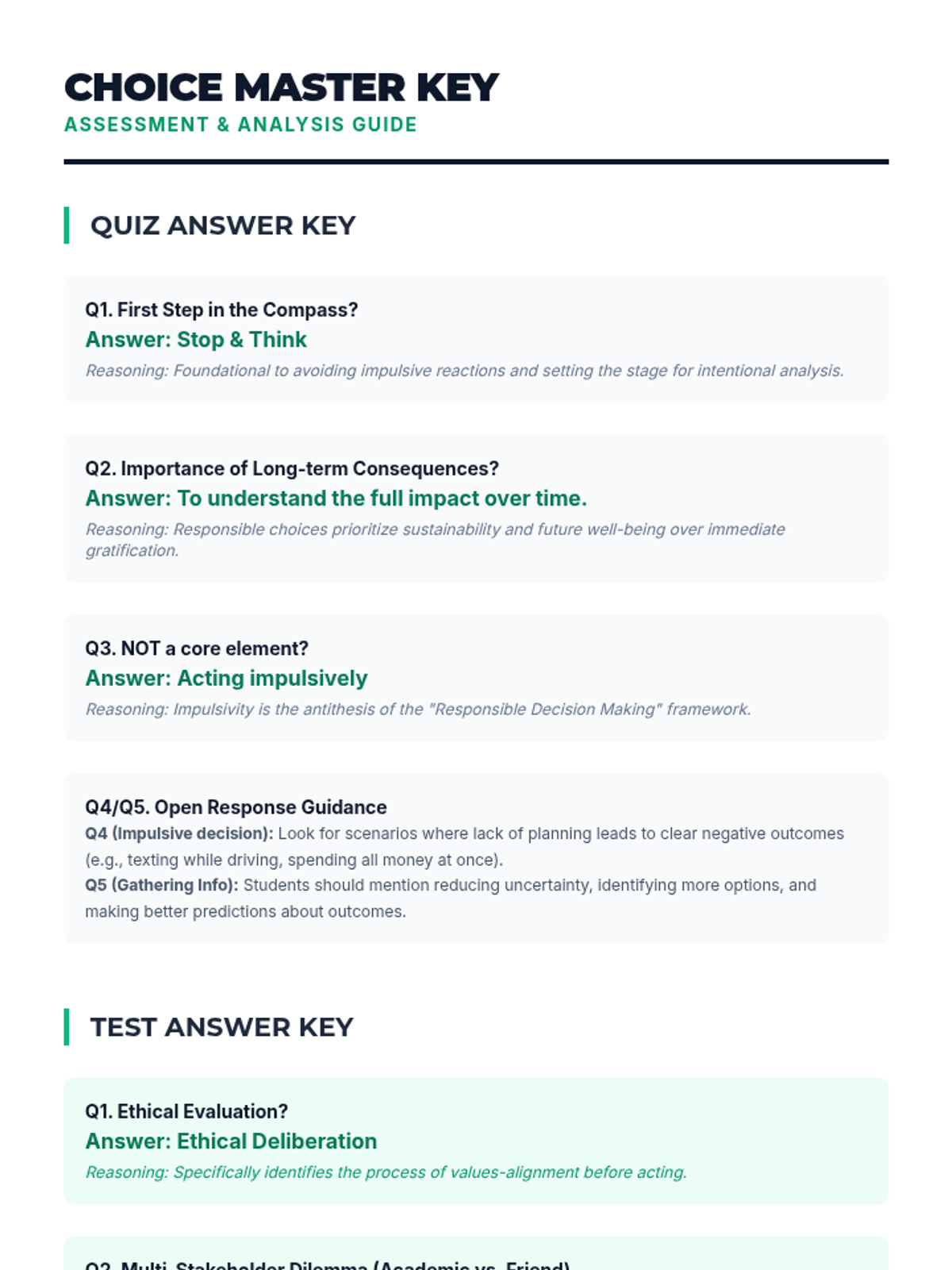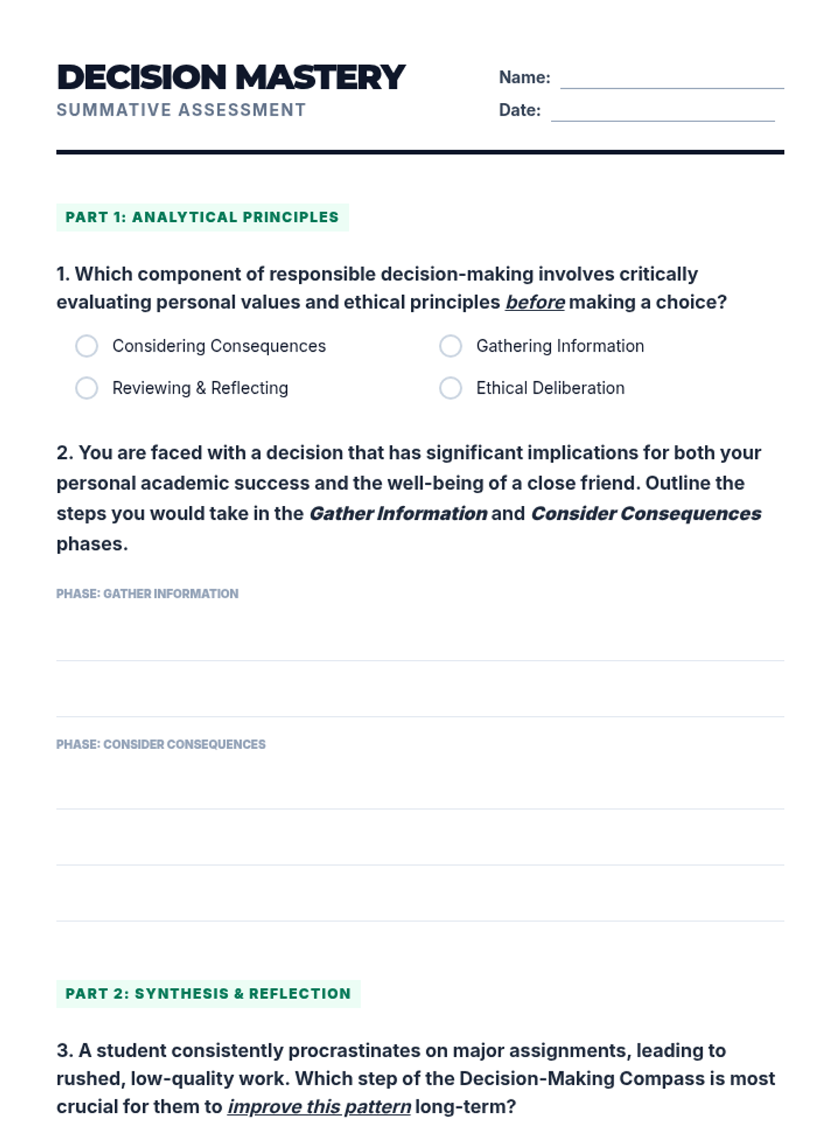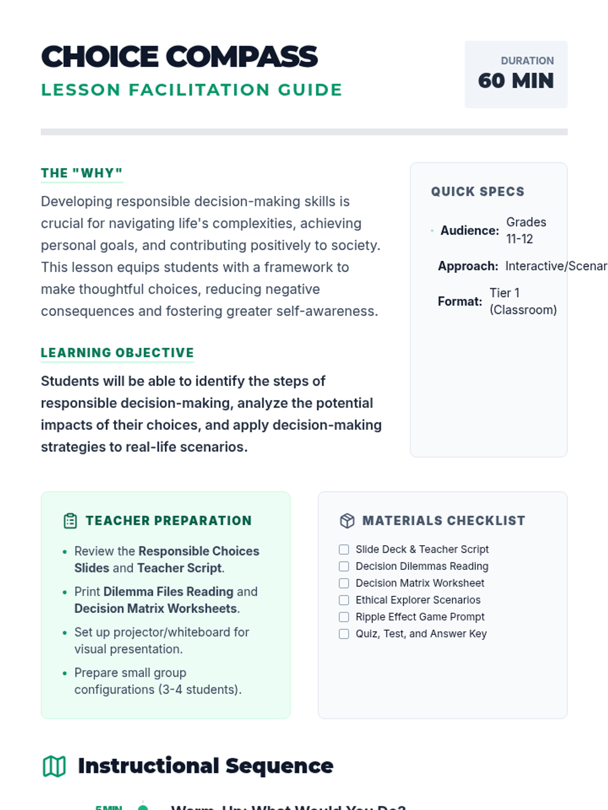 A comprehensive lesson for Grades 11-12 focused on developing responsible decision-making skills through scenario analysis, ethical deliberation, and the 'Decision-Making Compass' framework.