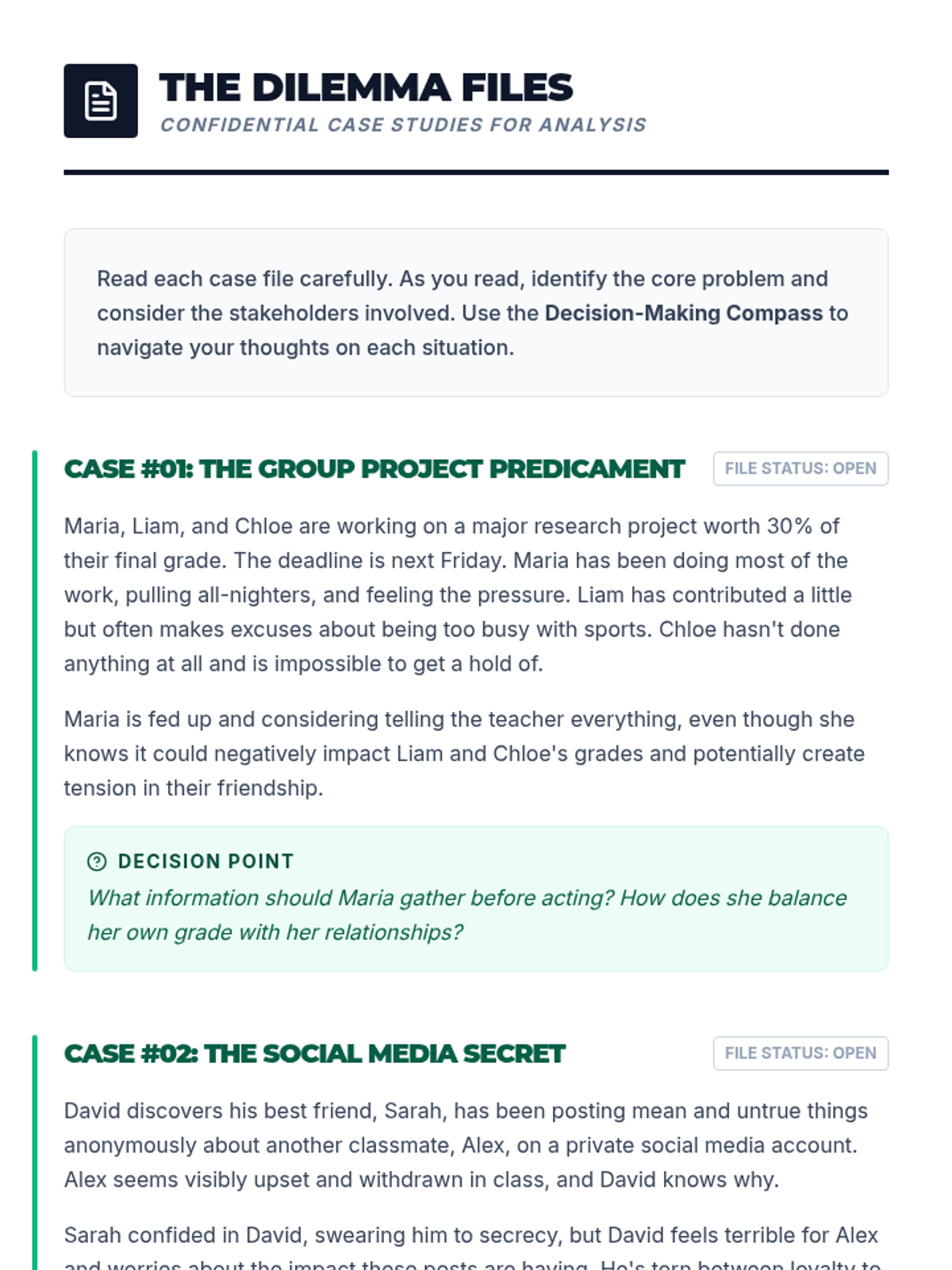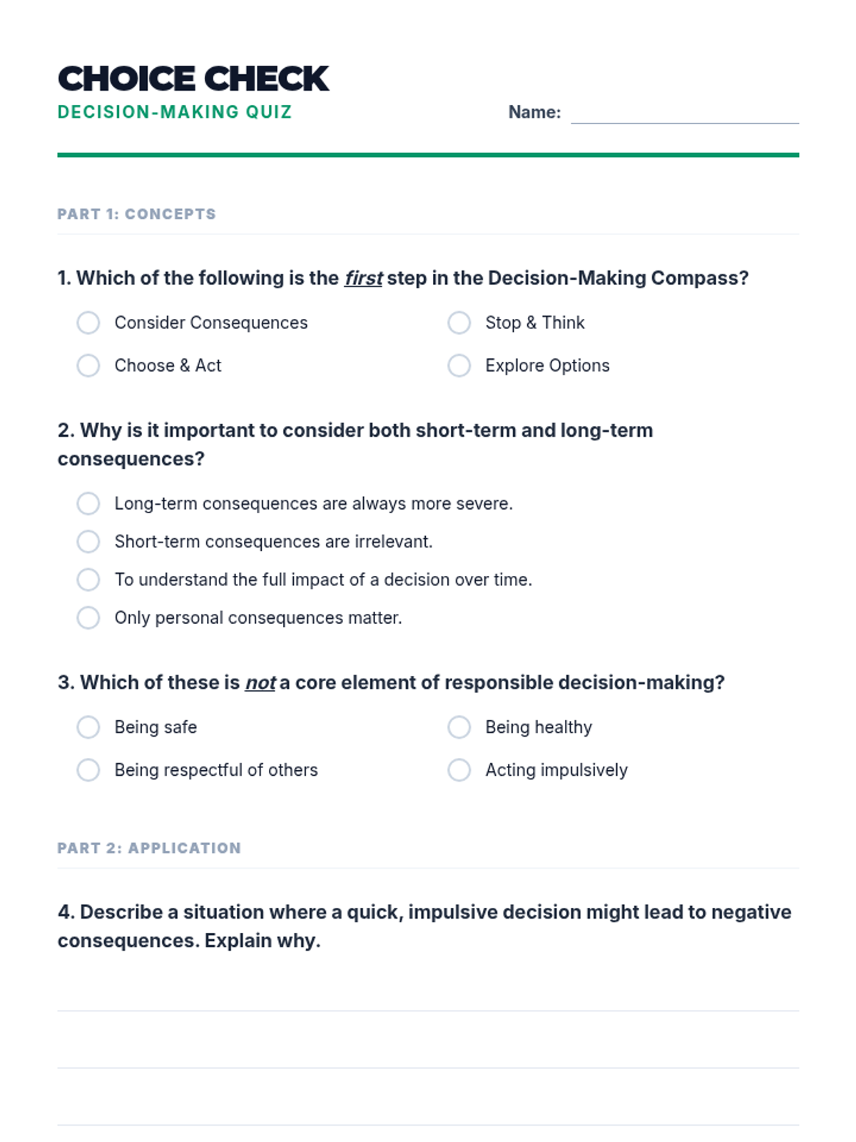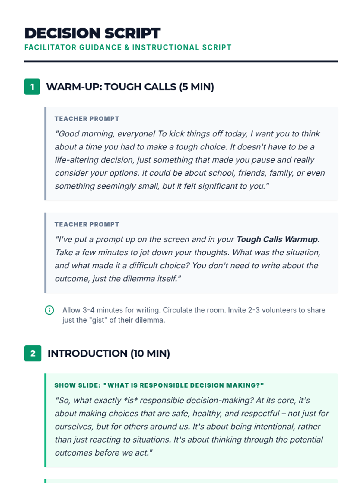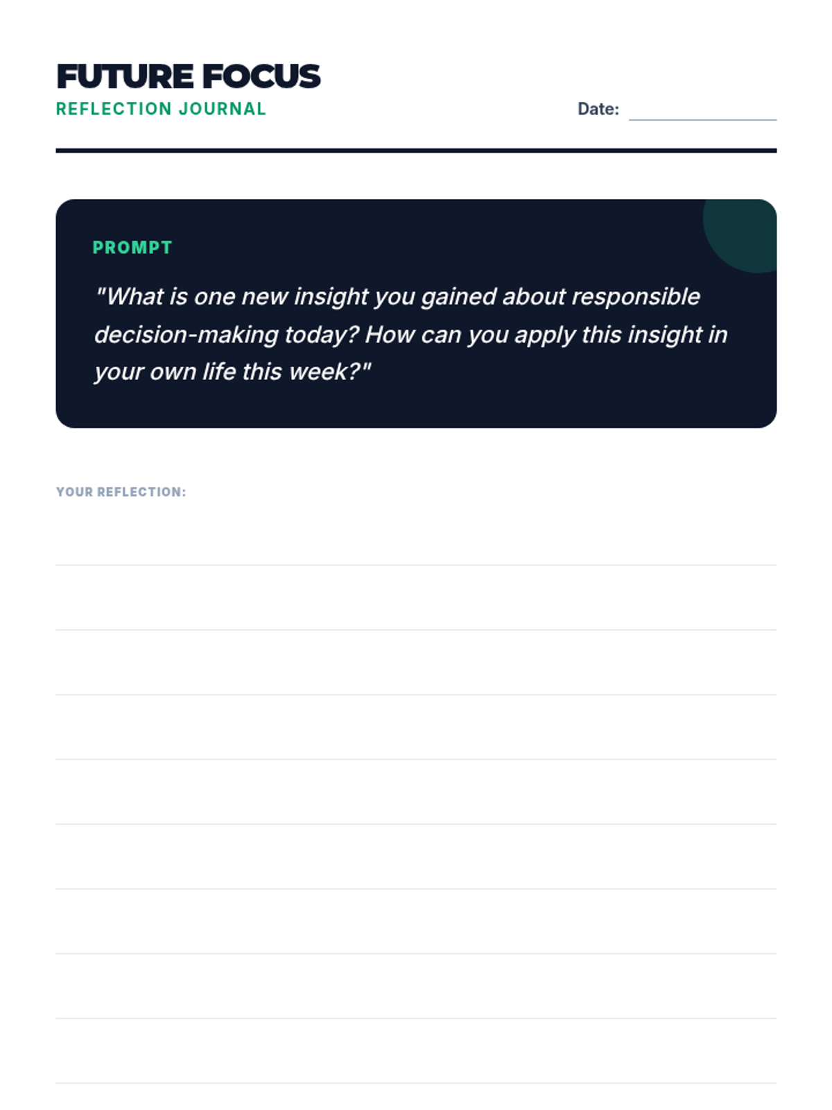A comprehensive lesson for Grades 11-12 focused on developing responsible decision-making skills through scenario analysis, ethical deliberation, and the 'Decision-Making Compass' framework.