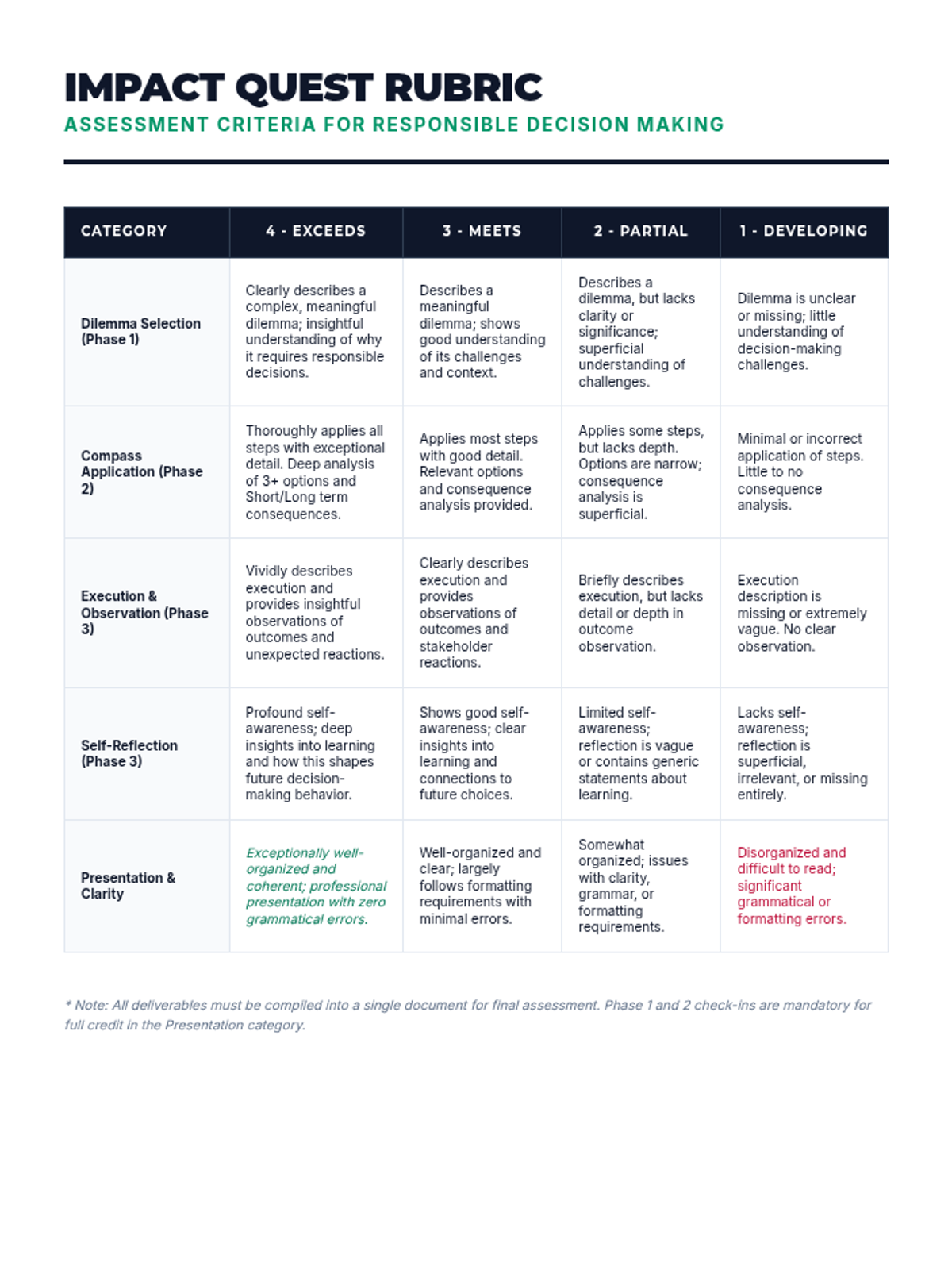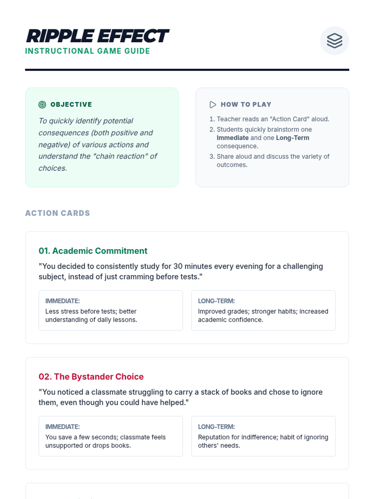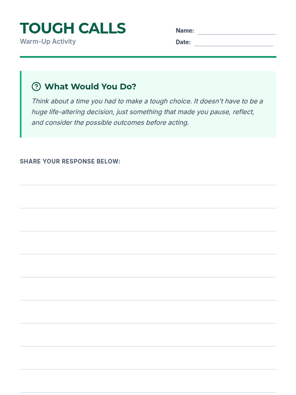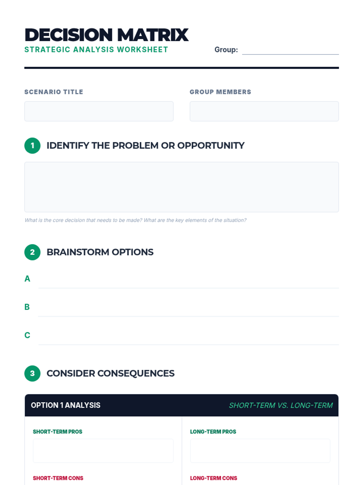 A comprehensive lesson for Grades 11-12 focused on developing responsible decision-making skills through scenario analysis, ethical deliberation, and the 'Decision-Making Compass' framework.