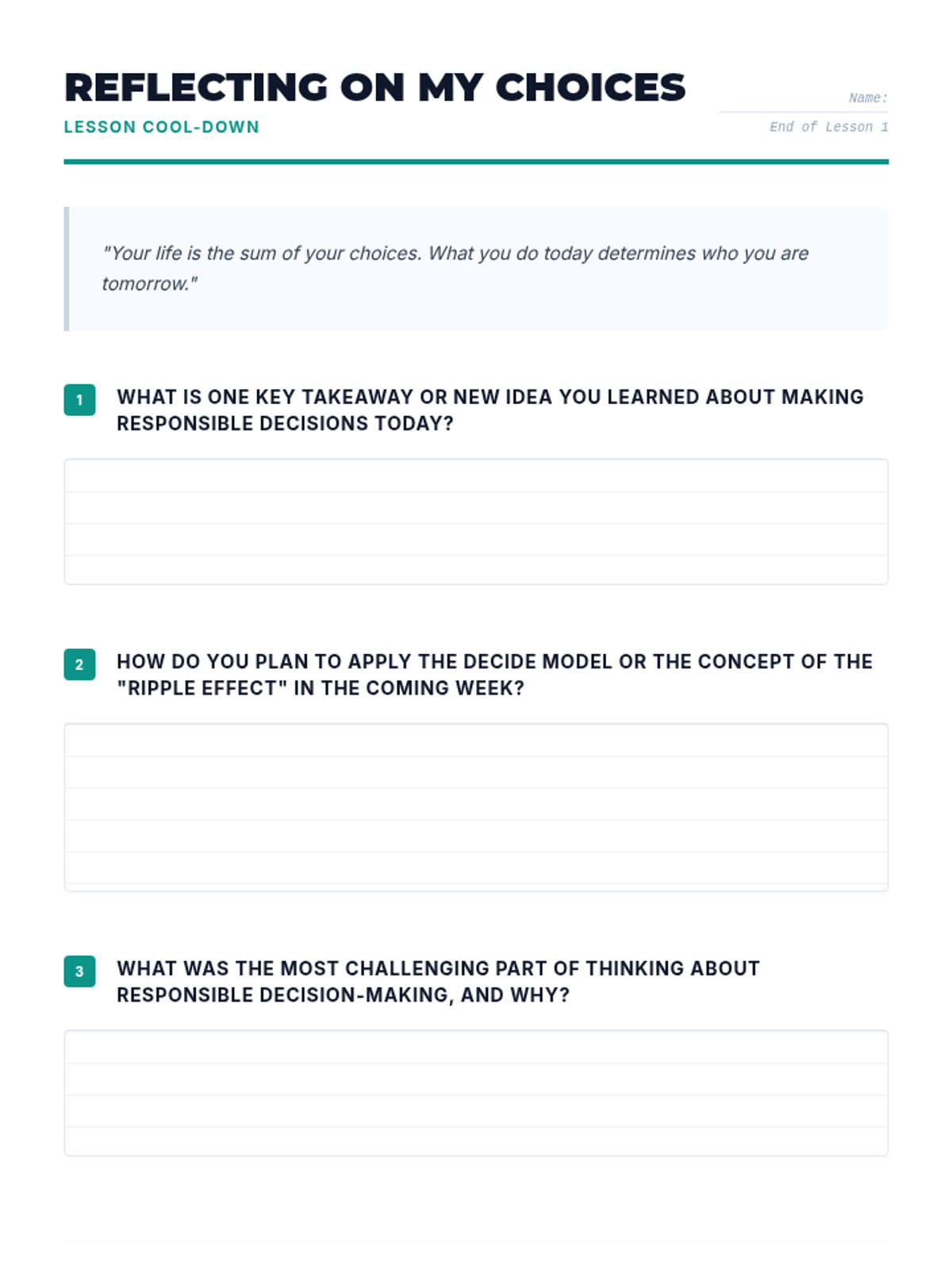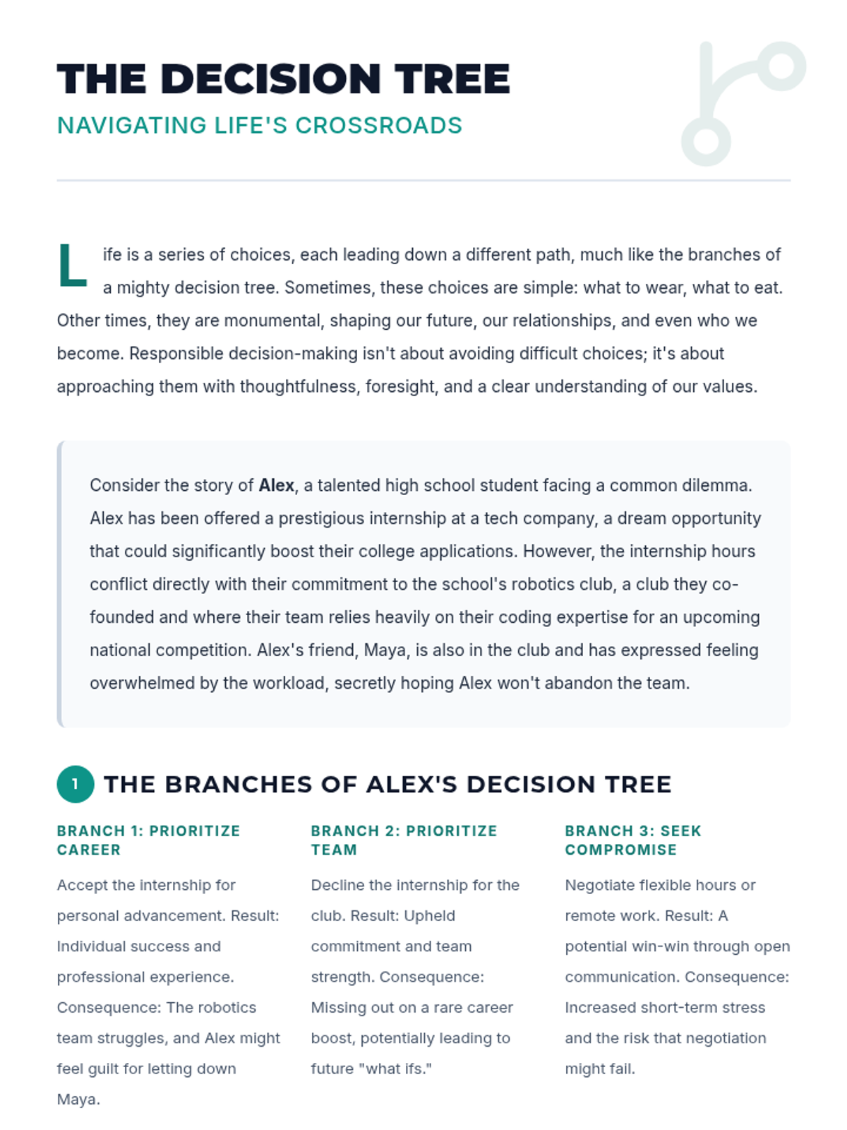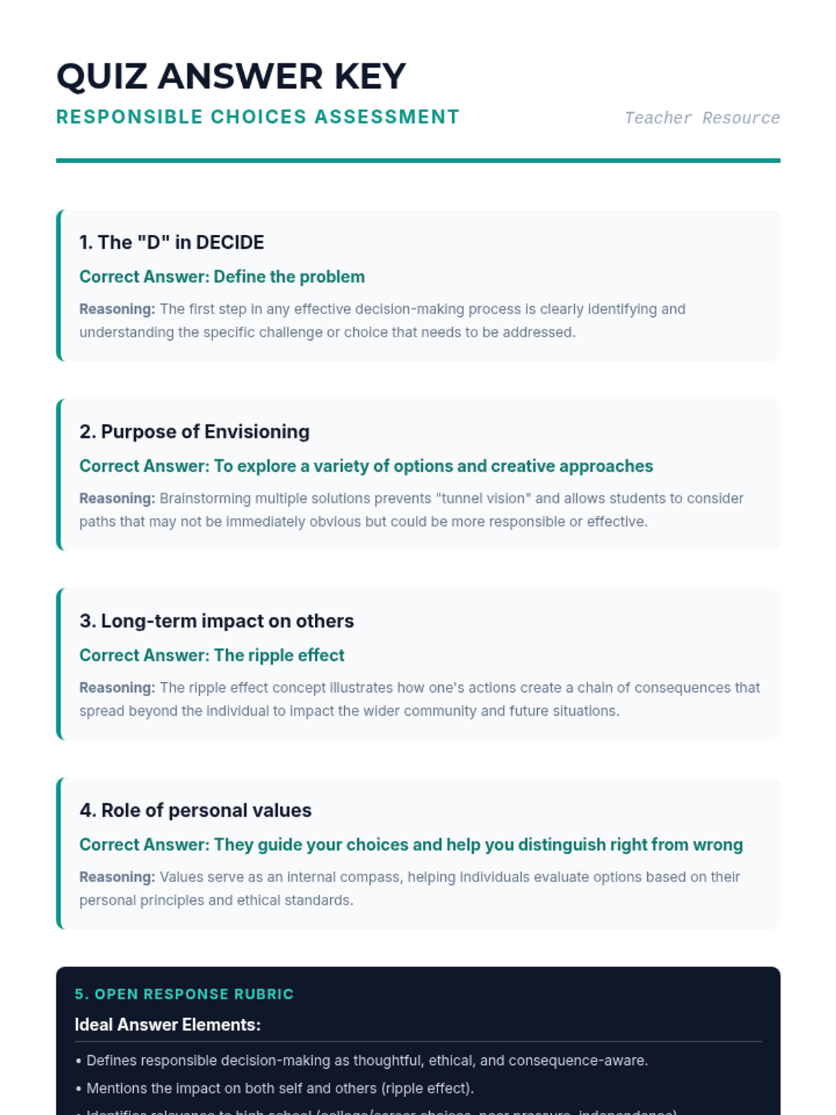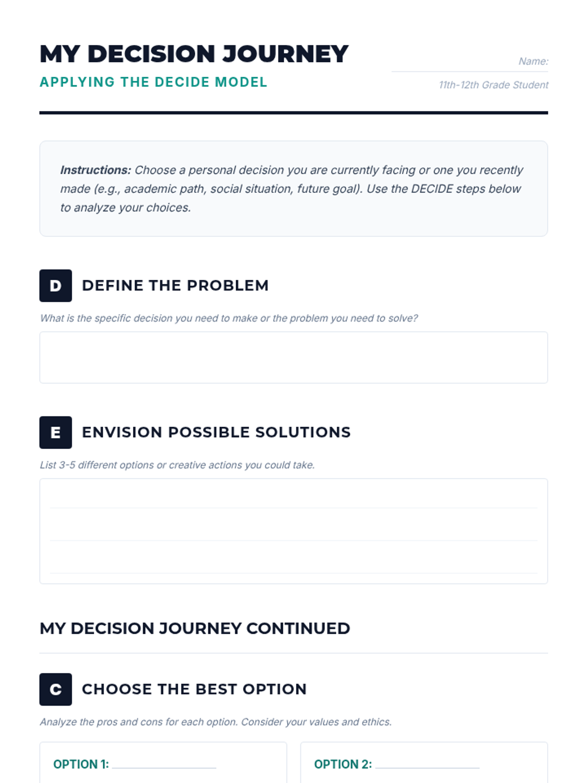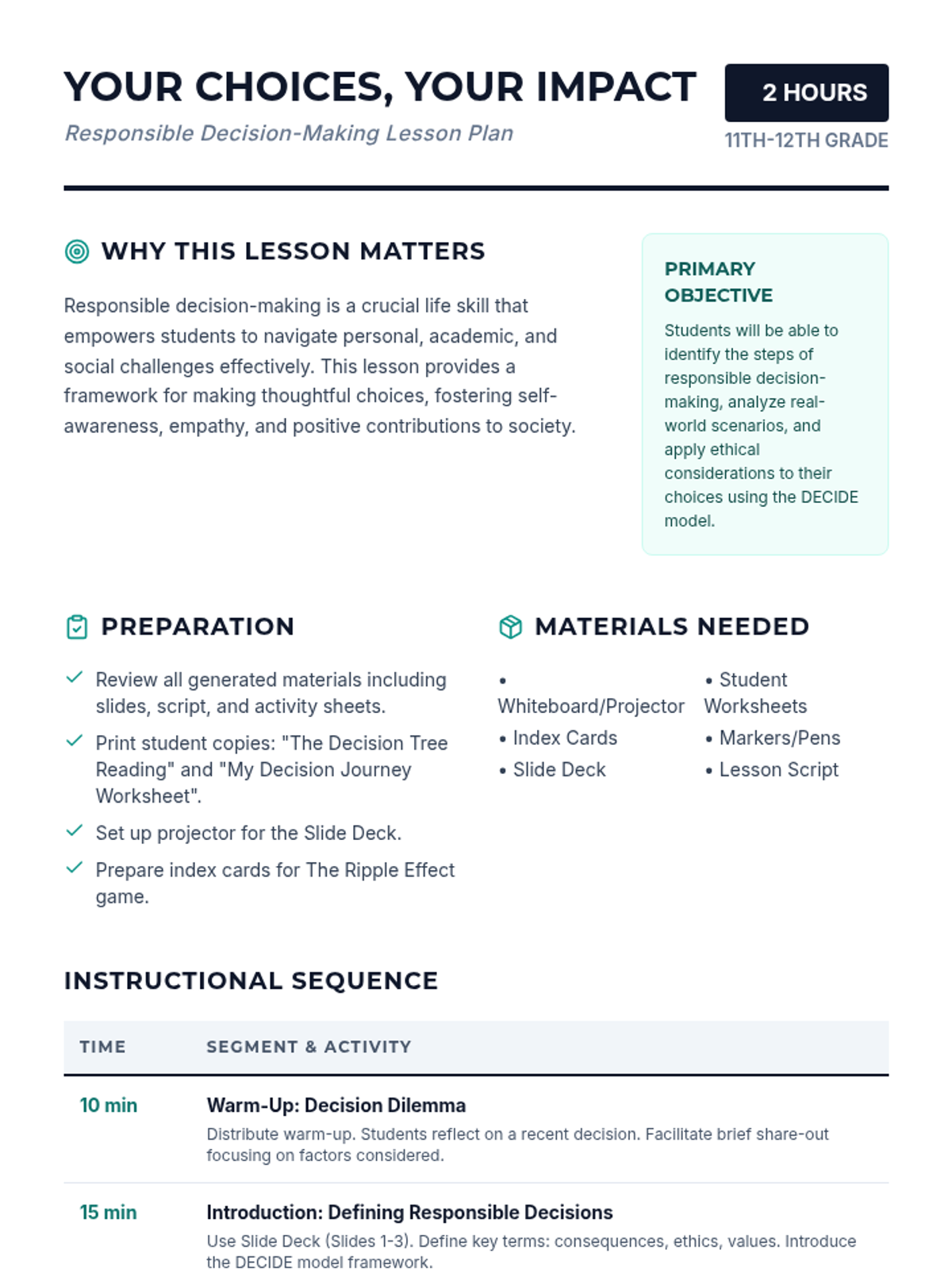 This lesson empowers 11th and 12th-grade students to understand and apply the principles of responsible decision-making through the DECIDE model, ethical analysis, and real-world application.